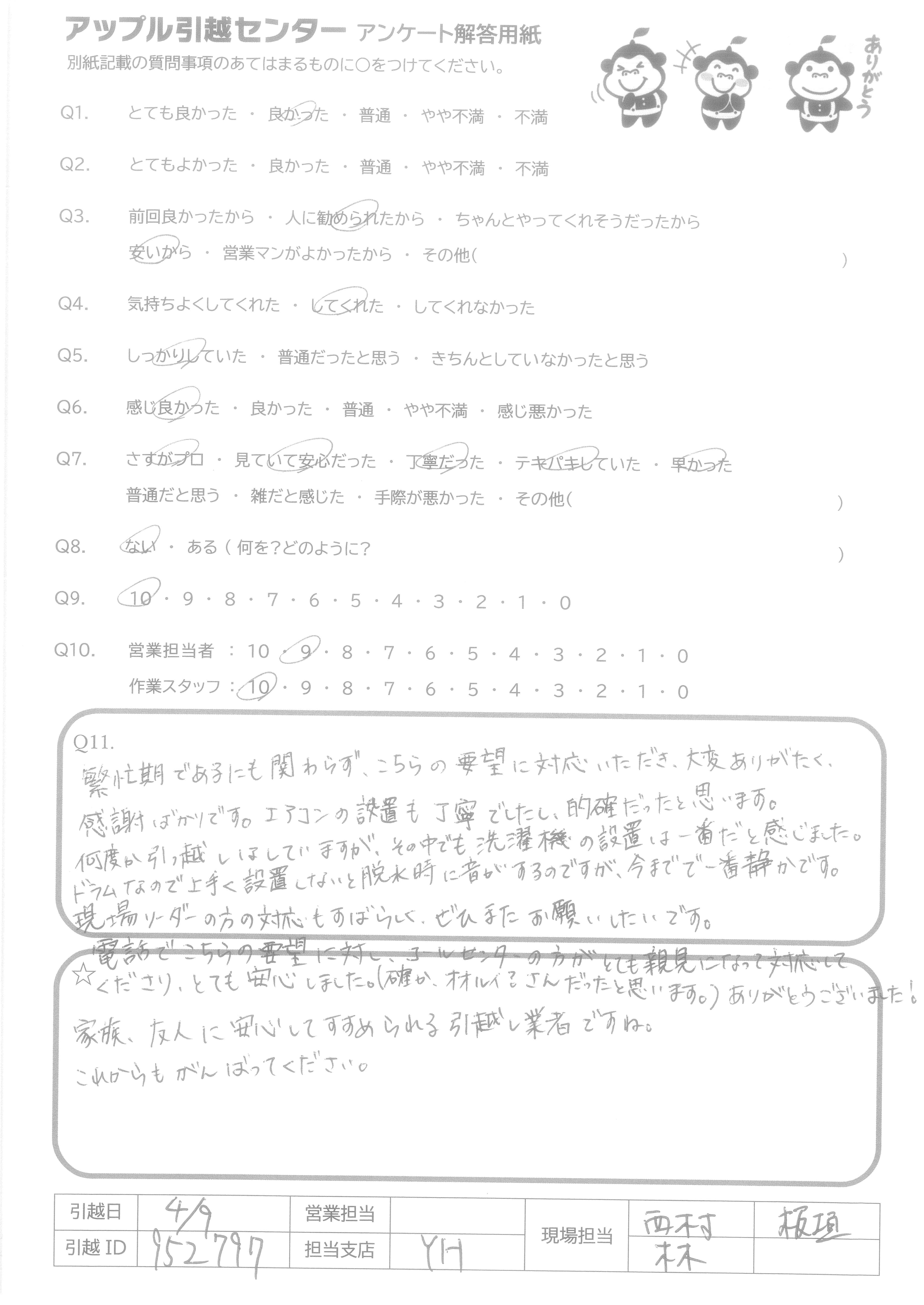 A.引越し作業のスタッフのみなさん感謝しております。ありがとうございました。