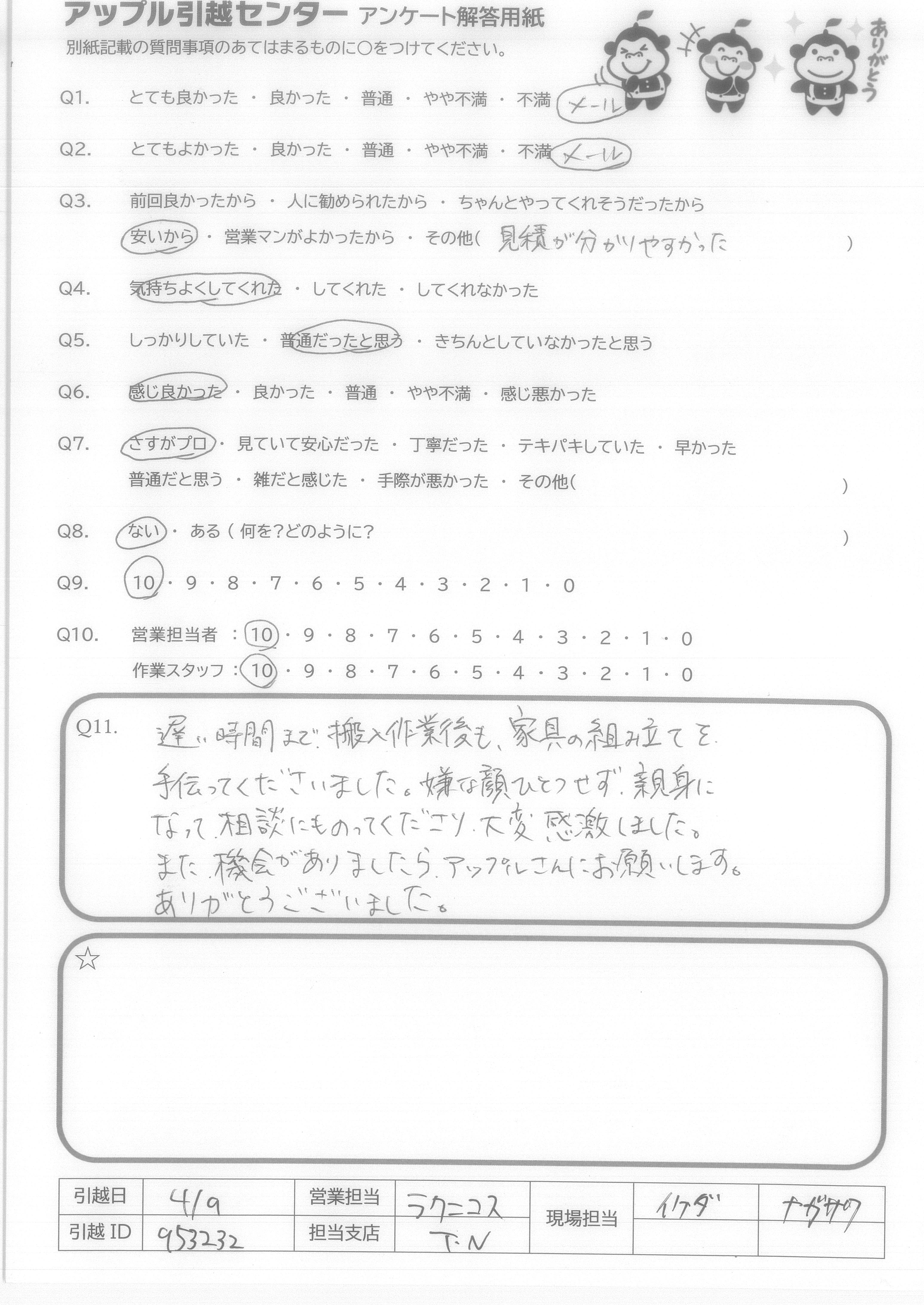 A.遅い時間まで搬入作業後も家具の組み立てを手伝ってくださいました。 嫌な顔ひとつせず親身になって相談にものってくださり大変感激しました。 また機会がありましたら、アップルさんにお願いします。ありがとうございました。