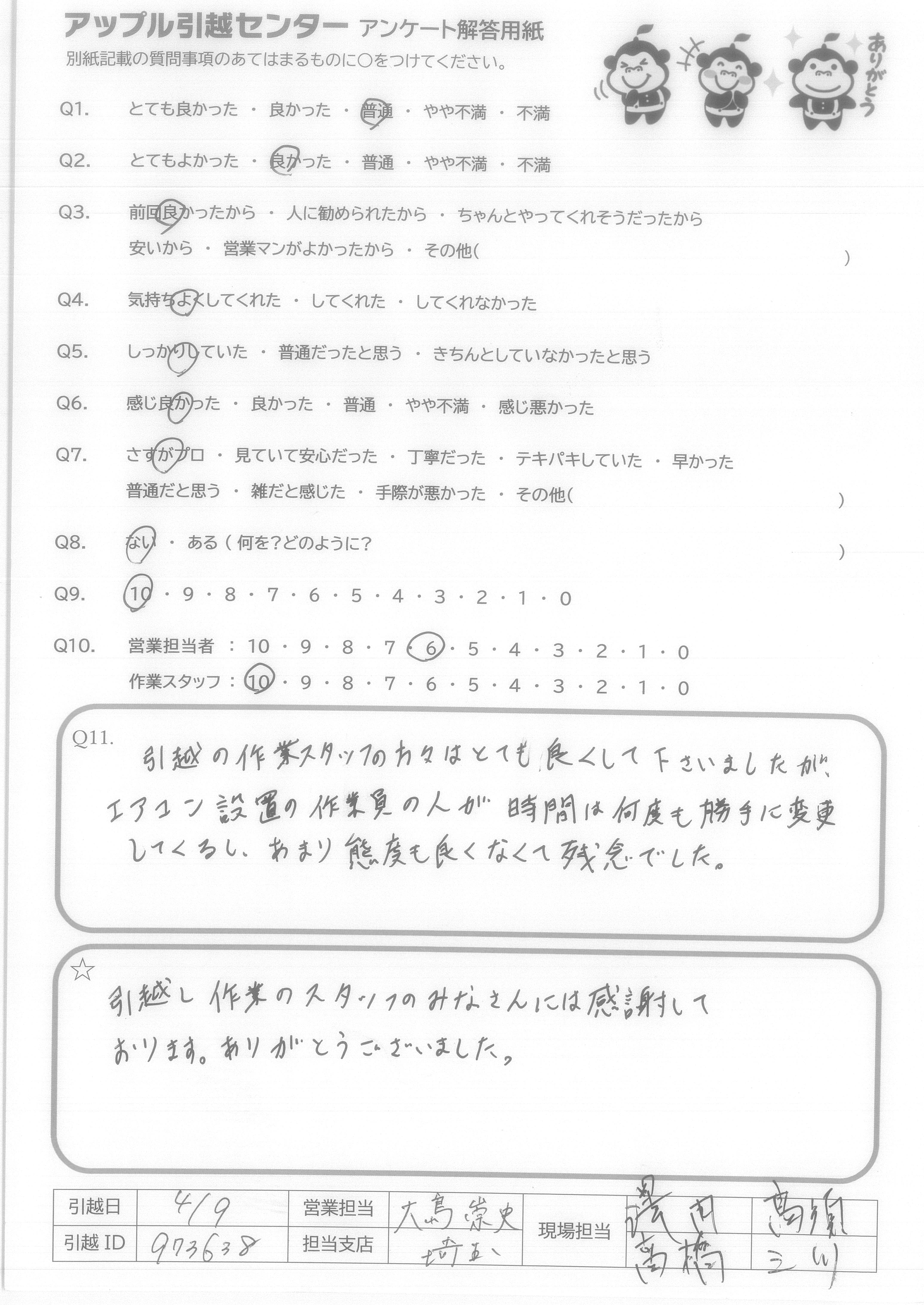 A.引越の作業スタッフの方々はとても良くして下さいましたが、 エアコン設置の作業員の人が時間は何度も勝手に変更してくるし、あまり態度も良くなくて残念でした。