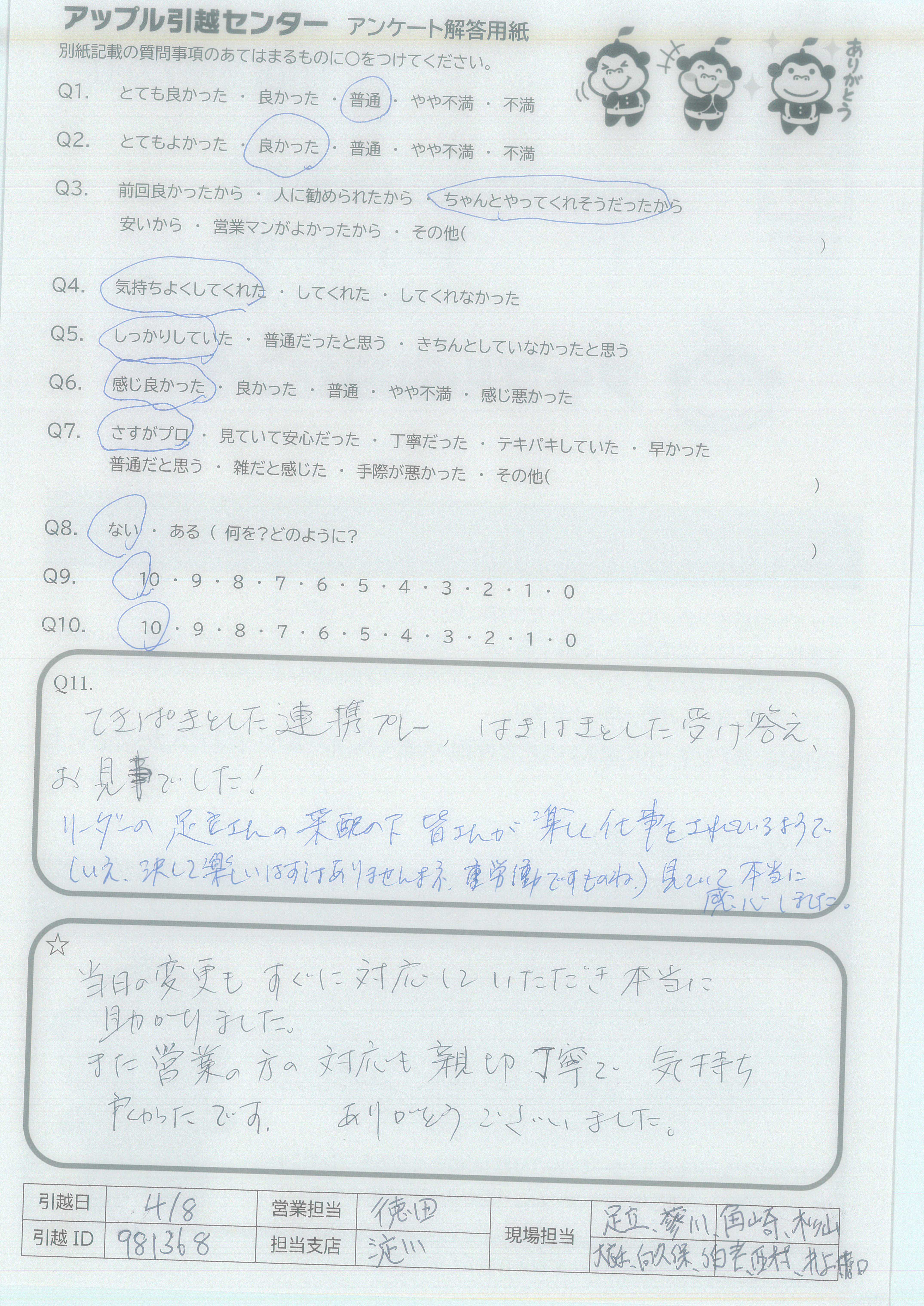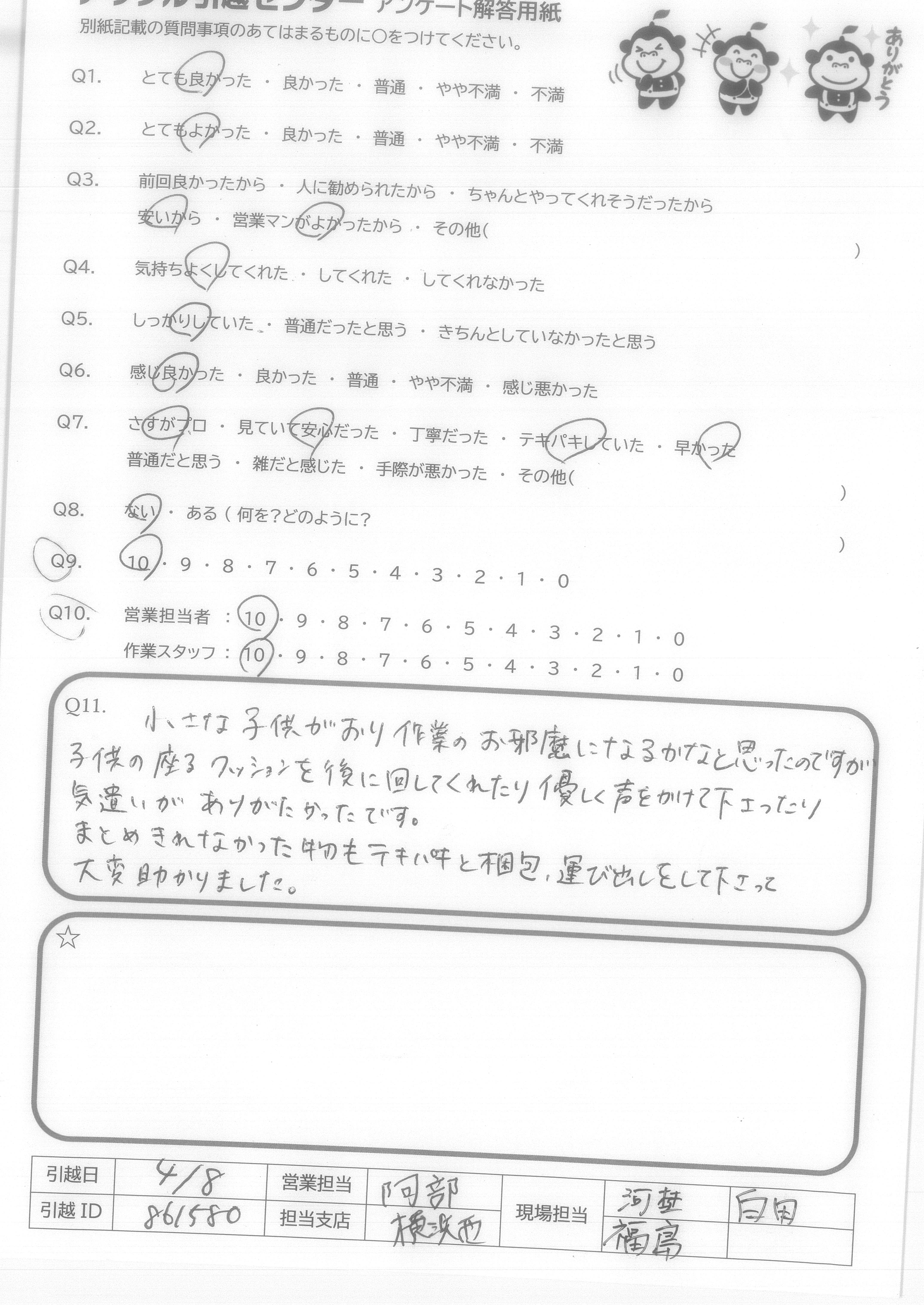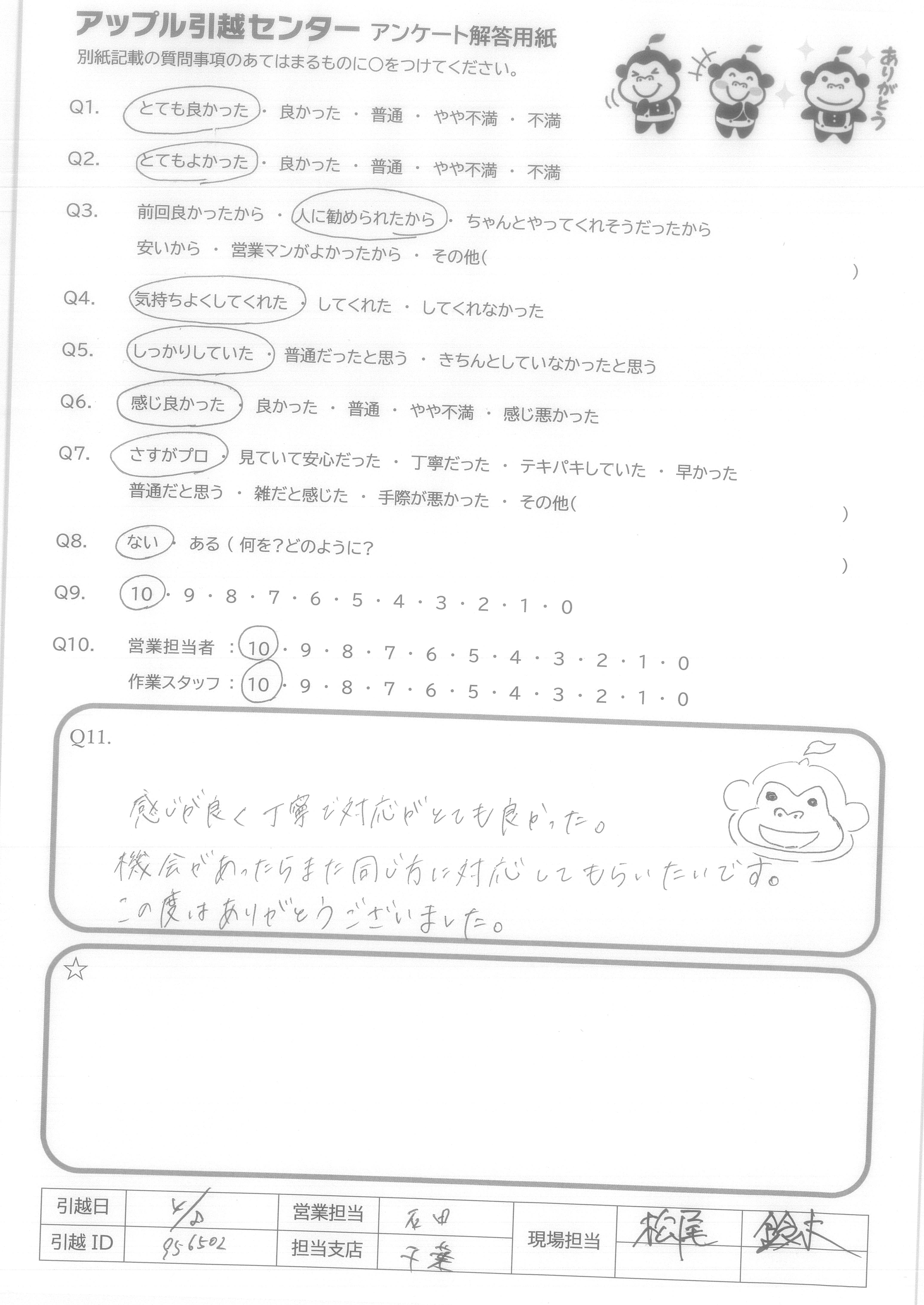 A.今までの引越し業者の中で一番印象がよく、とても気持ちよく引越しできました。ありがとうございました。