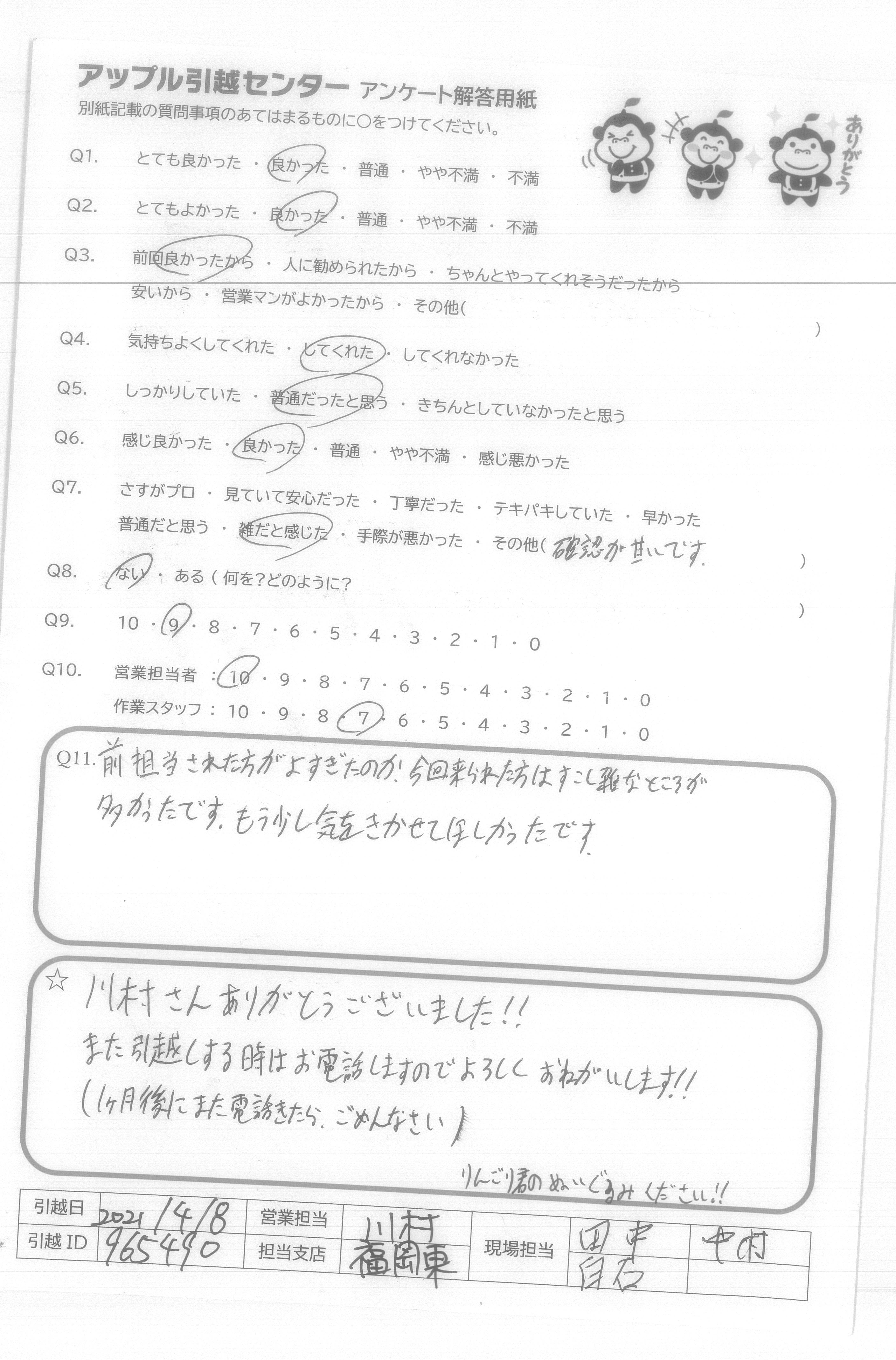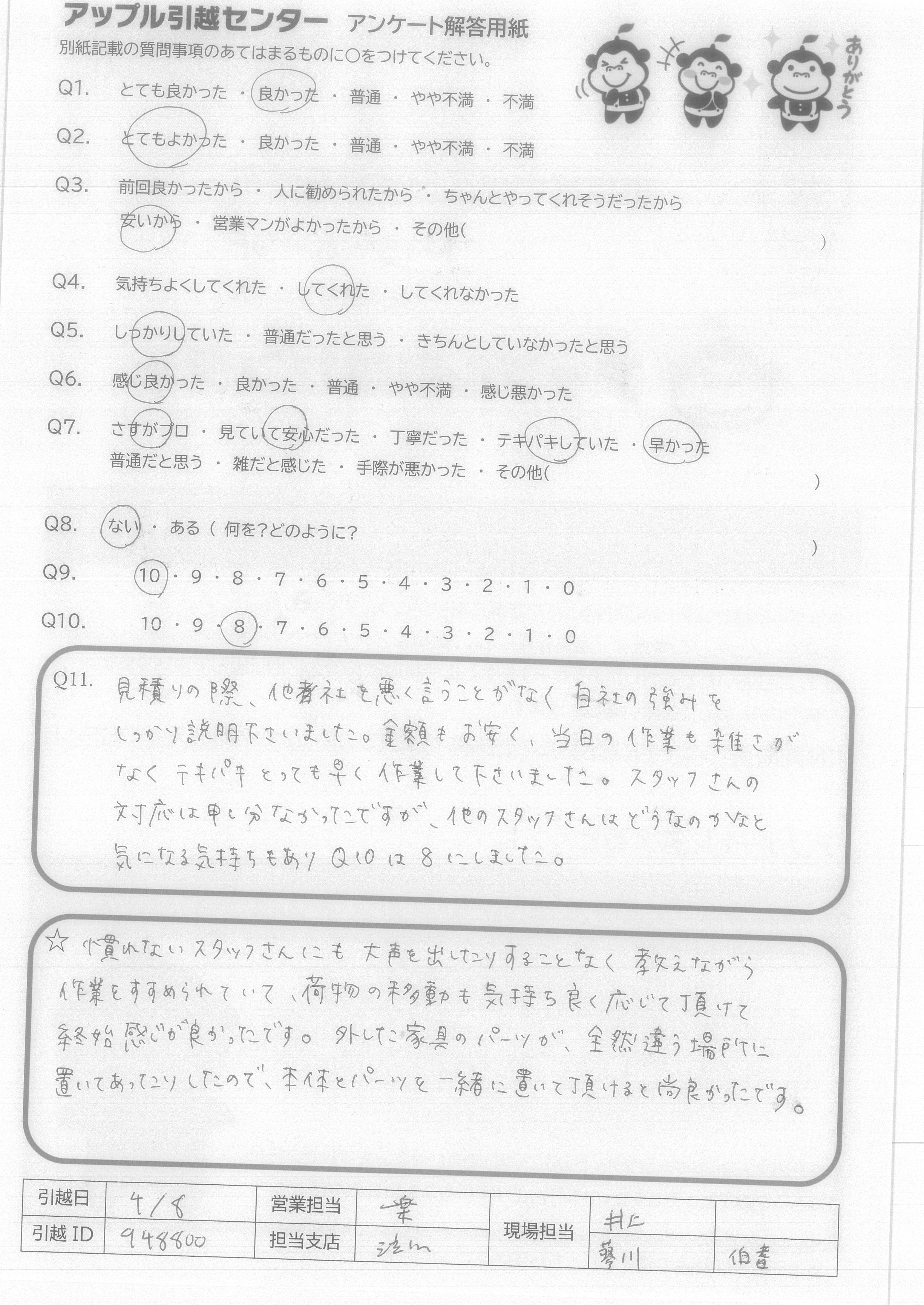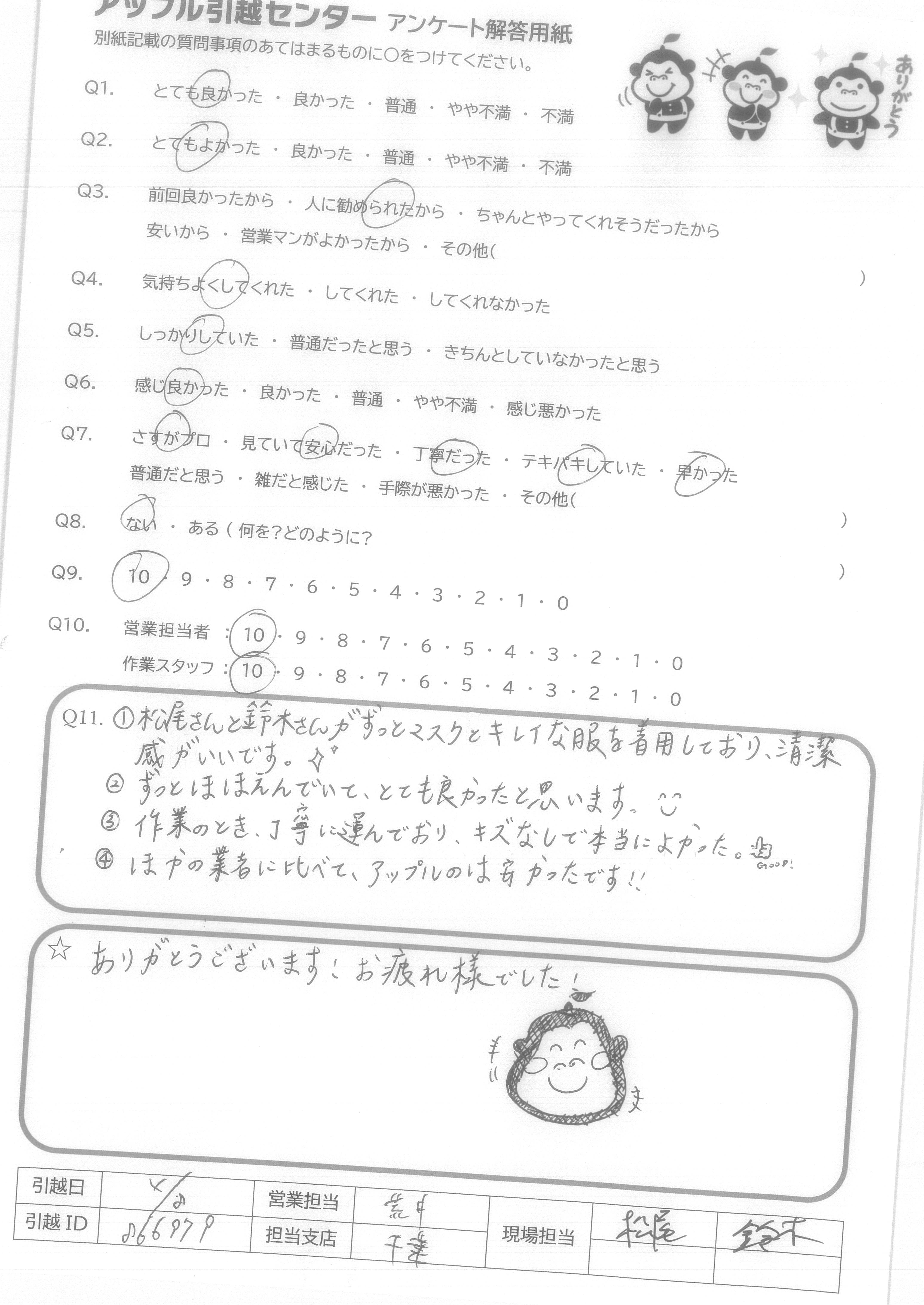 A.1 松尾さんと鈴木さんがずっとマスクとキレイな服を着用しており、清潔感がいいです。 2 ずっとほほえんでいて、とても良かったと思います。 3 作業のとき、丁寧に運んでおり、キズなしで本当によかった。 4 ほかの業者に比べて、アップルのは安かったです!!