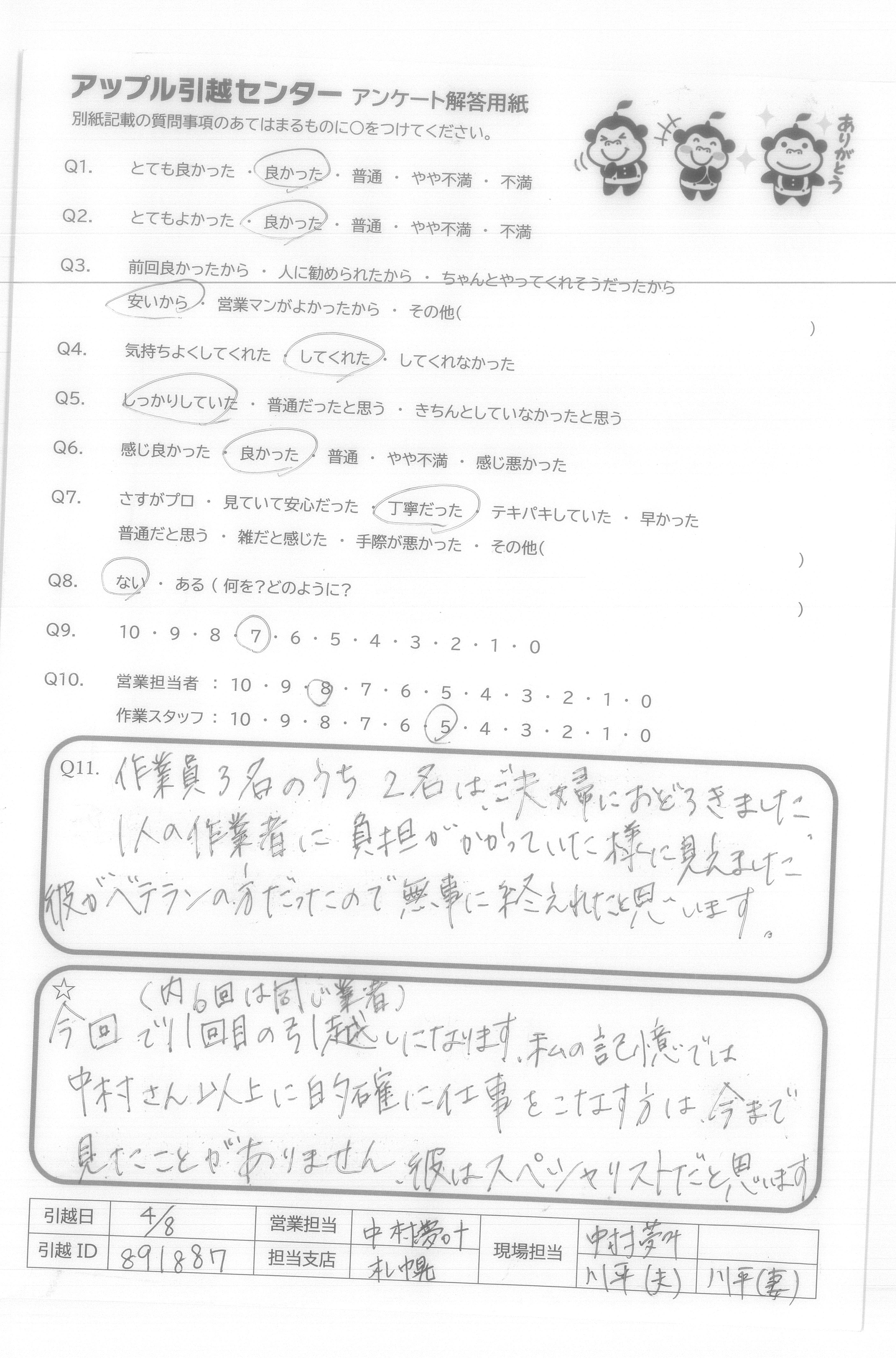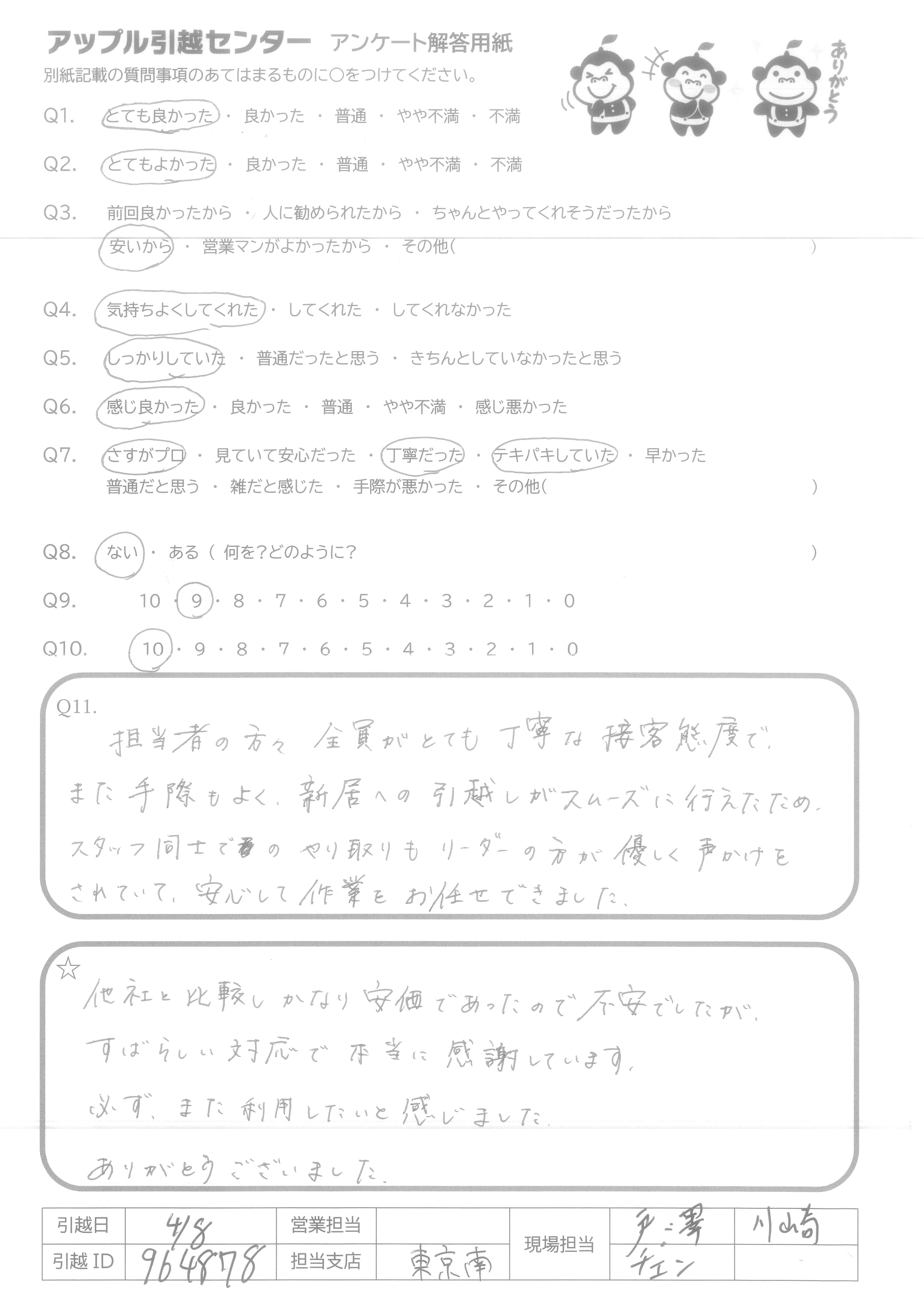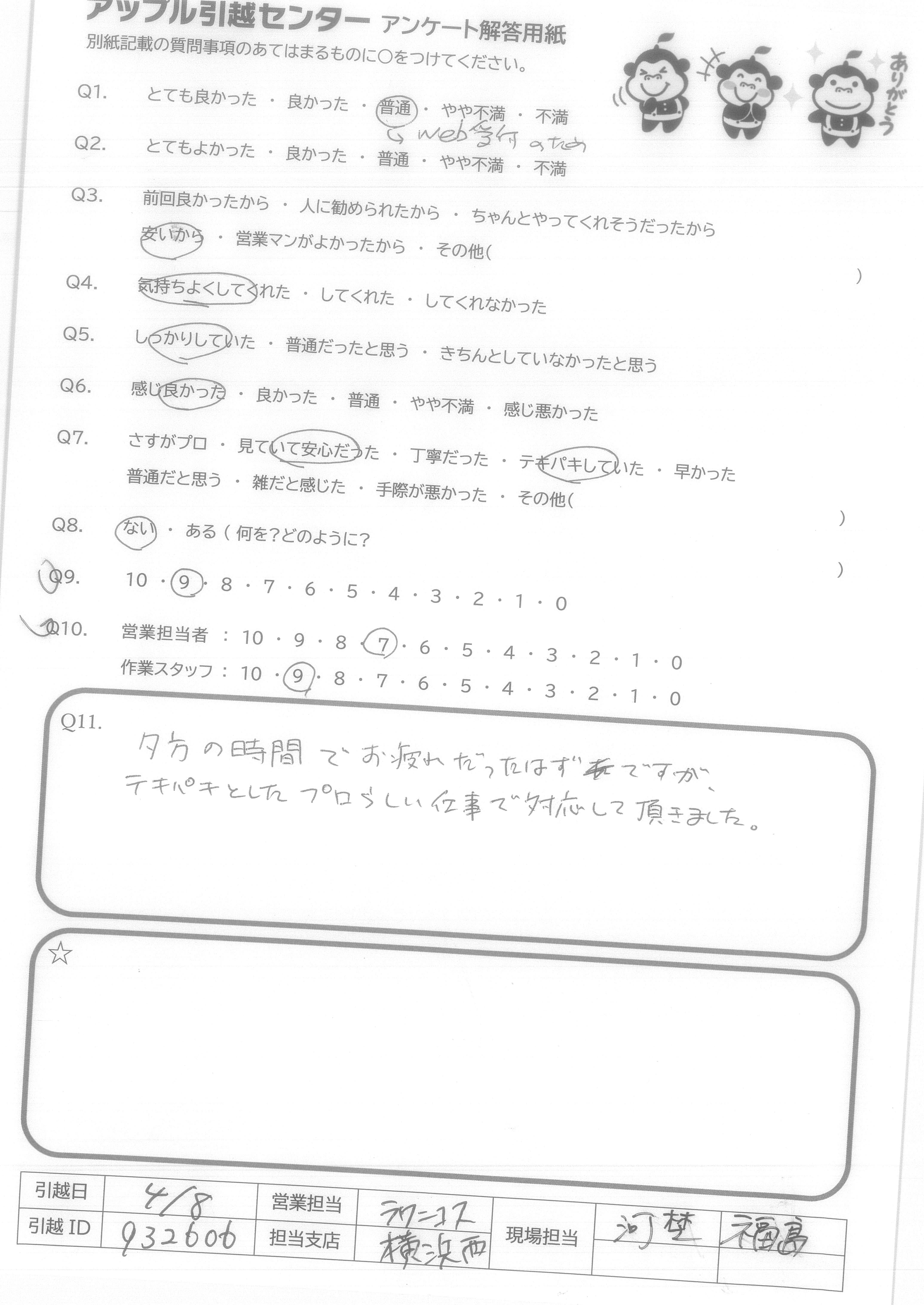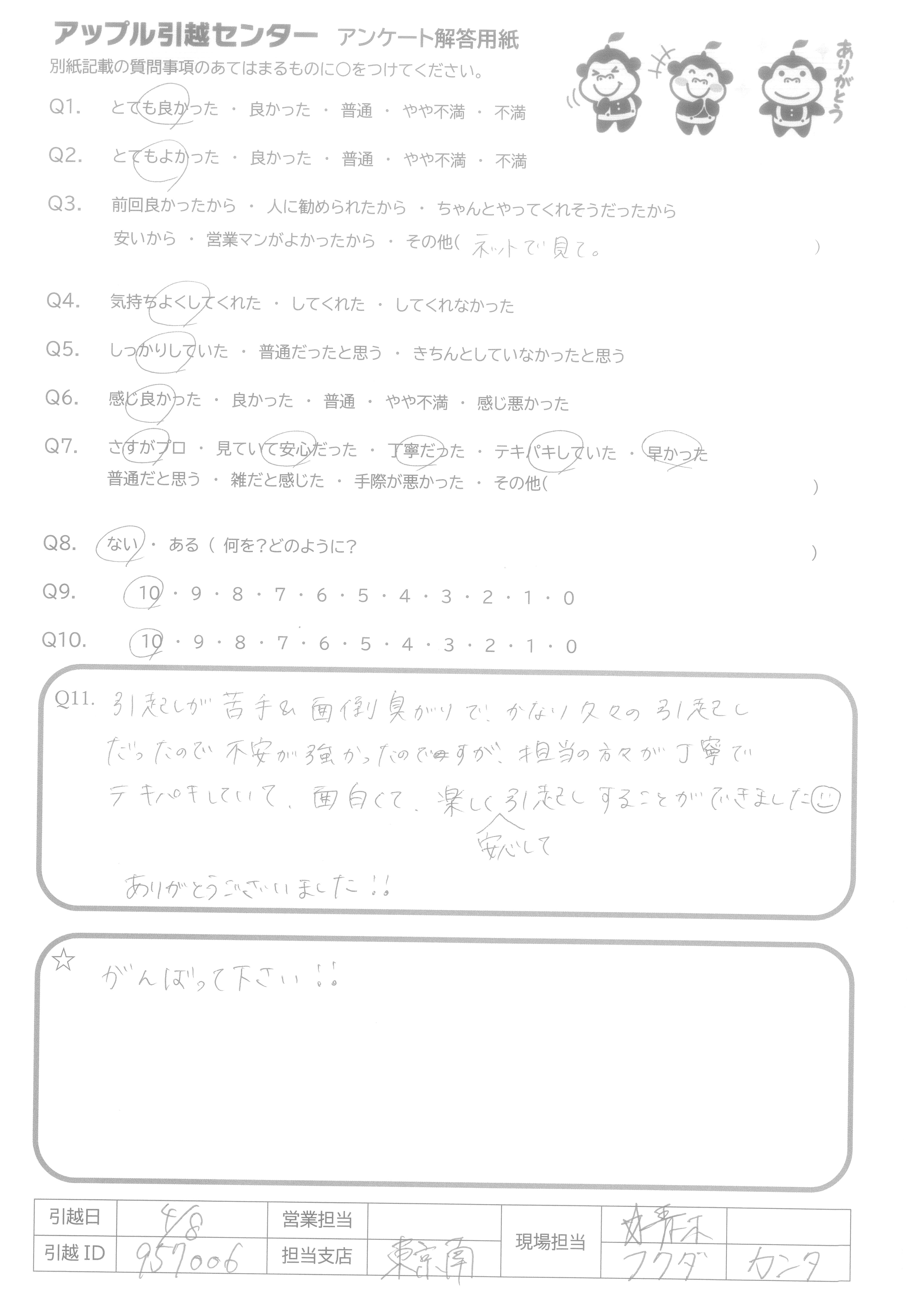 A.1 松尾さんと鈴木さんがずっとマスクとキレイな服を着用しており、清潔感がいいです。 2 ずっとほほえんでいて、とても良かったと思います。 3 作業のとき、丁寧に運んでおり、キズなしで本当によかった。 4 ほかの業者に比べて、アップルのは安かったです!!