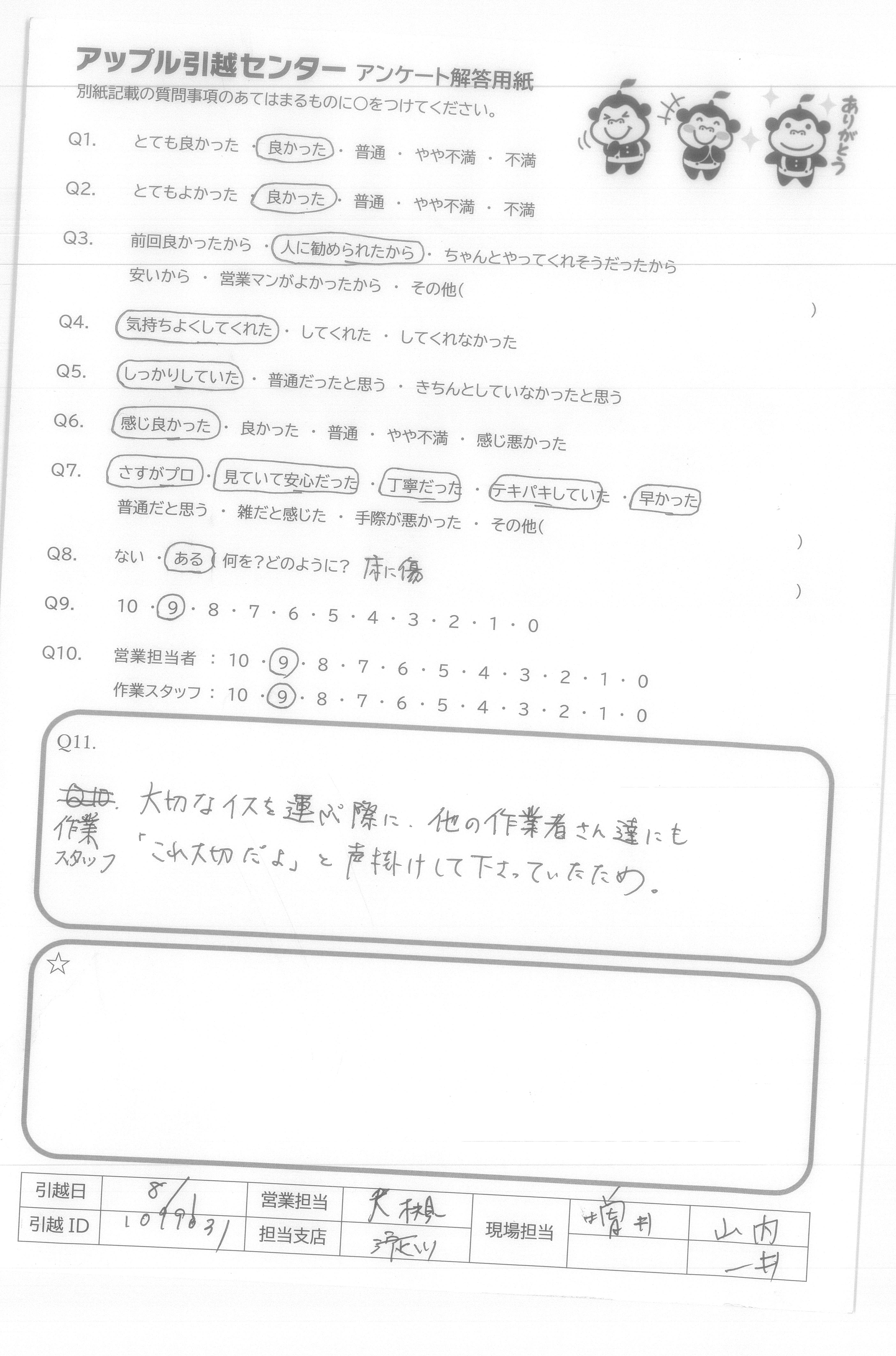 A.ごみ出しや植物の移動も引き受けてくれ助かりました。 明るくテキパキしていて、きちんと指示をあおいでもらいコミュニケーションが適切にとれていました。 提案(お互い)してスムーズに前向きに引越すことができとても感じ良かったです。ありがとうございました。
