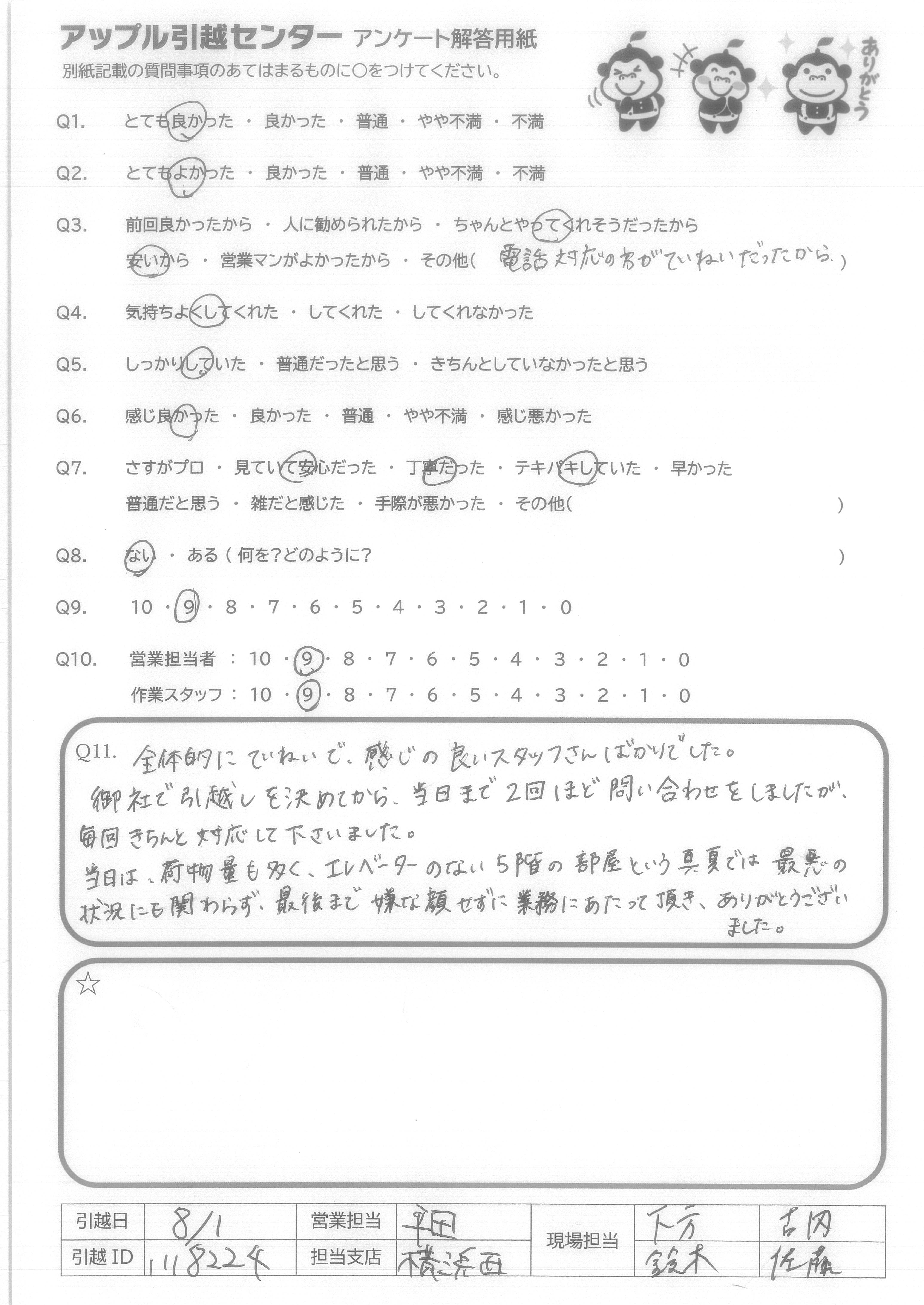 A.全体的にていねいで、感じの良いスタッフさんばかりでした。 御社で引越しを決めてから、当日まで2回ほど問い合わせをしましたが、毎回きちんと対応して下さいました。 当日は、荷物量も多く、エレベーターのない5階の部屋という真夏では最悪の状況にも関わらず、最後まで嫌な顔せずに業務にあたって頂き、ありがとうございました。