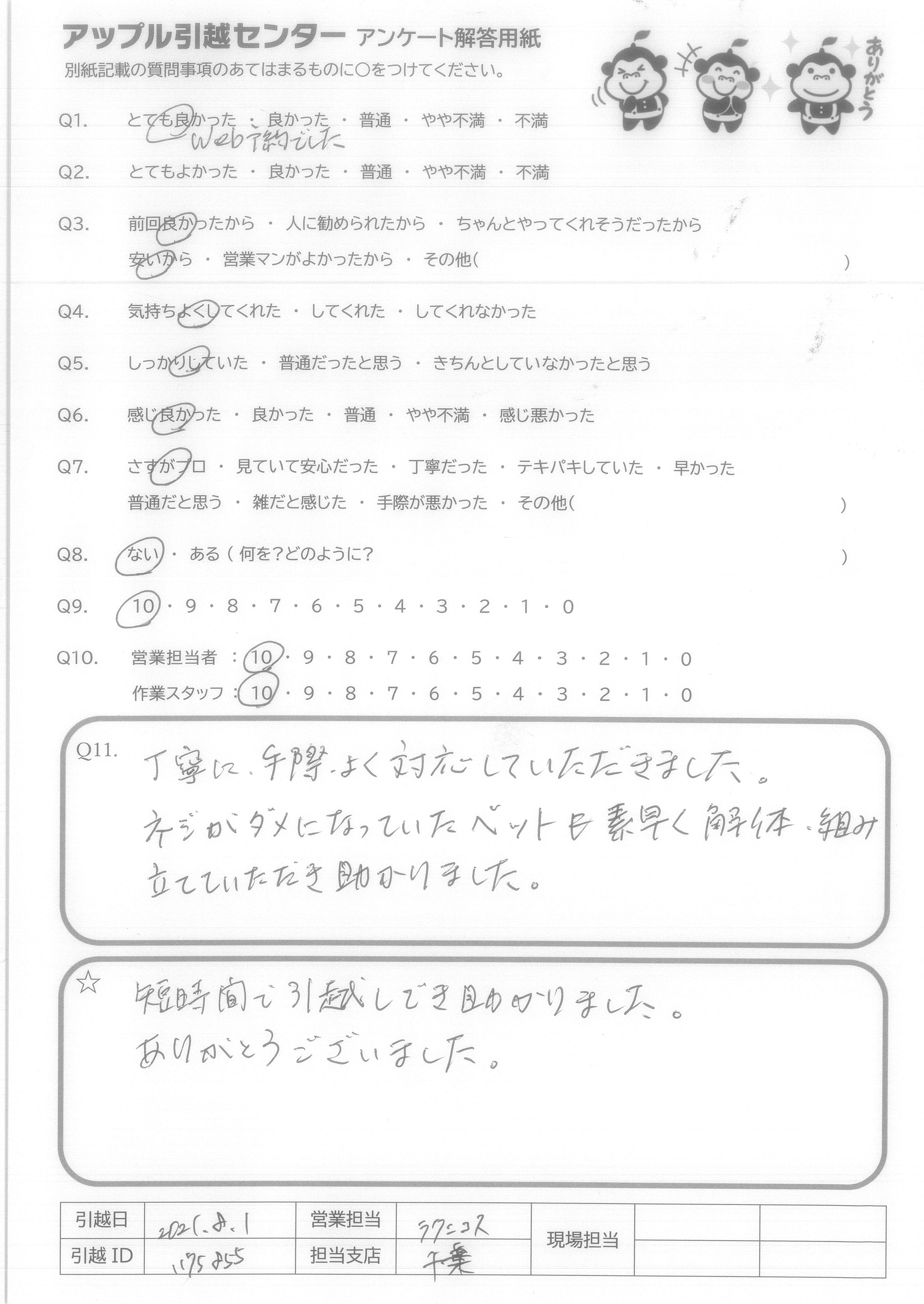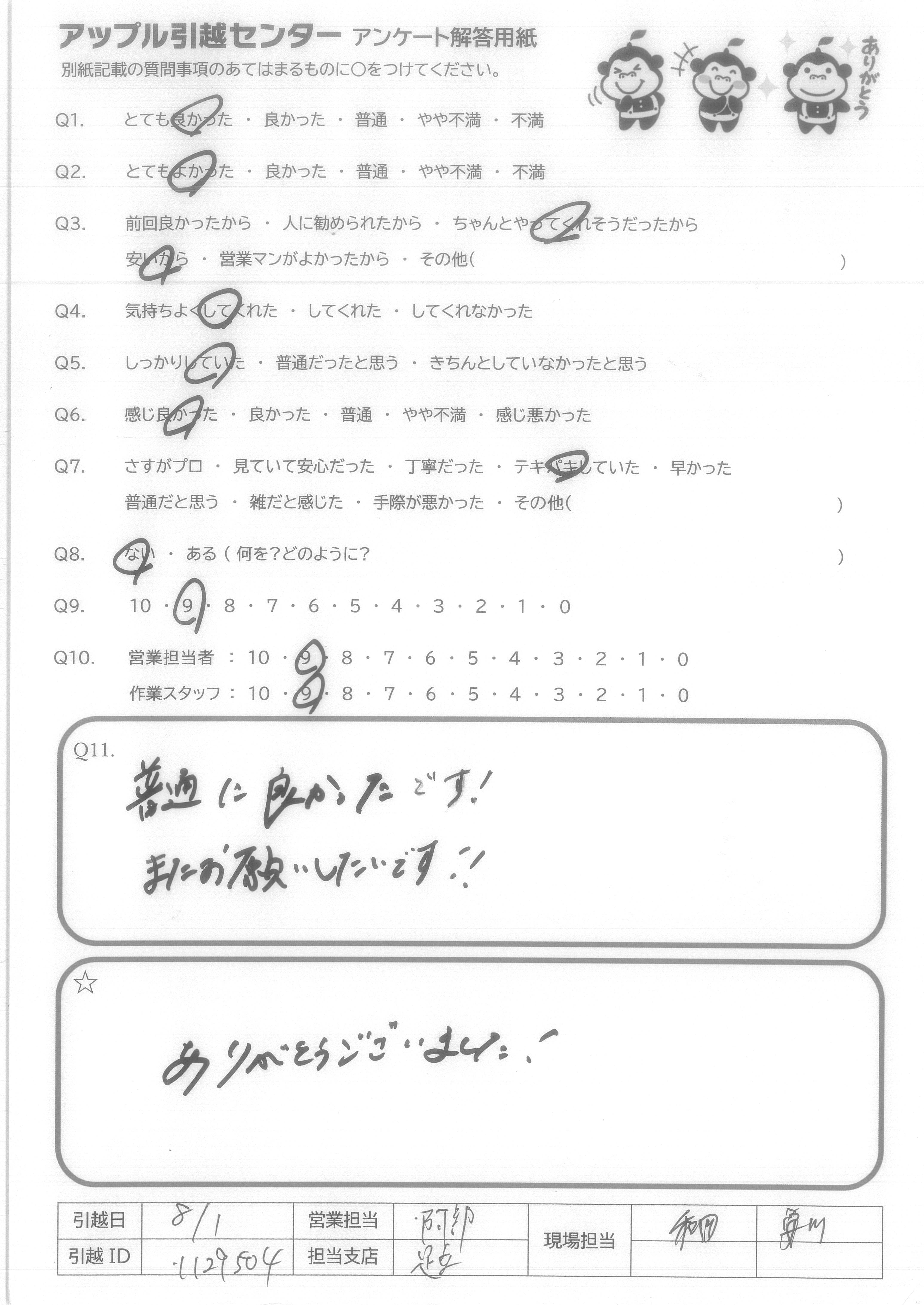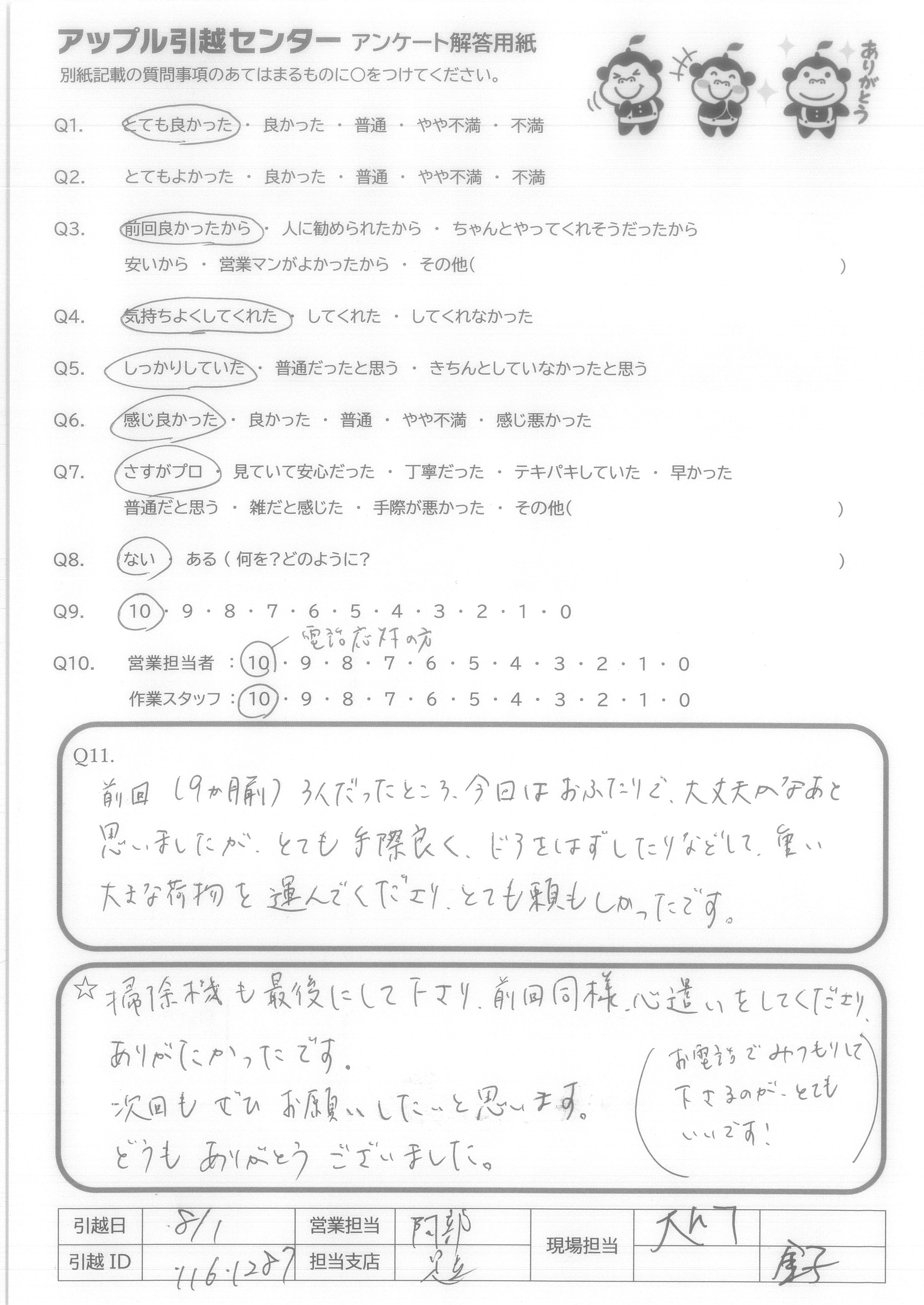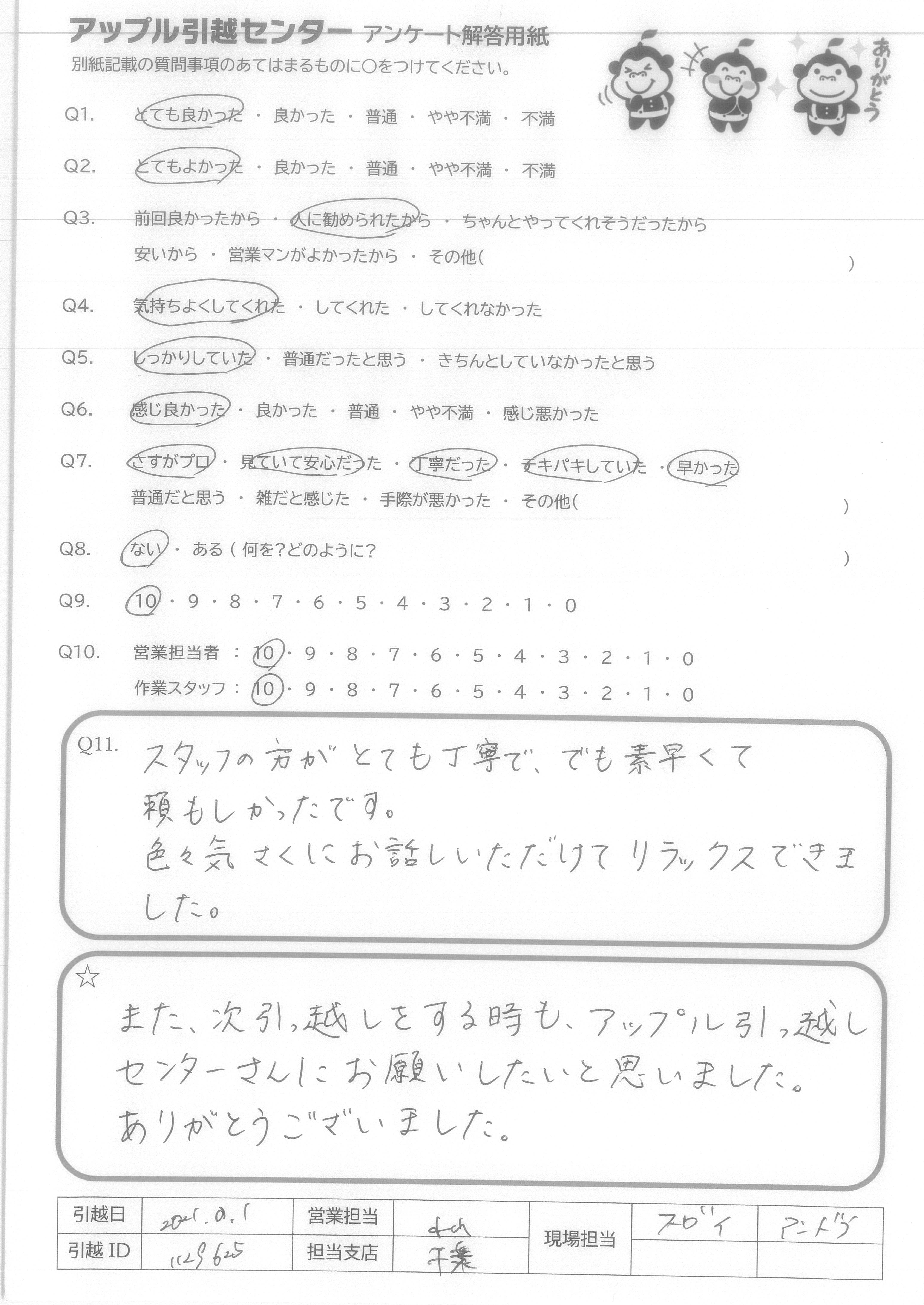 A.また、次引っ越しをする時も、アップル引っ越しセンターさんにお願いしたいと思いました。 ありがとうございました。