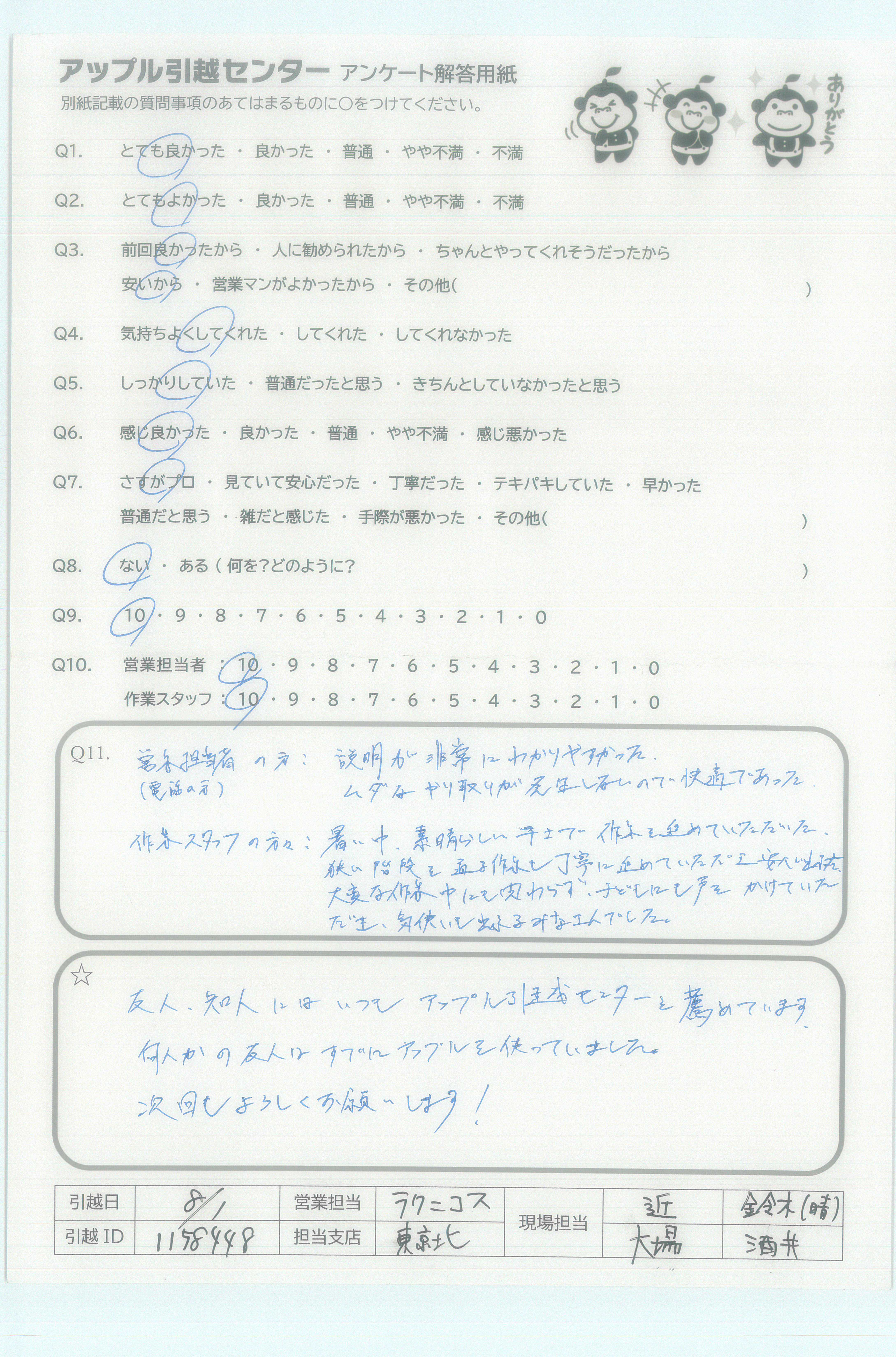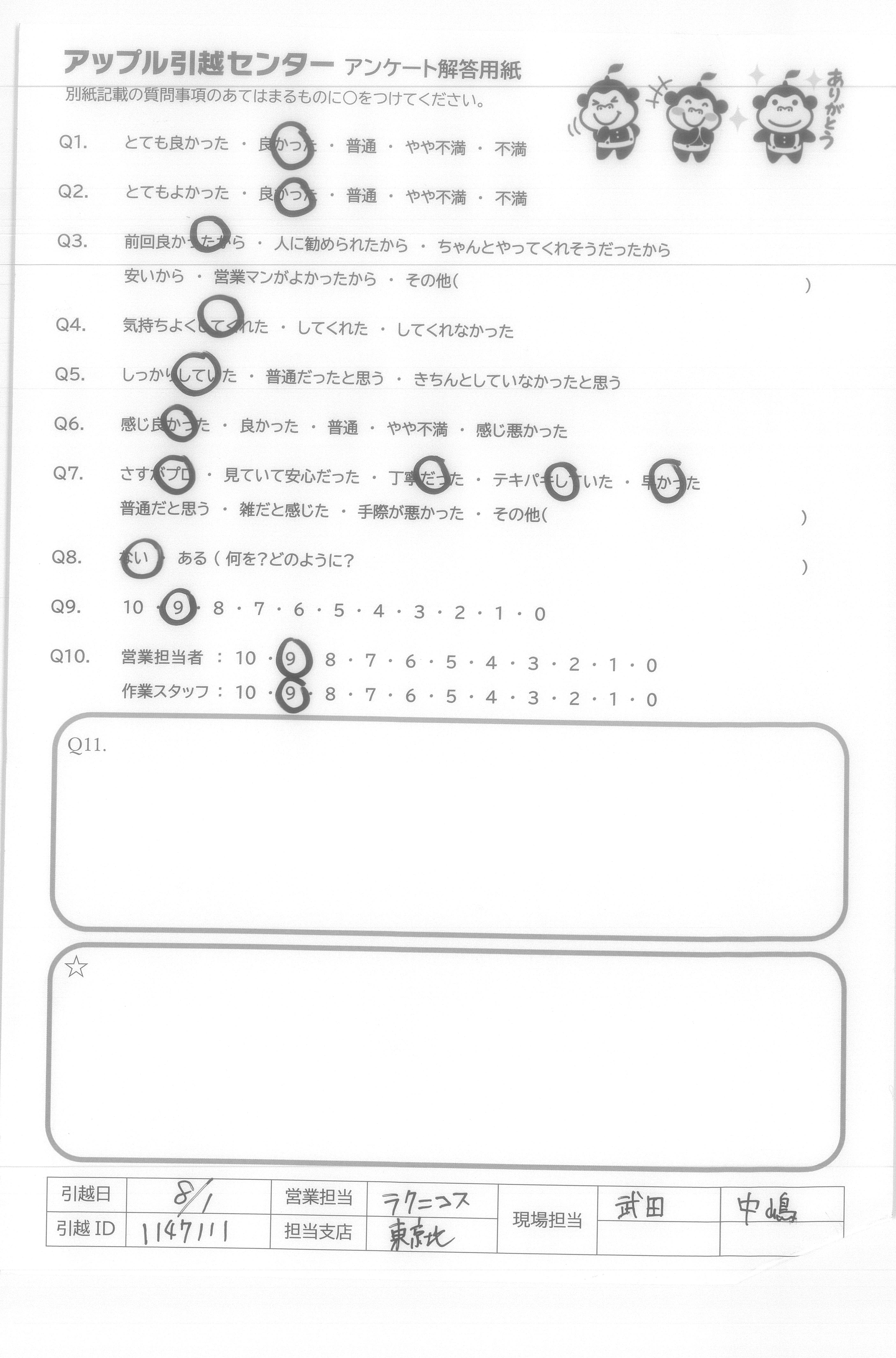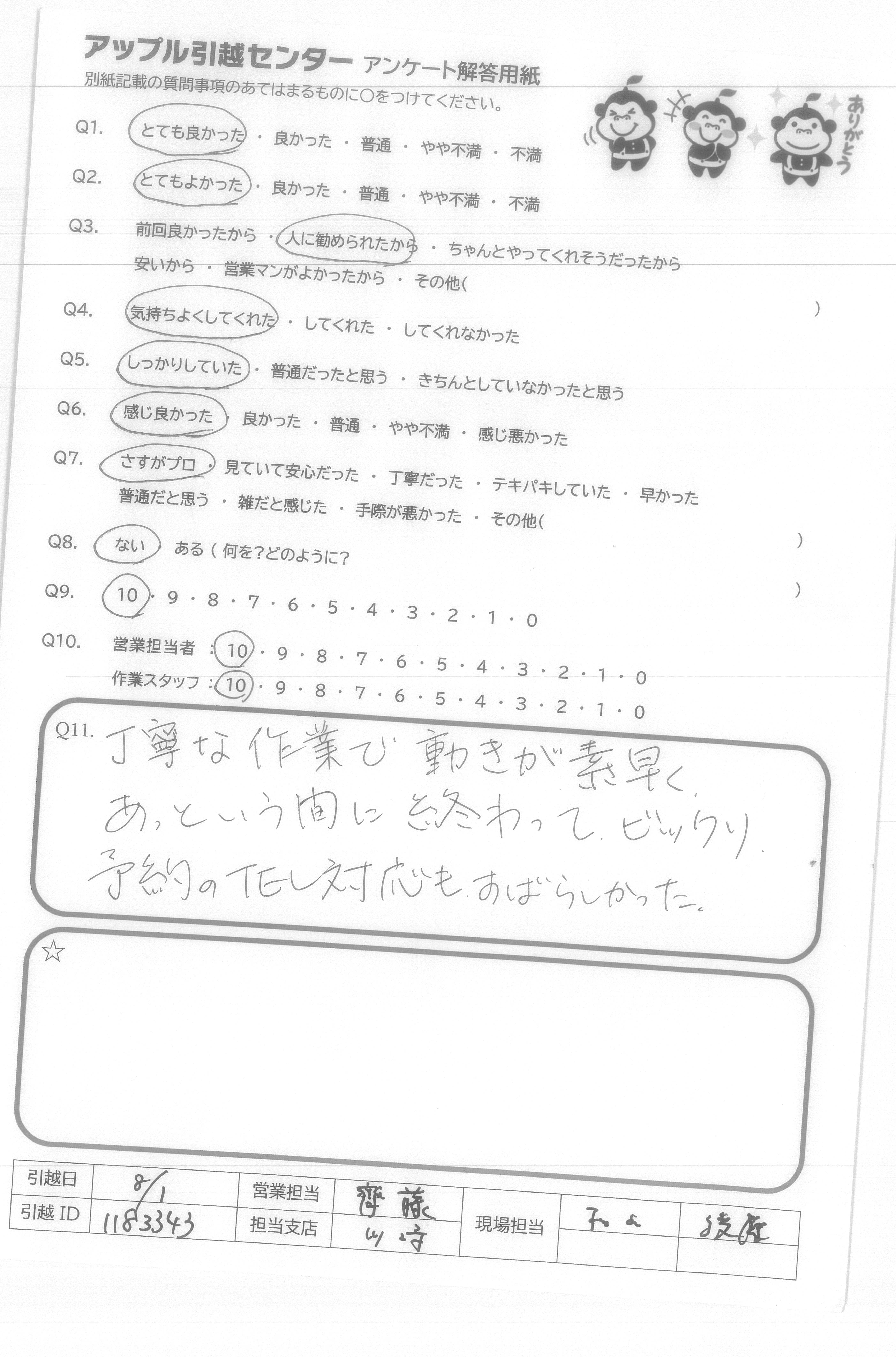 A.友人・知人にはいつもアップル引越センターを薦めています。 何人かの友人はすでにアップルを使っていました。 次回もよろしくお願いします!