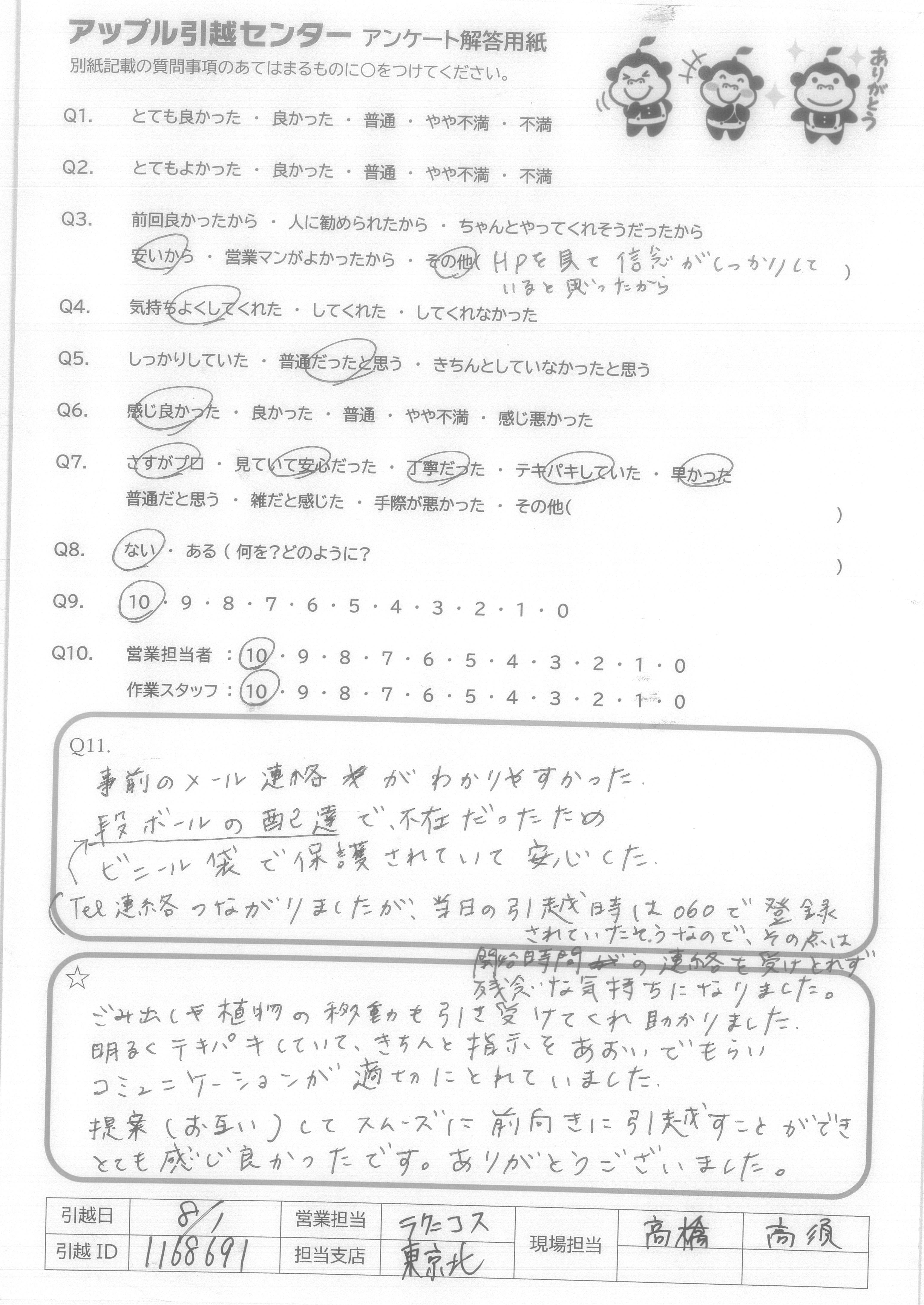 A.事前のメール連絡がわかりやすかった。 段ボールの配達で、不在だったため ビニール袋で保護されていて安心した (Tel連絡つながりましたが、当日の引越時は060で登録されていたそうなので、その点は開始時間の連絡を受けとれず残念な気持ちになりました。