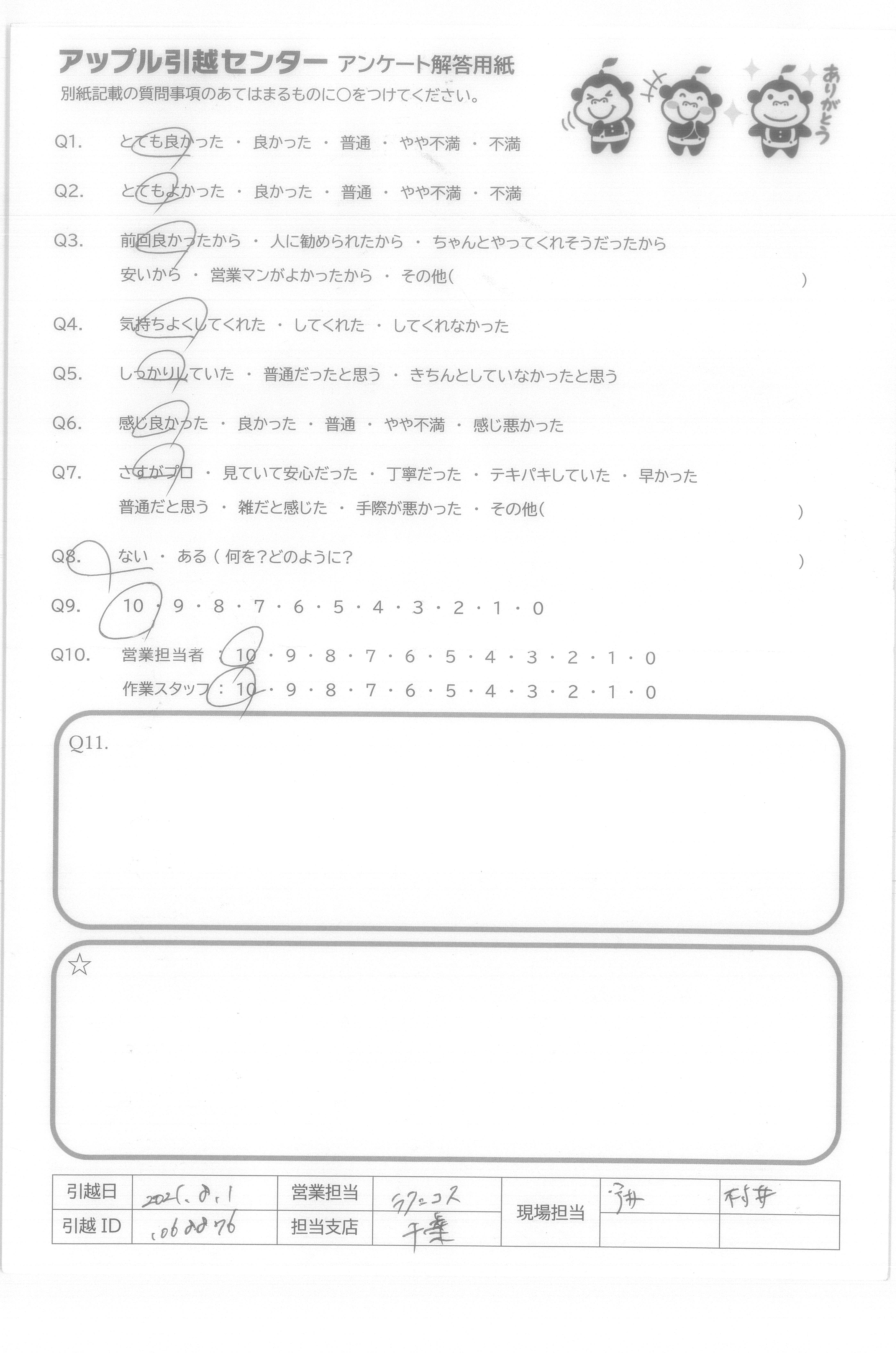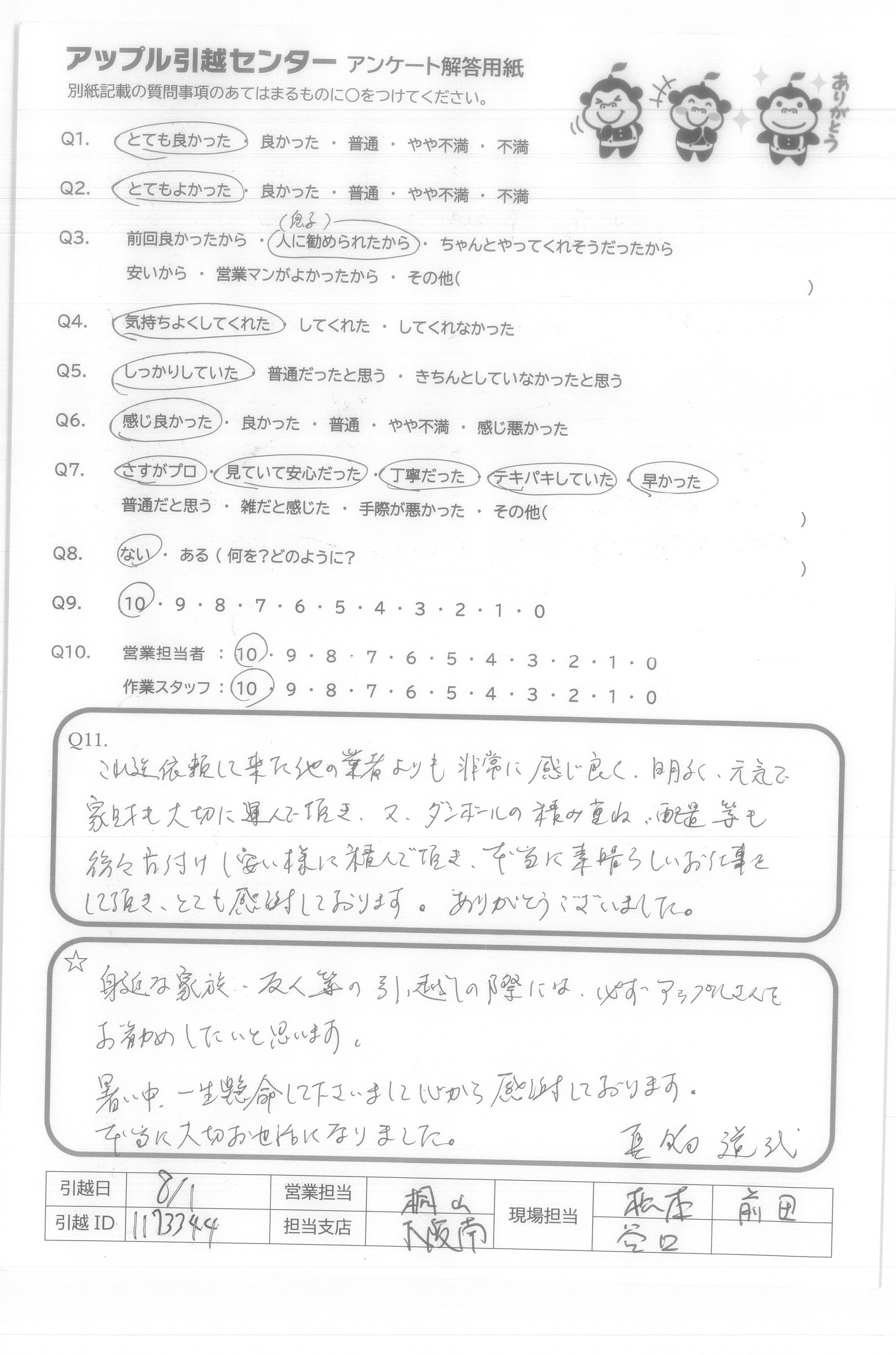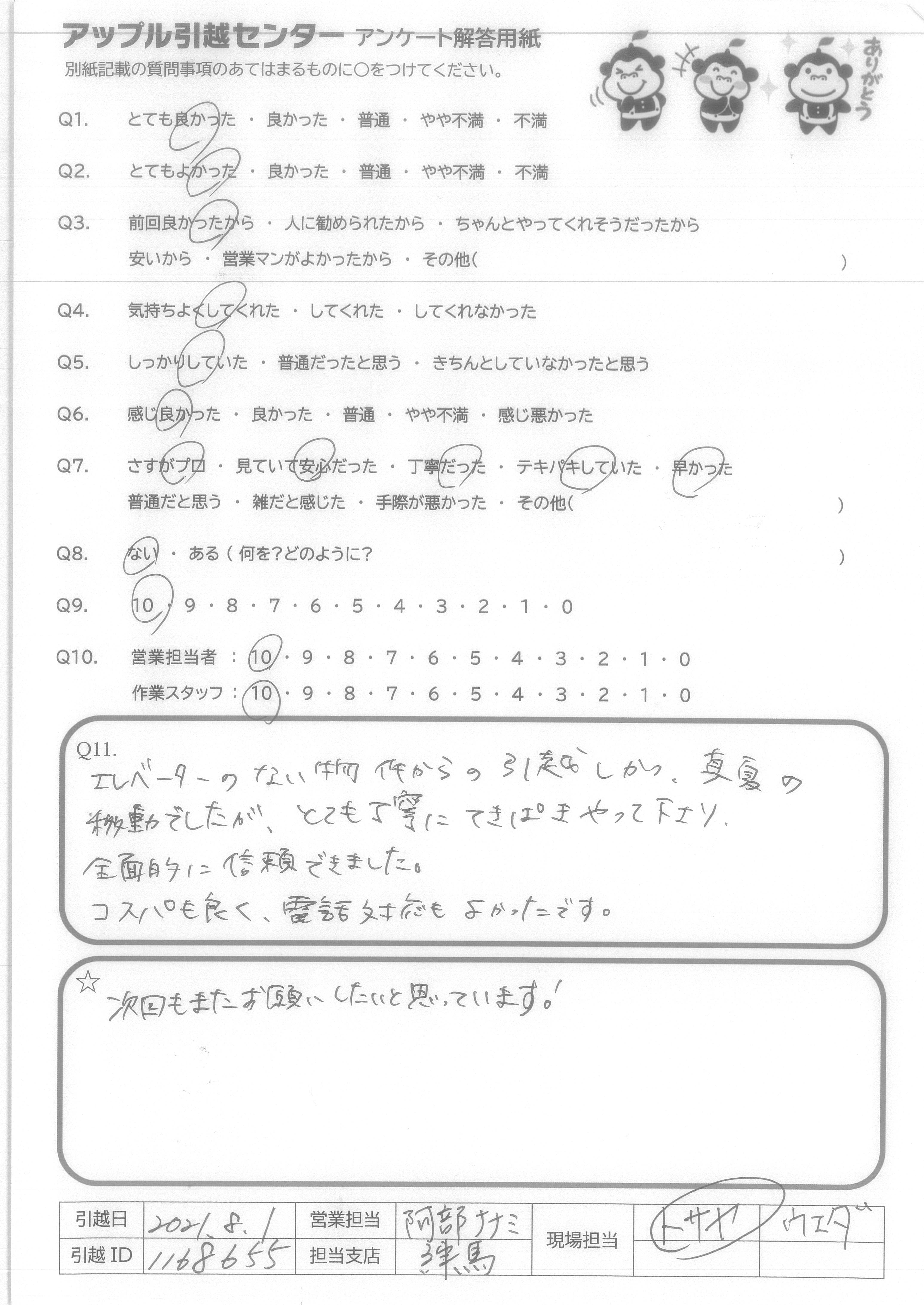 A.身近な家族、友人等の引っ越しの際には、必ずアップルさんをお勧めしたいと思います。 暑い中、一生懸命して下さいまして心から感謝しております。 本当に大切お世話になりました。 真鍋道代