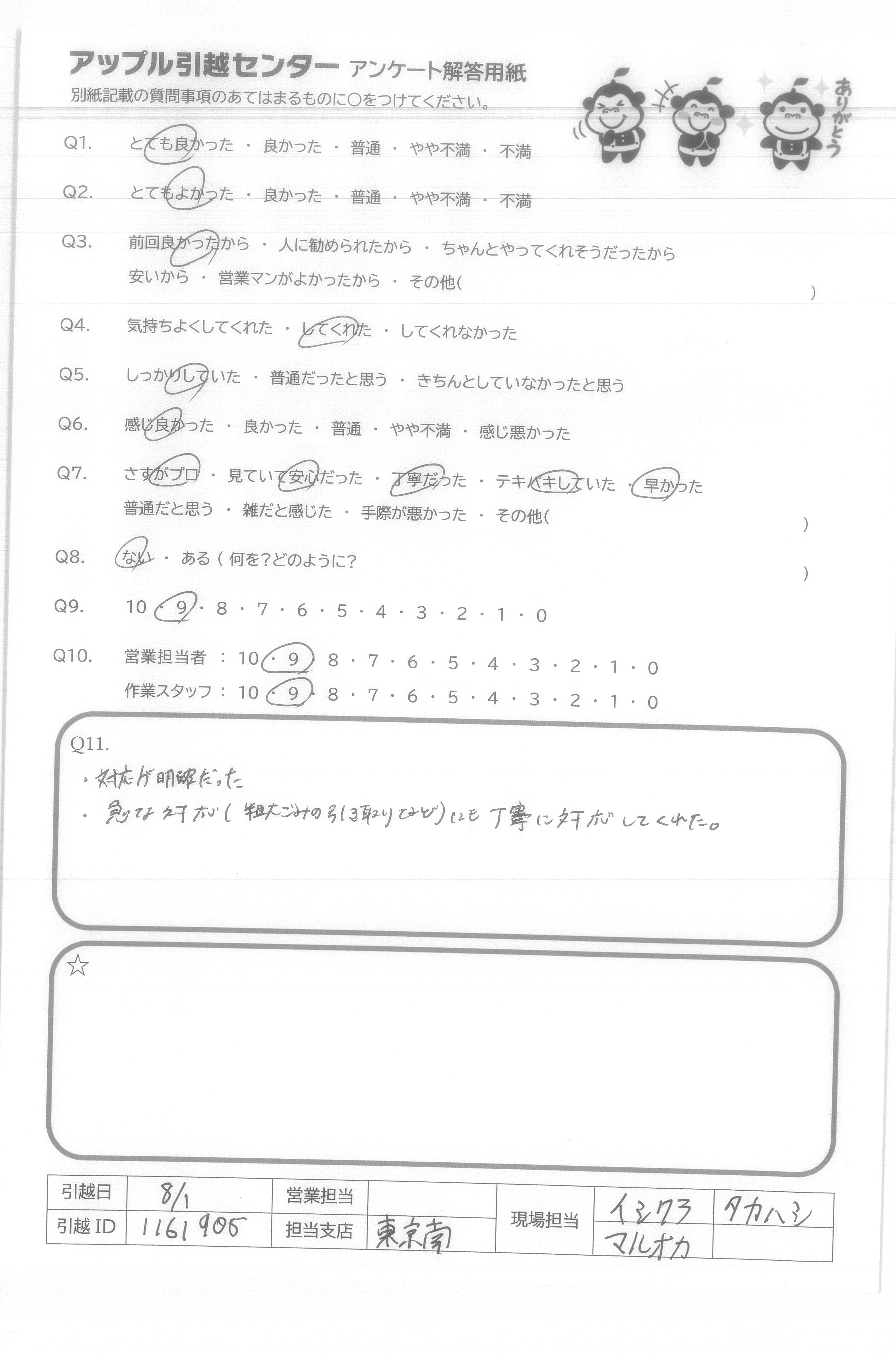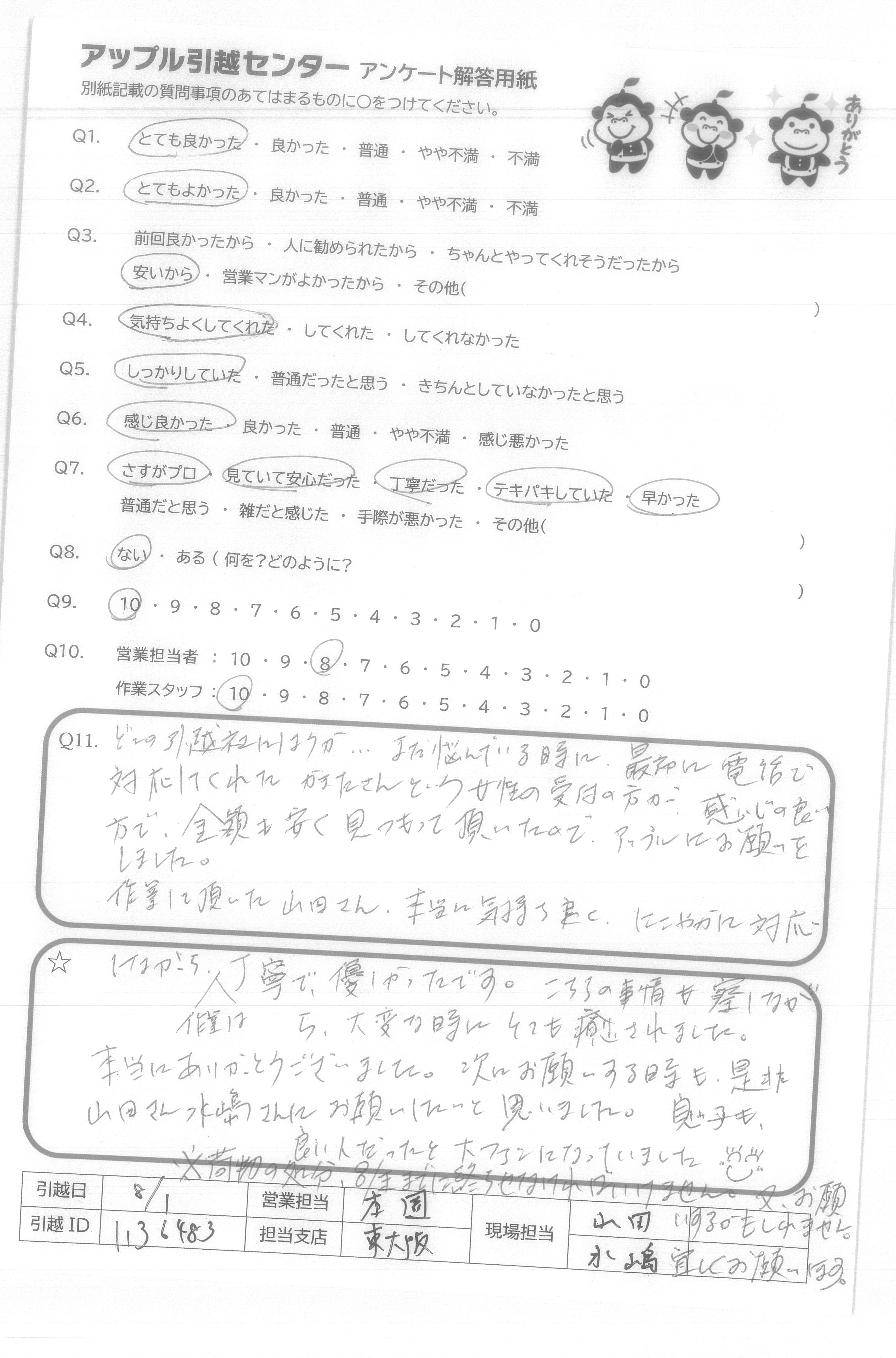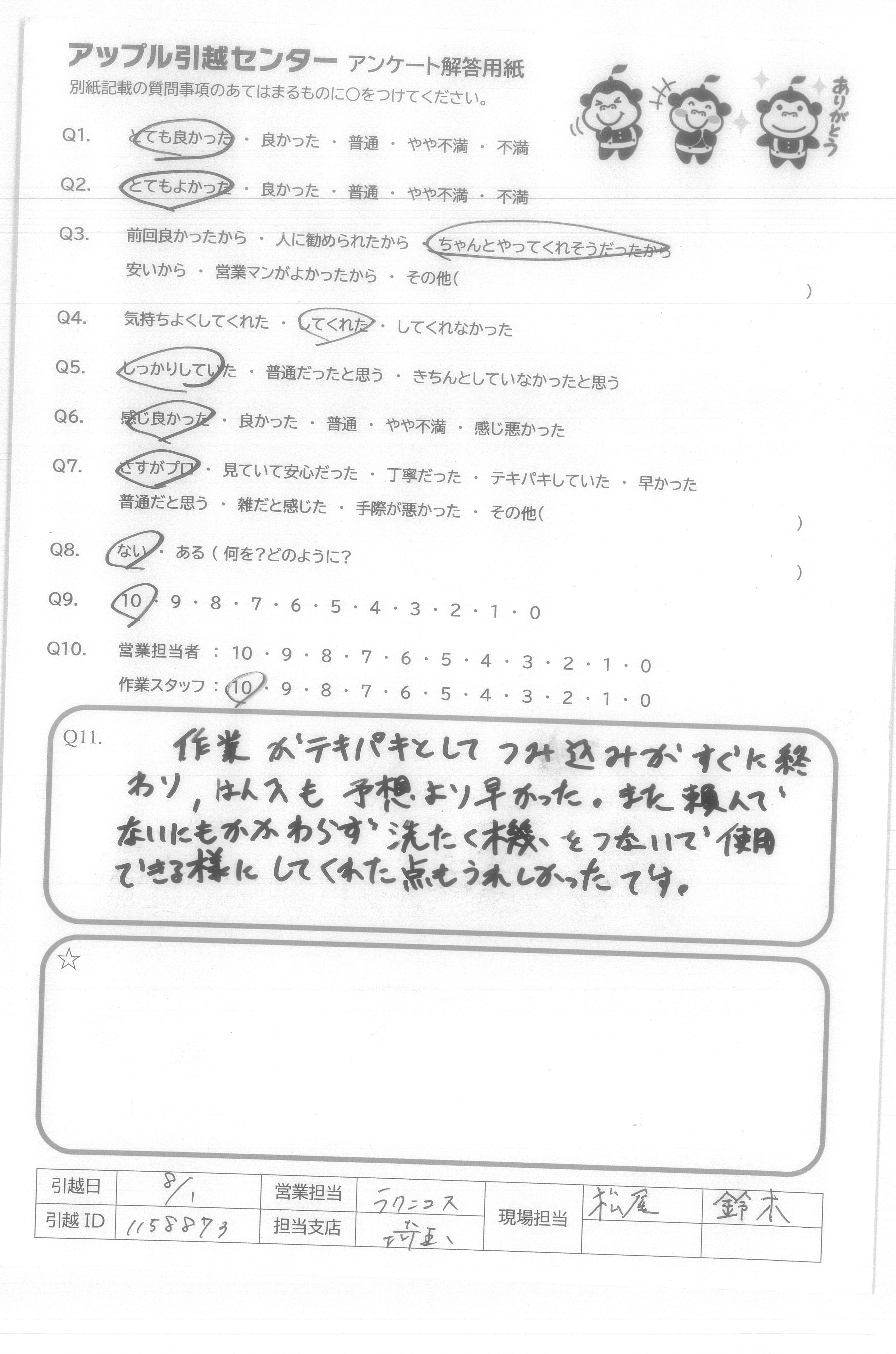 A.身近な家族、友人等の引っ越しの際には、必ずアップルさんをお勧めしたいと思います。 暑い中、一生懸命して下さいまして心から感謝しております。 本当に大切お世話になりました。 真鍋道代