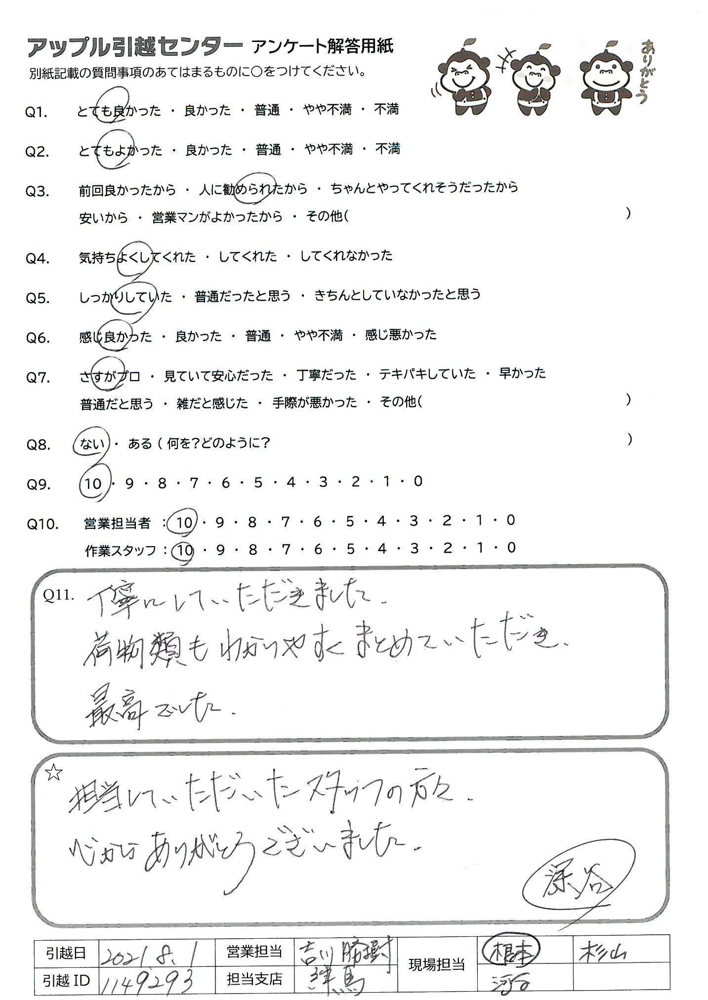 A.今回ご担当頂いた「武田さん」の対応が素晴らしかった為。 また引っ越しする際は、貴社武田さんにご依頼したいと思います。 本当に助かりました。有難うございました。