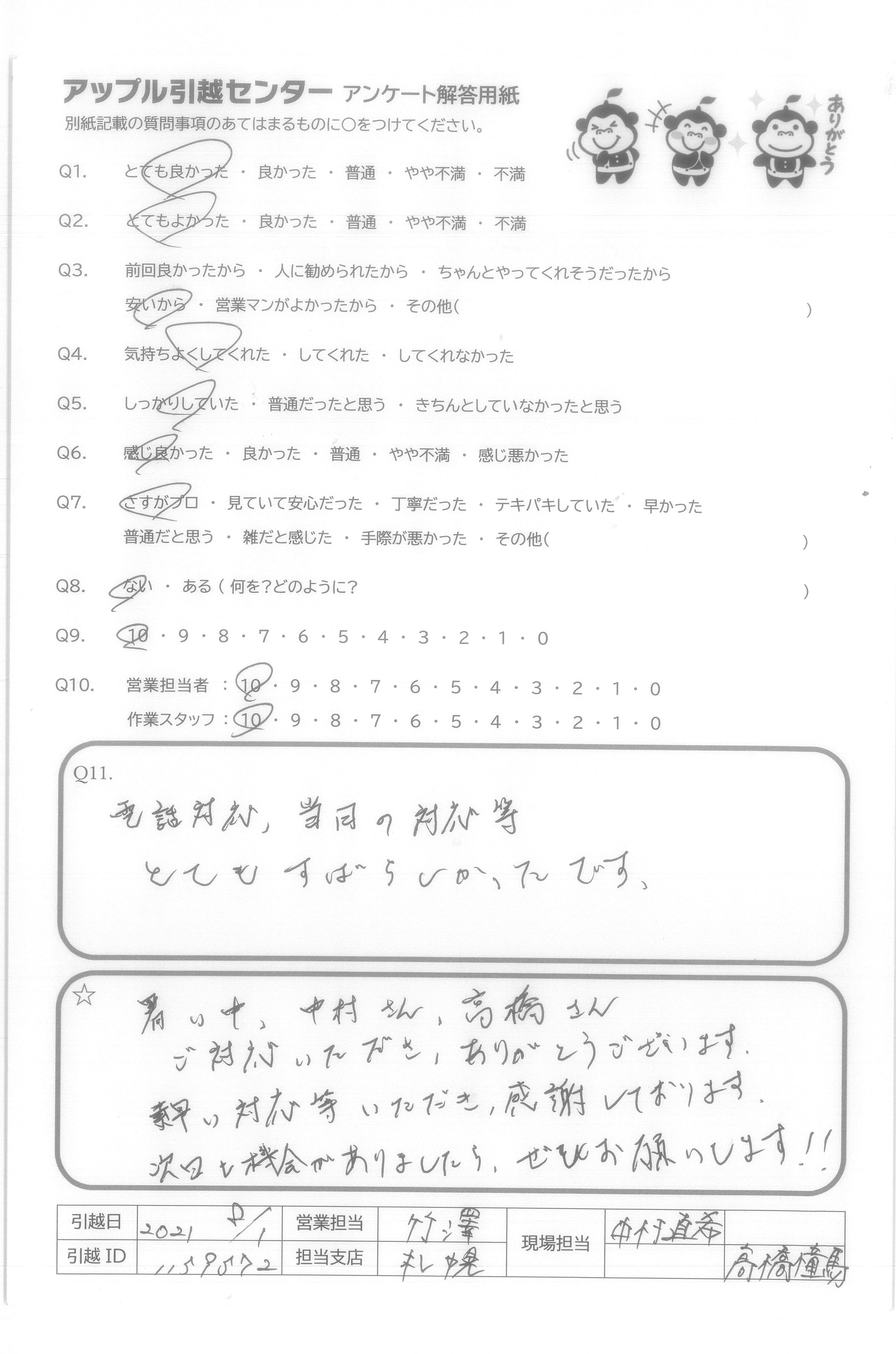 A.アンケートが遅くなりすみません。 引っ越し当日は真夏の暑い時期でしたが、スムーズに作業して頂きありがとうございました。 今後引っ越しする事があれば、また依頼したいと思っています。