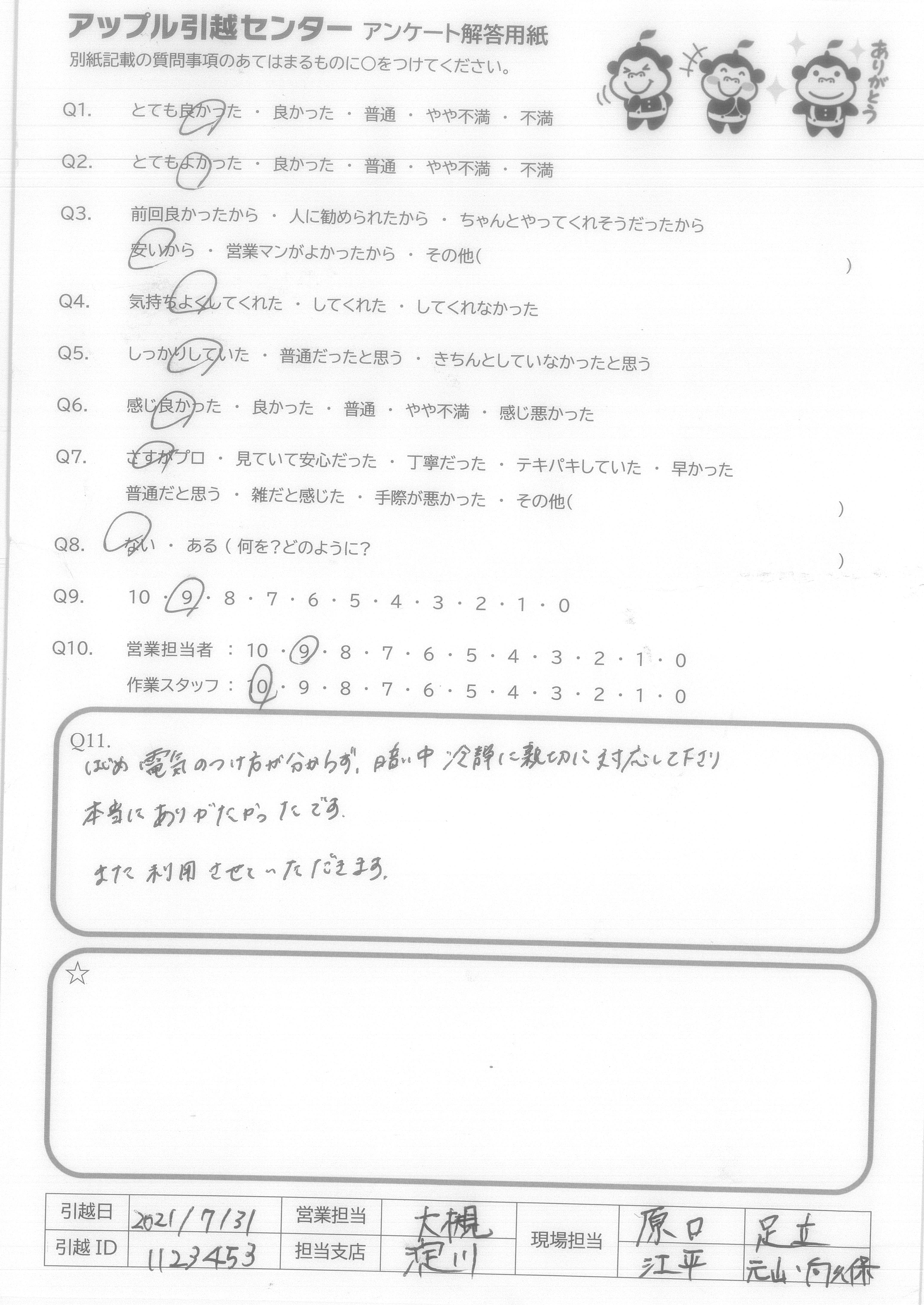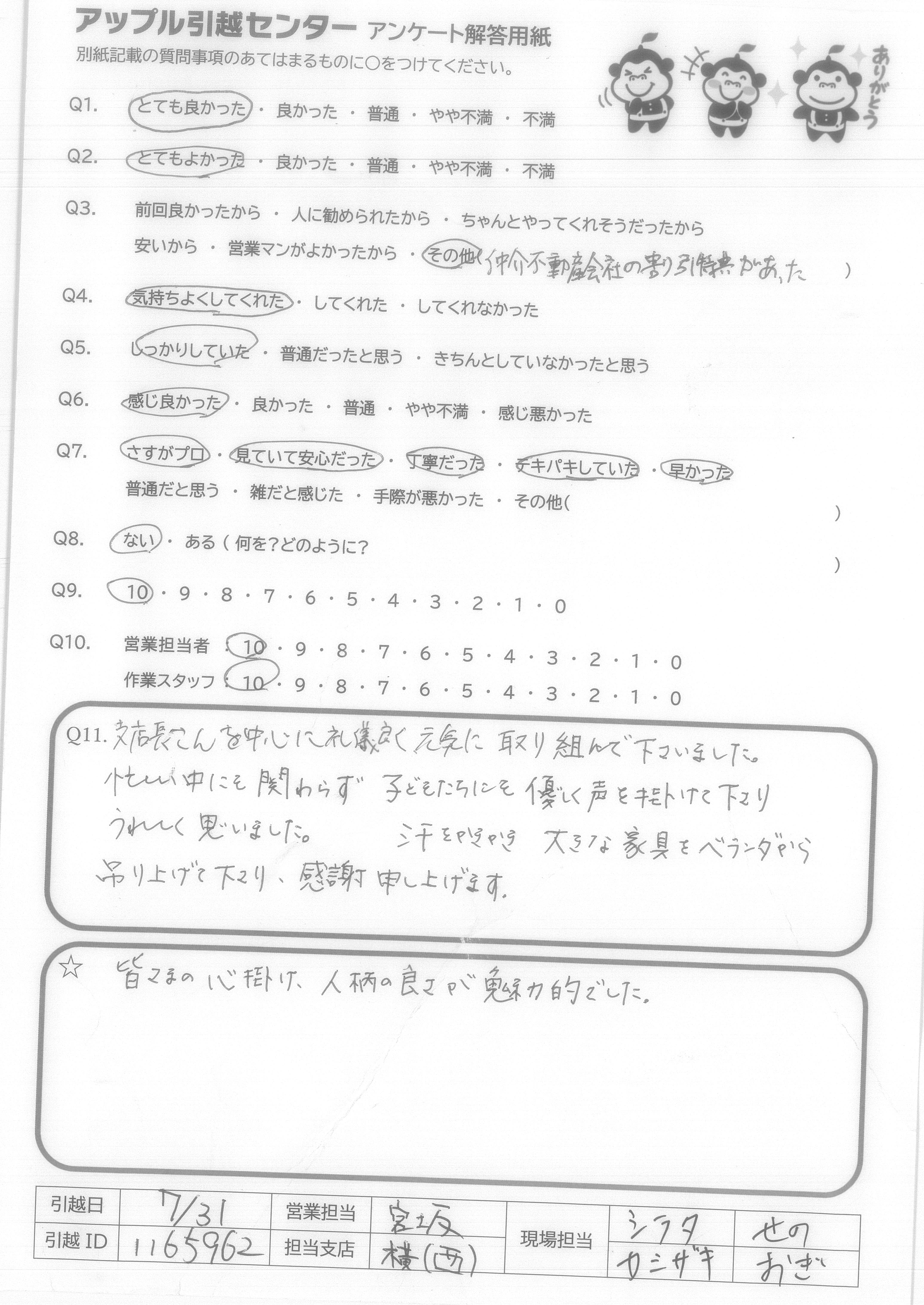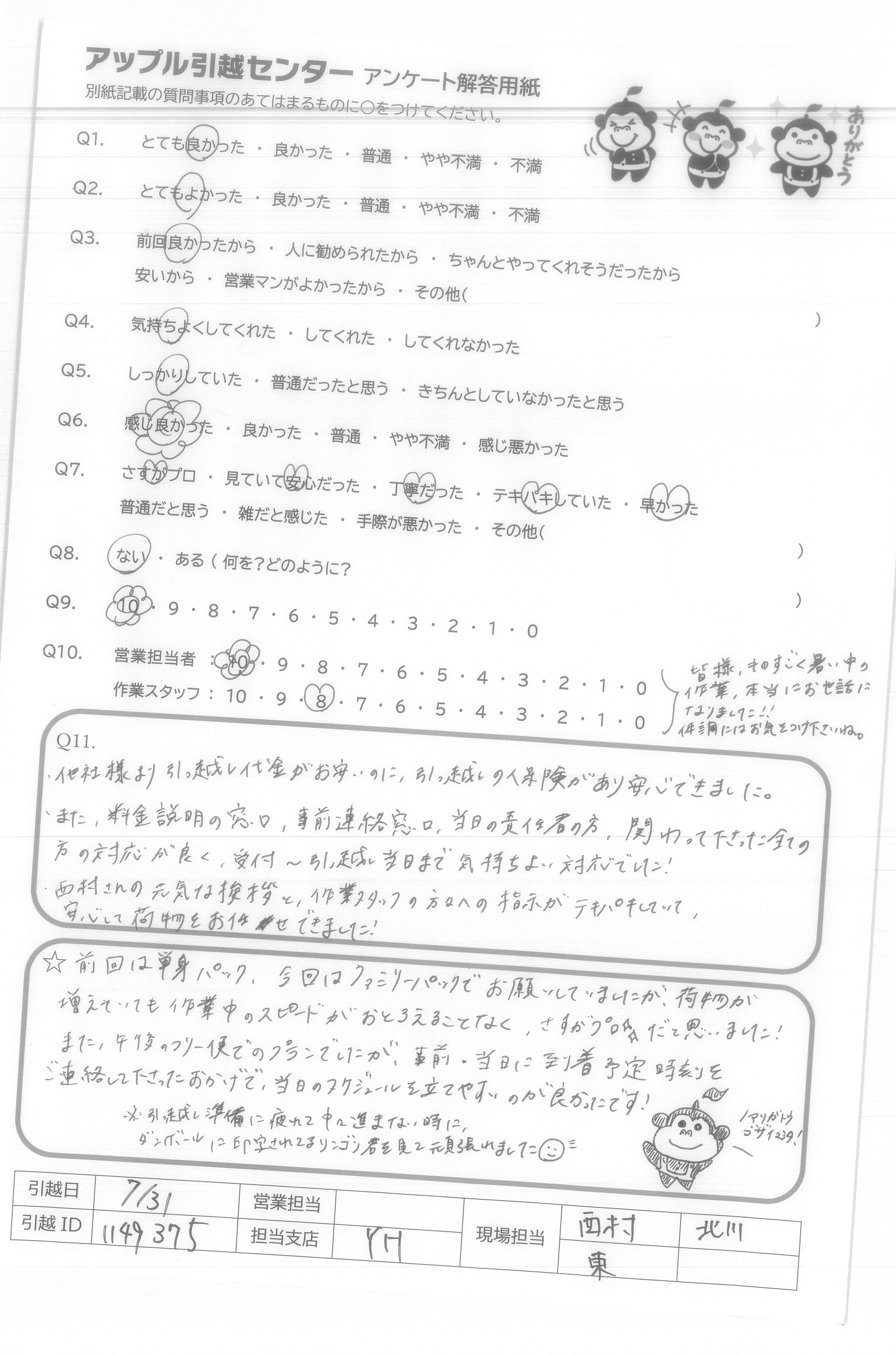 A.・他社様より引っ越し代金がお安いのに、引っ越しの保険があり安心できました。 ・また、料金説明の窓口、当日の責任者の方、関わって下さった全ての方の対応が良く、受付~引っ越し当日まで気持ちよい対応でした! ・西村さんの元気な挨拶と、作業スタッフの方々への指示がテキパキしていて、安心して荷物をお任せできました!