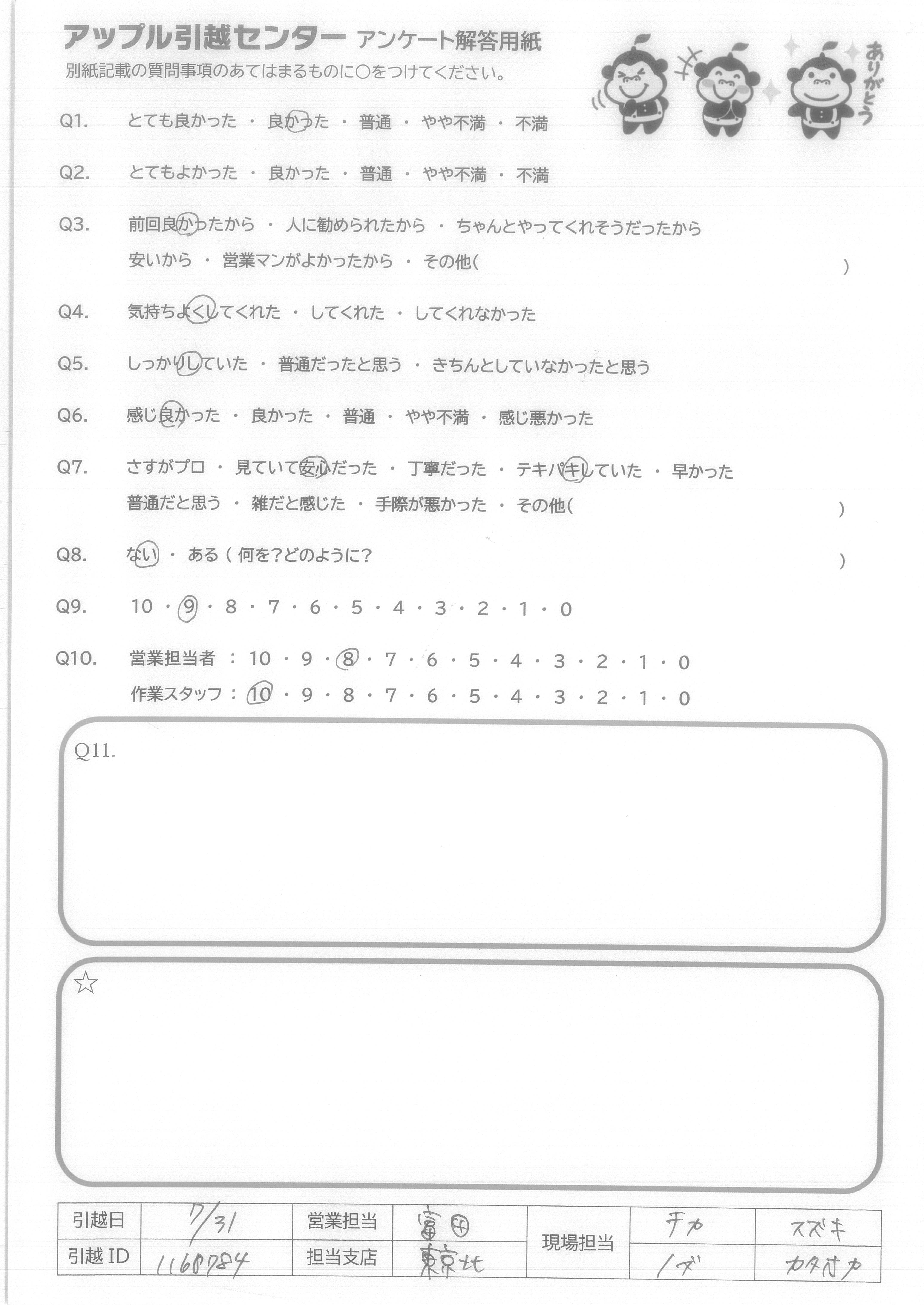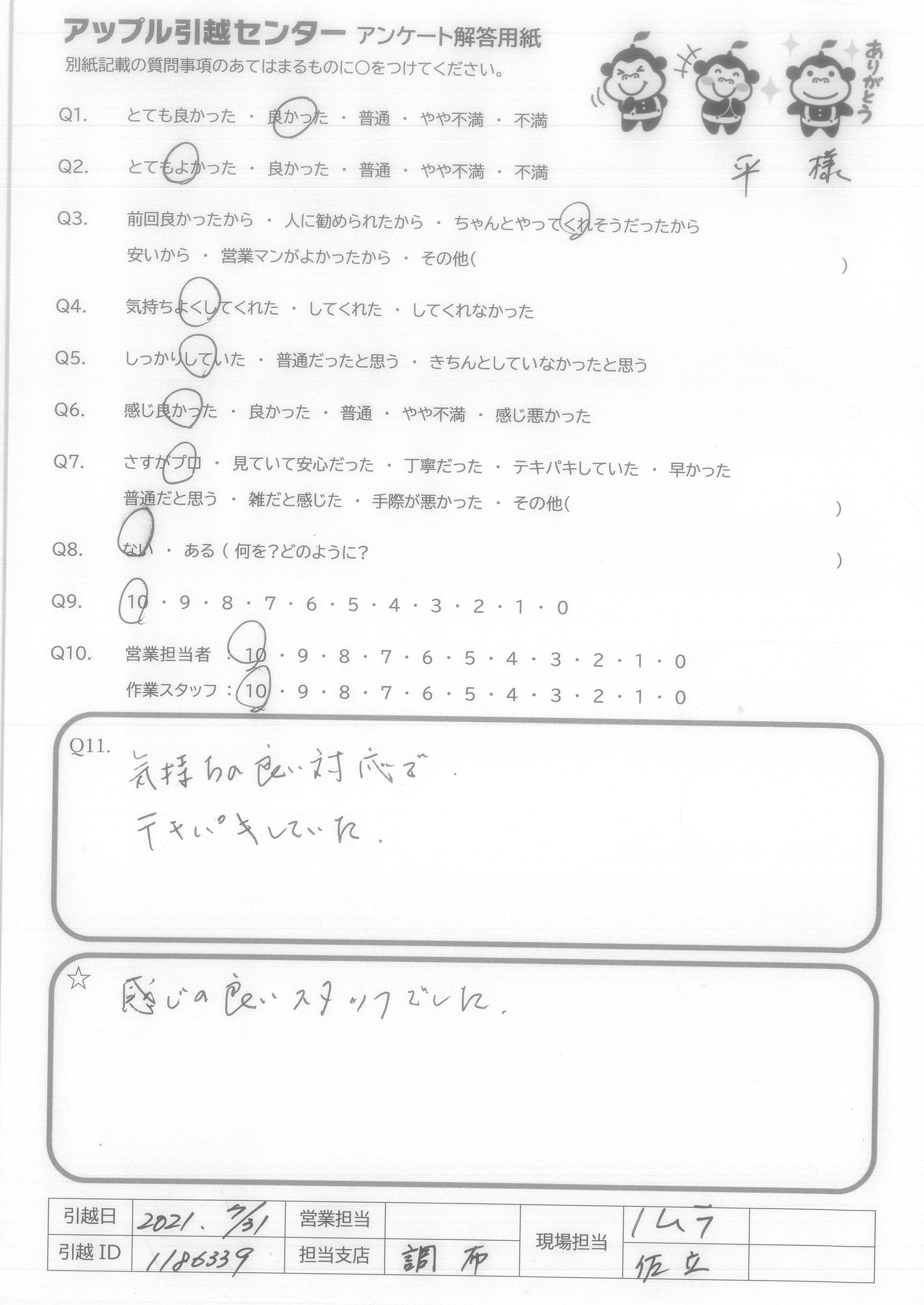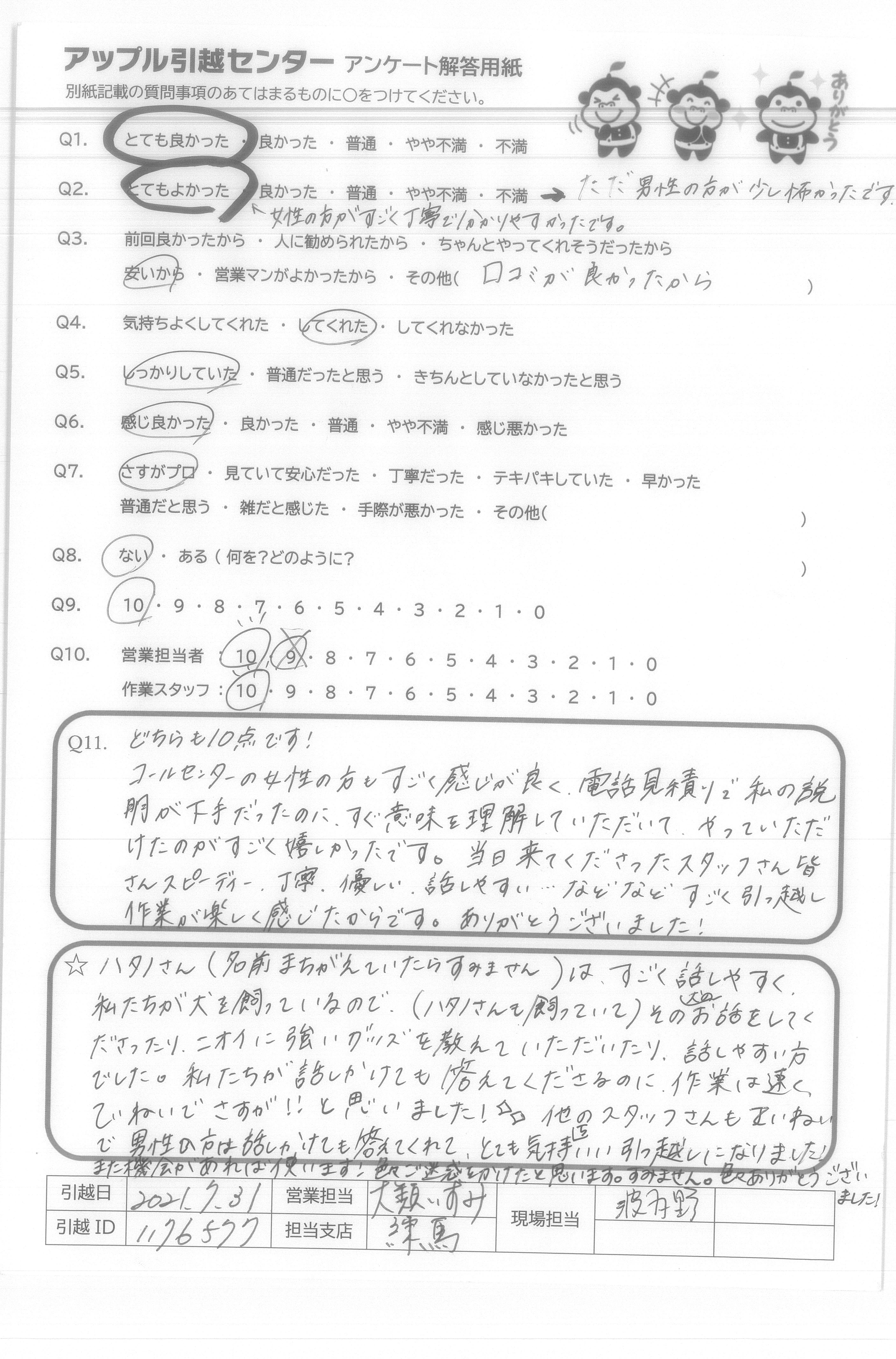 A.ハタノさん【名前まちがえていたらすみません】は、すごく話しやすく 私達たちが犬を飼っているので【ハタノさんも飼っていて】その犬のお話をしてくださったり、 ニオイに強いグッズを教えていただいたり、話しやすい方でした。 私たちが話しかけても答えてくださるのに、作業は速く丁寧でさすが!!と思いました! 他のスタッフさんもていねいで男性の方は話しかけても答えてくれて、とても気持ちいい引っ越しになりました。また機会があれば使います!色々迷惑かけたと思います。すみません。色々ありがとうございました。
