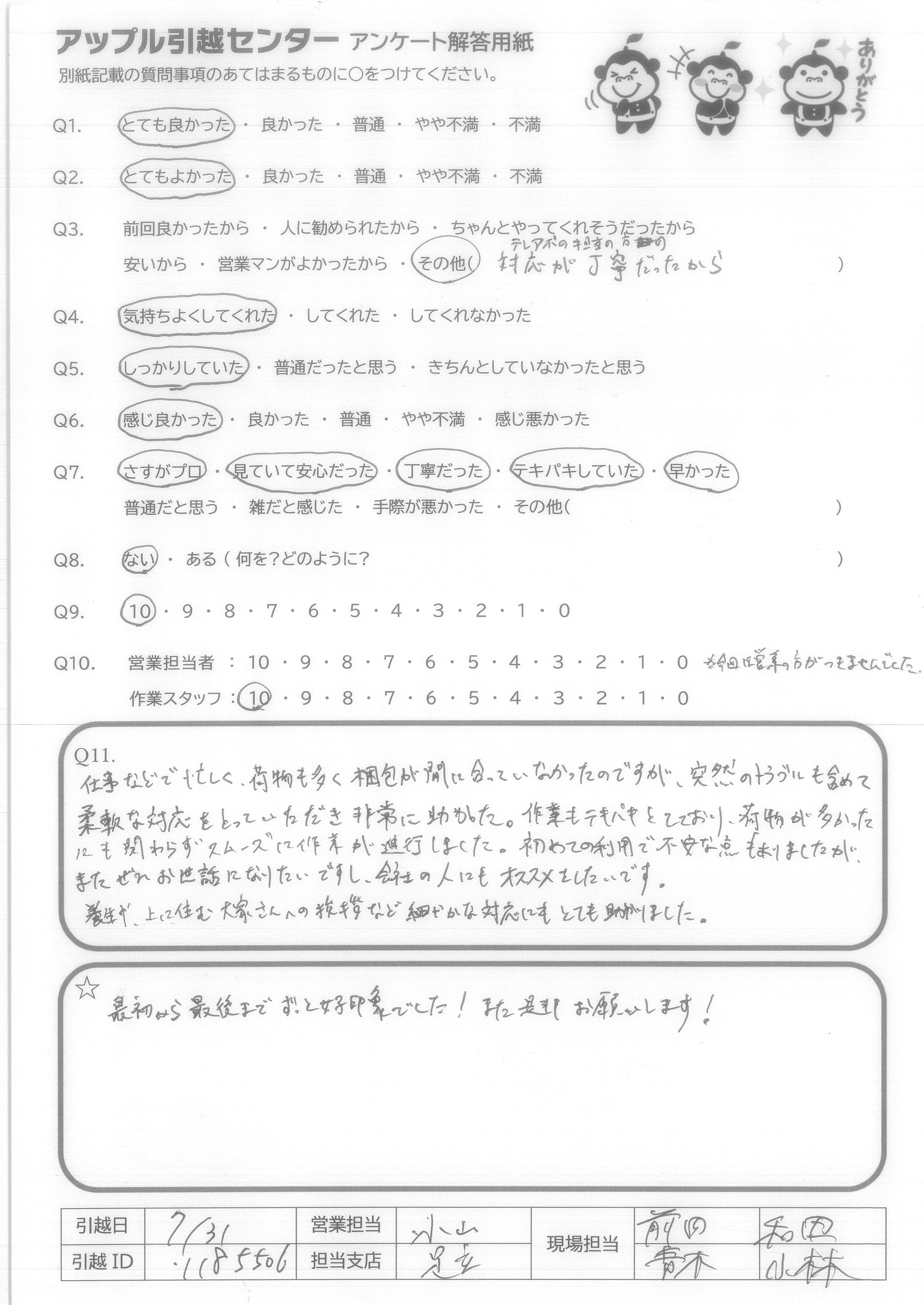 A.どちらも10点です! コールセンターの女性の方とすごく感じが良く、電話見積りで私の説明が下手だったのに、すぐ意味を 理解していただいてやっていただけたのがすごくうれしかったです。 当日の来てくださったスタッフさん皆さんスピーディ、丁寧、優しい、話しやすい・・・などなど すごく引っ越し作業が楽しく感じたからです。ありがとうございました!