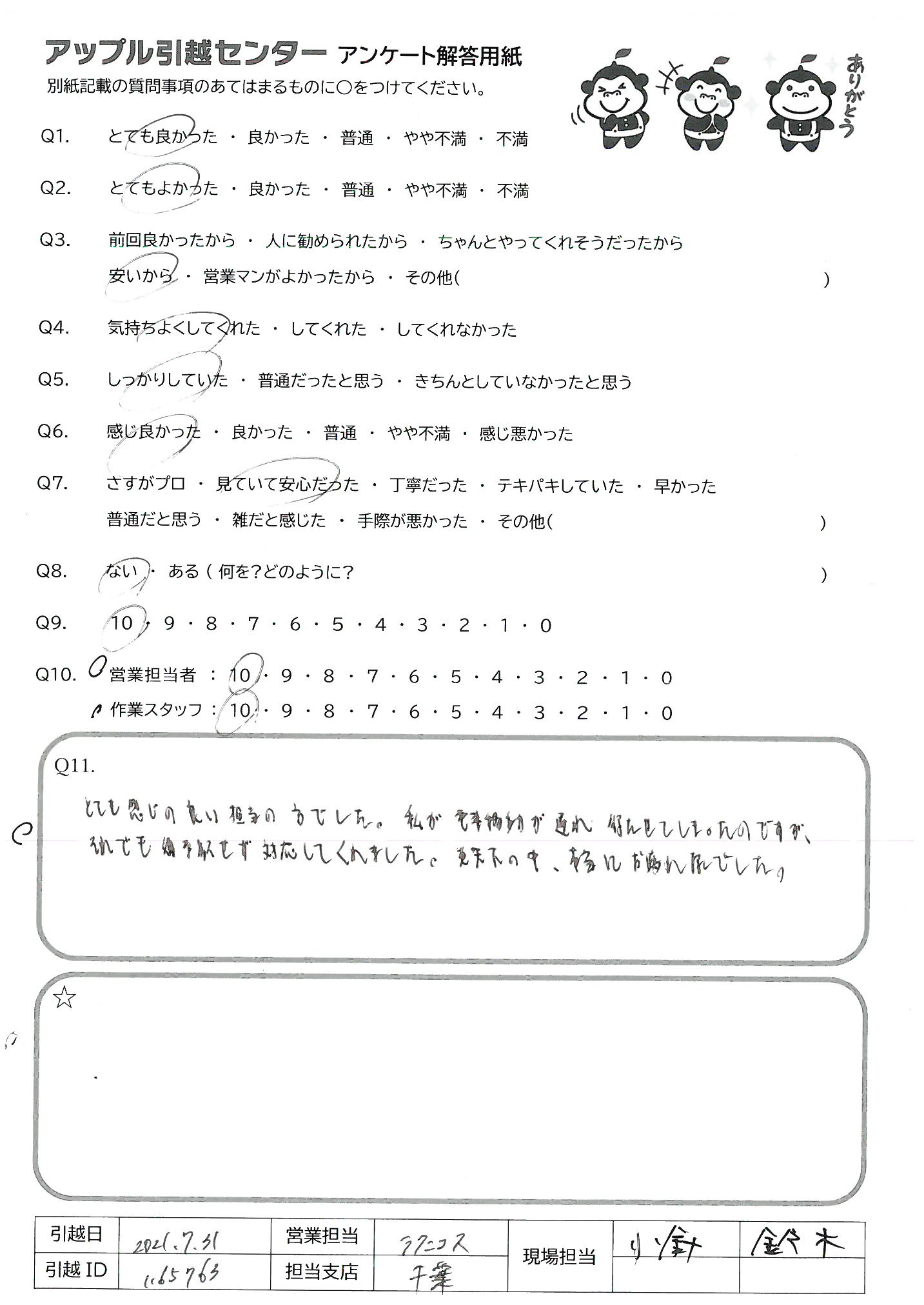 A.暑い中、本当にありがとうございました。 皆さん、爽やかで明るく、テキパキとお仕事されていて、さすがプロだなと感動しました! 逆にアンケートが遅くなりすみませんでした。