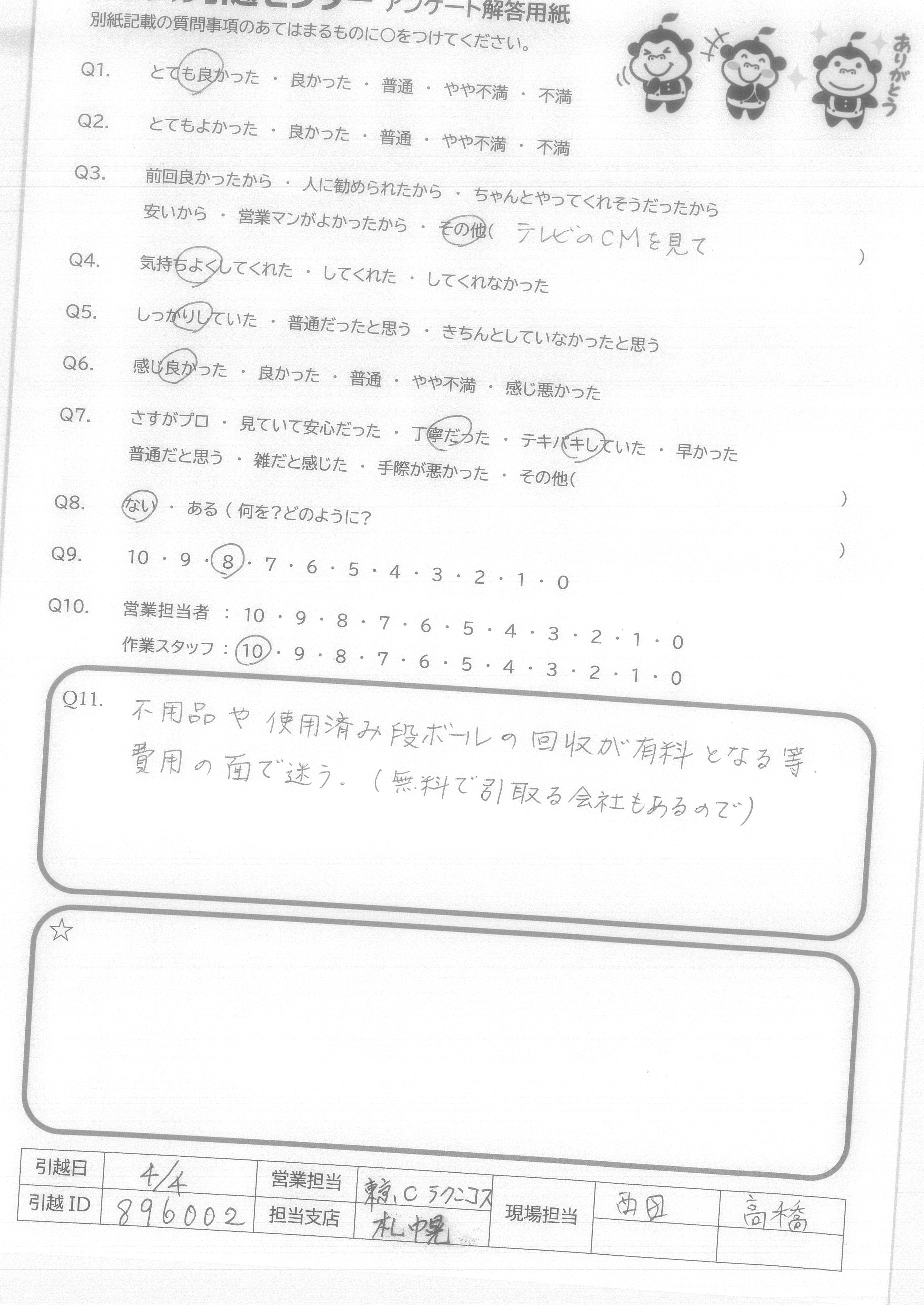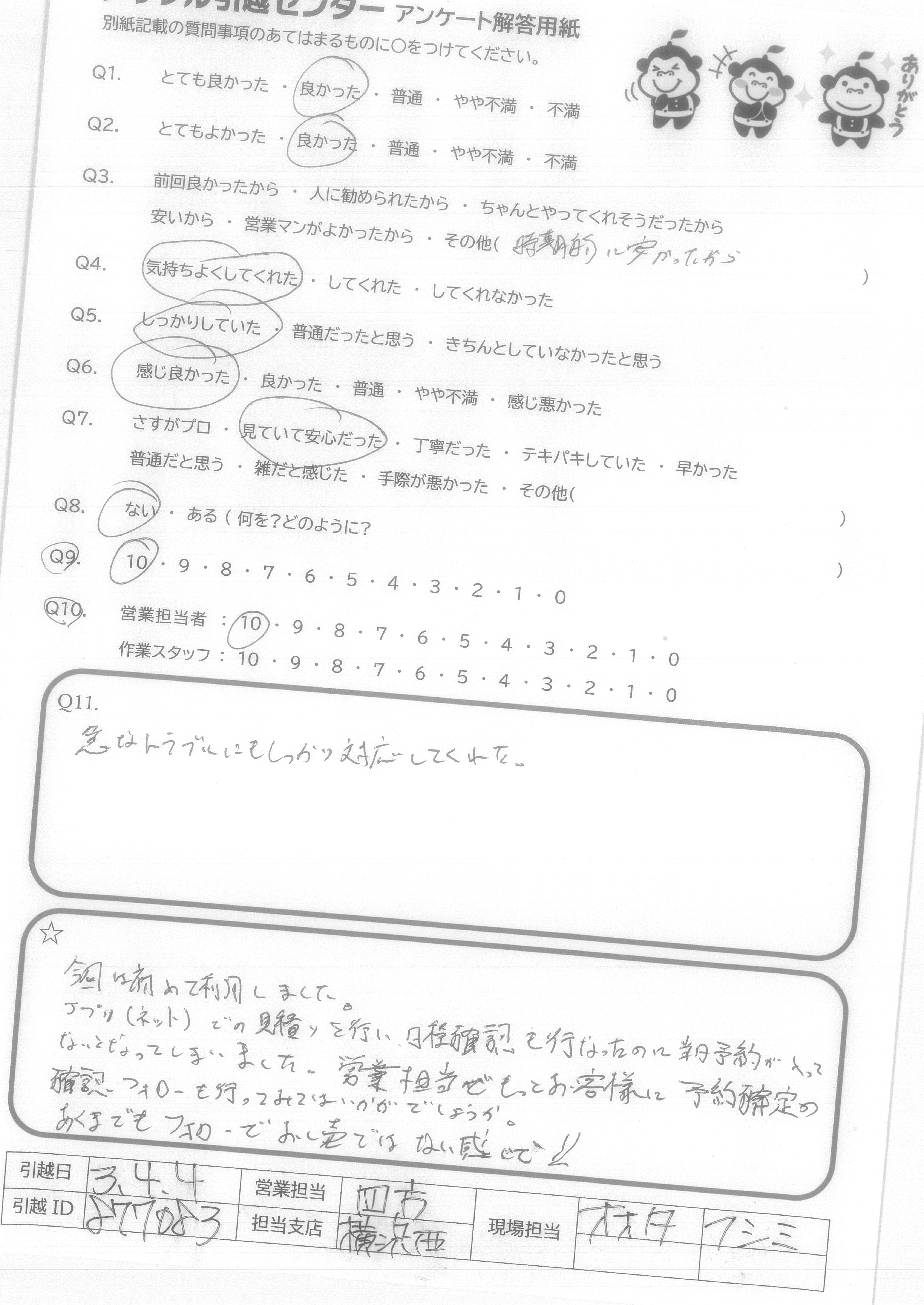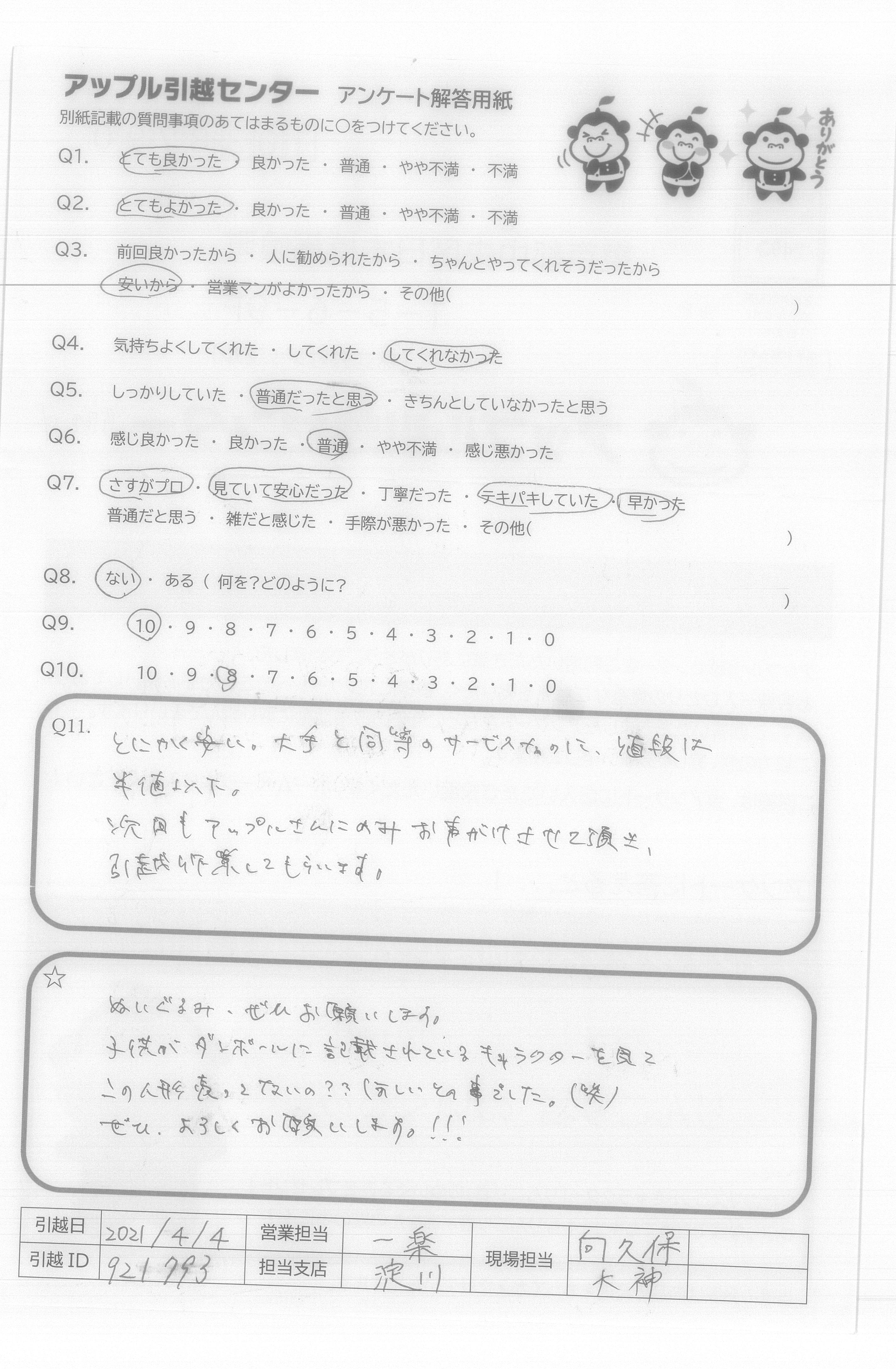 A.初めてアップル引越しセンターを利用させていただきましたが、今までの6回の引越しの中で最も安く、またサービスもよかったです。ぜひ次回もお願いしたいと思います。担当の方には大変お世話になりました。よろしくお伝えください。