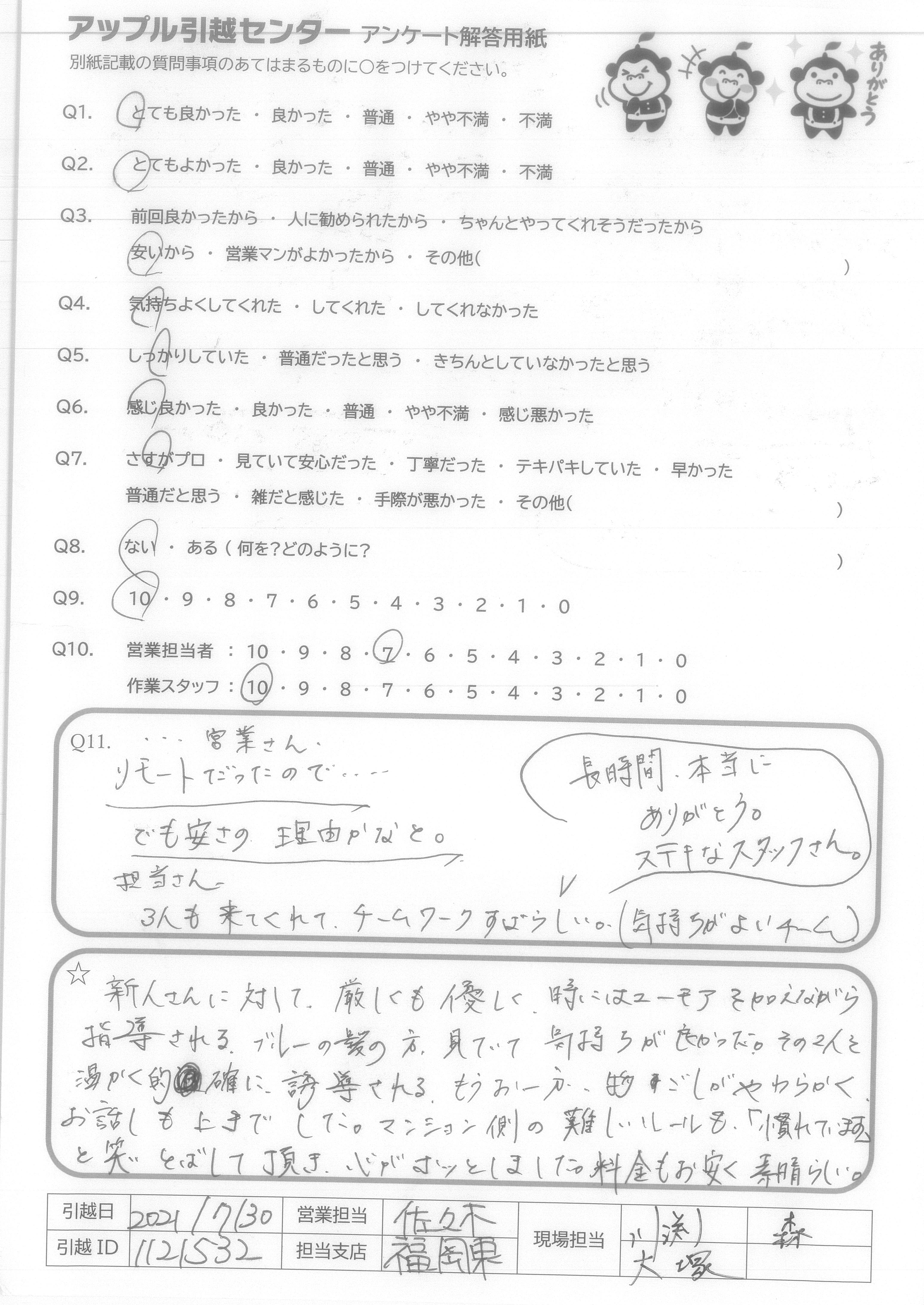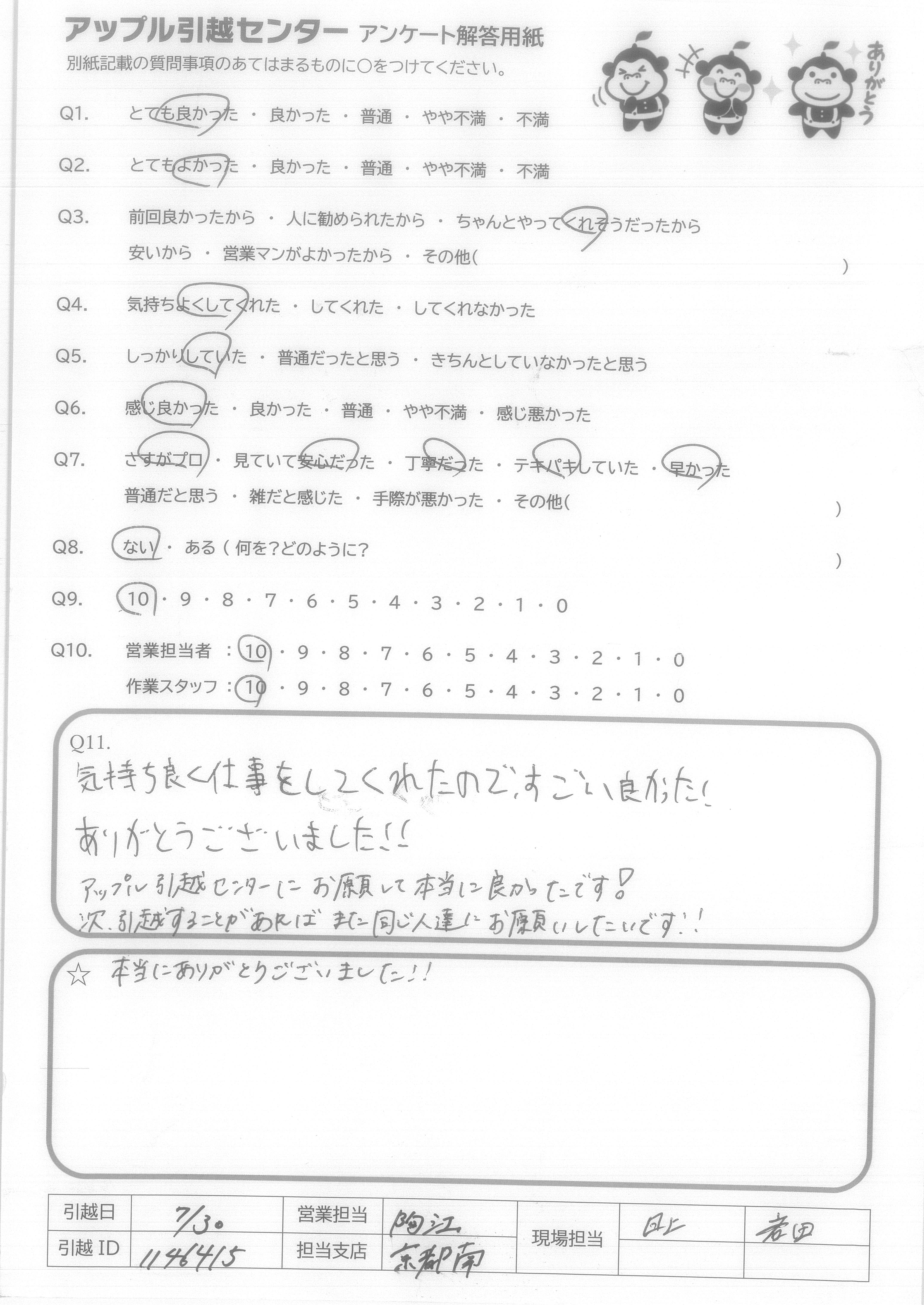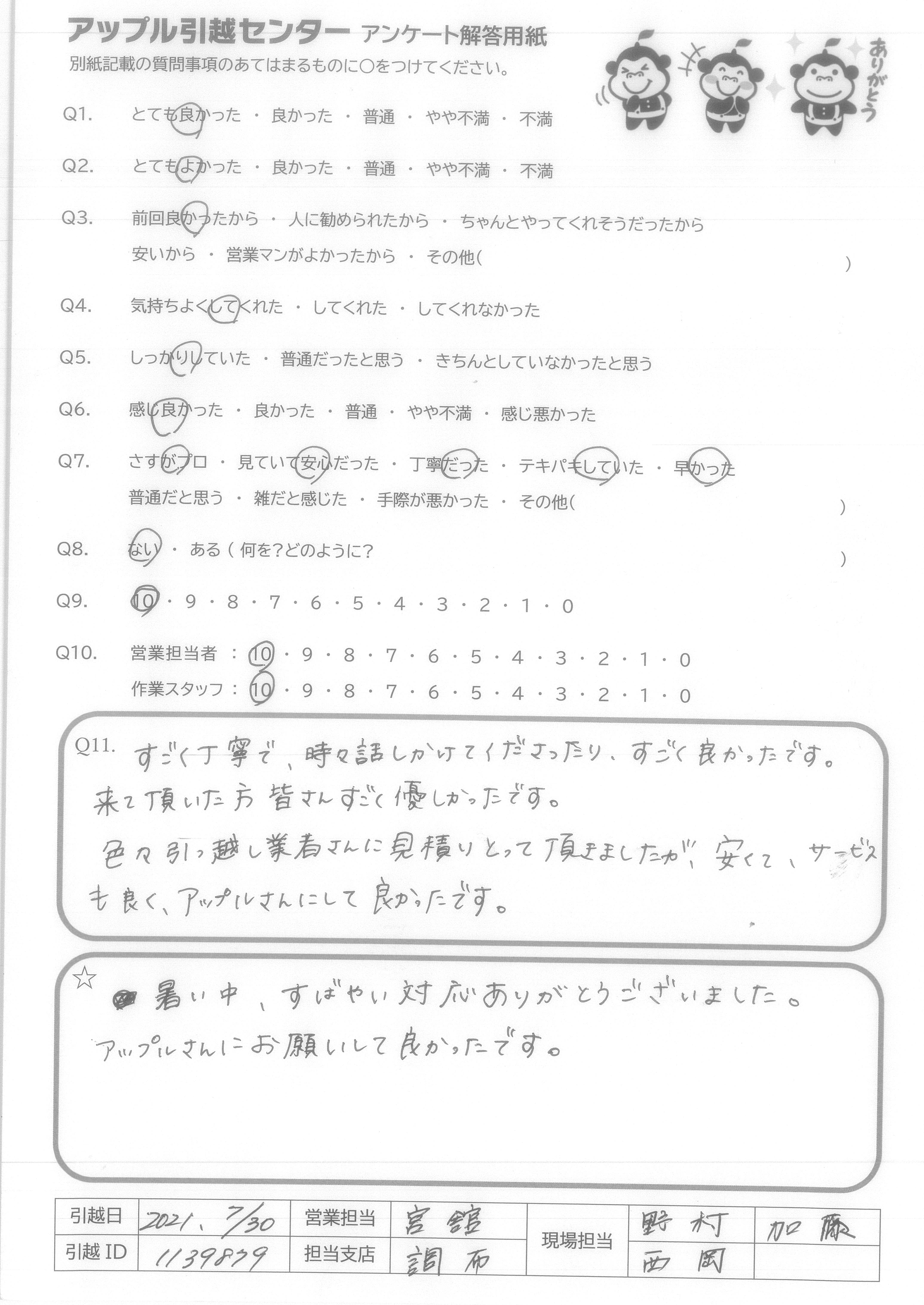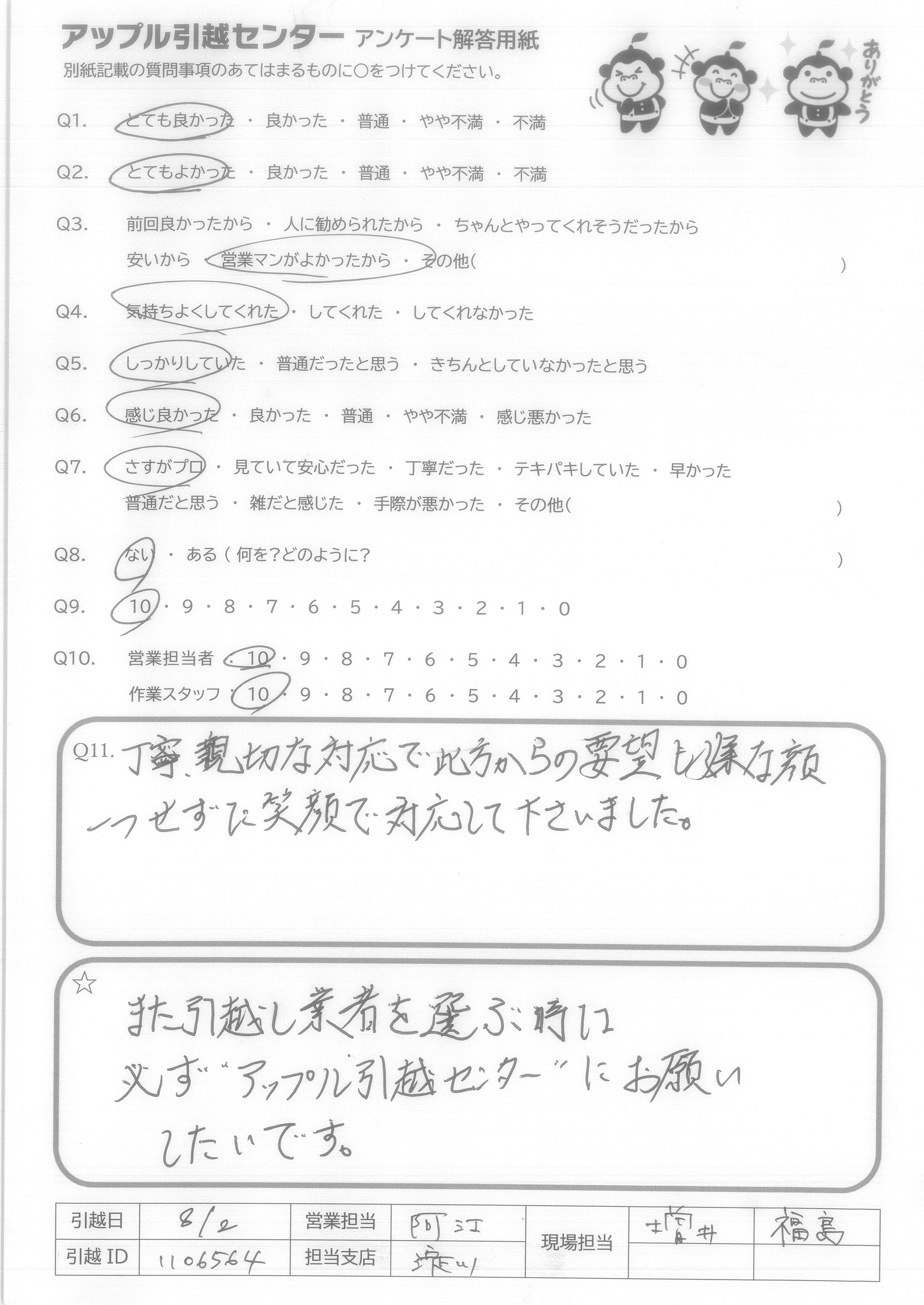 A.すごく丁寧で、時々話しかけてくださったり、すごく良かったです。来て頂いた方皆さんすごく優しかったです。色々引っ越し業者さんに見積りとって頂きましたが、安くて、サービスも良く、アップルさんにして良かったです。