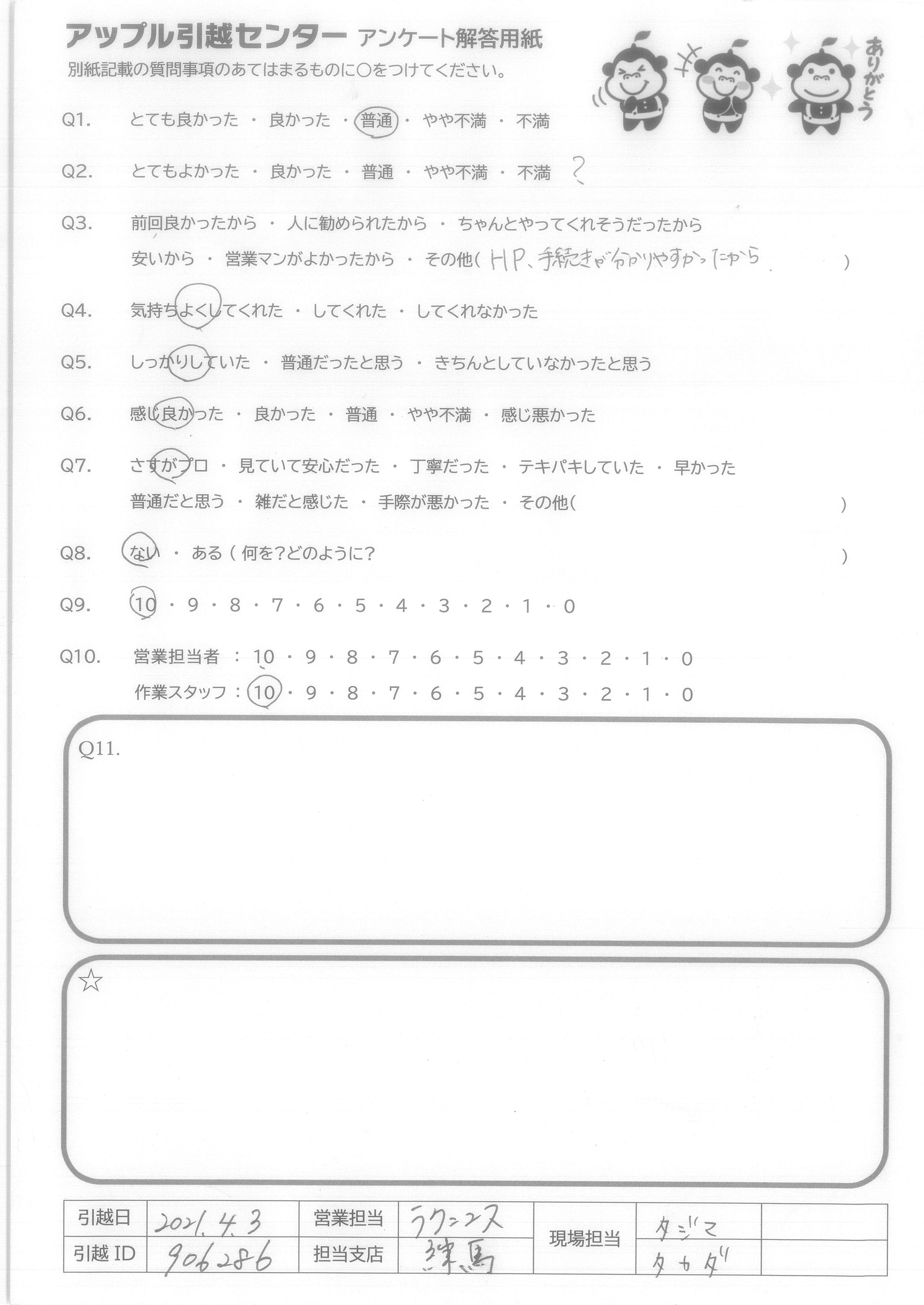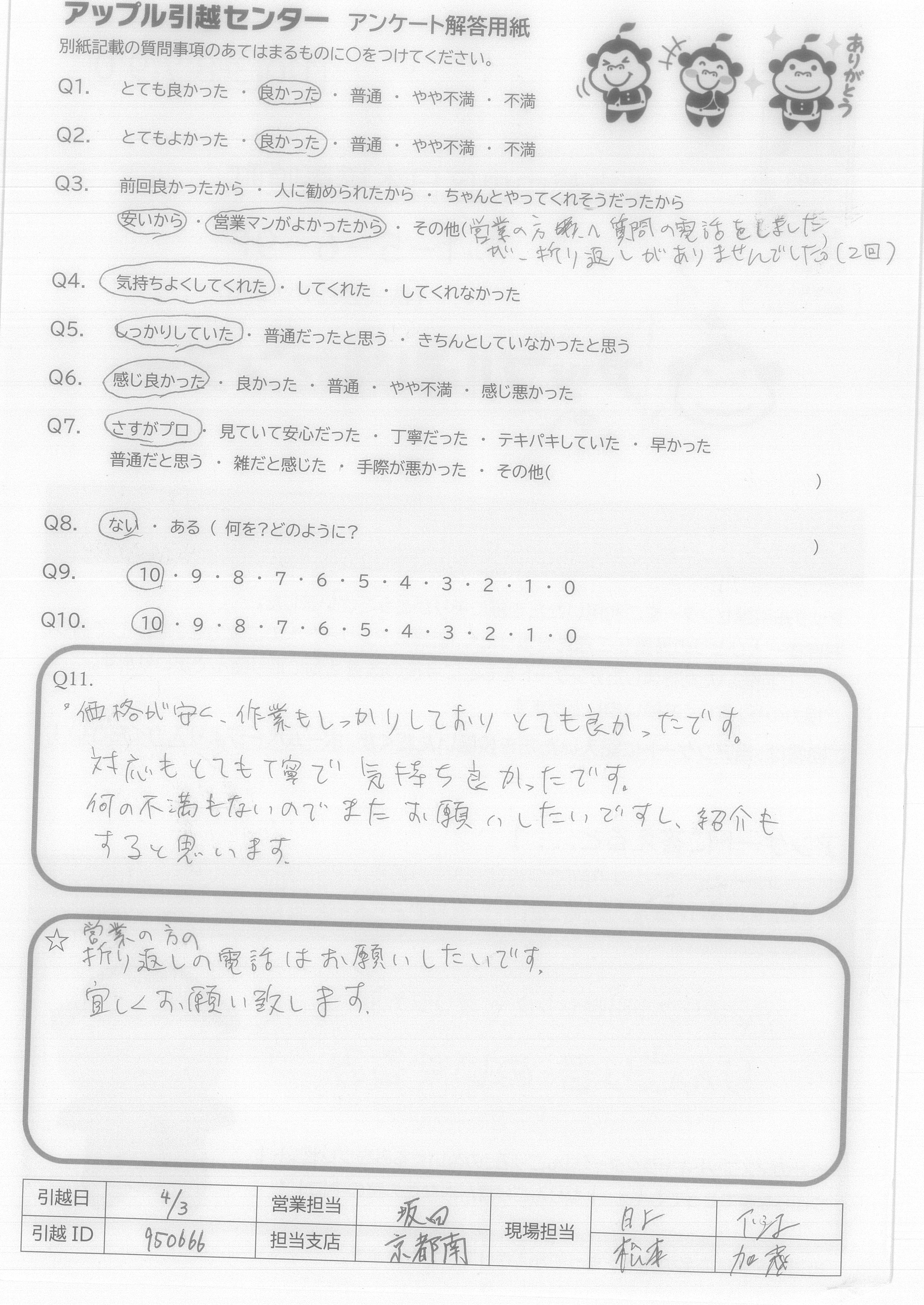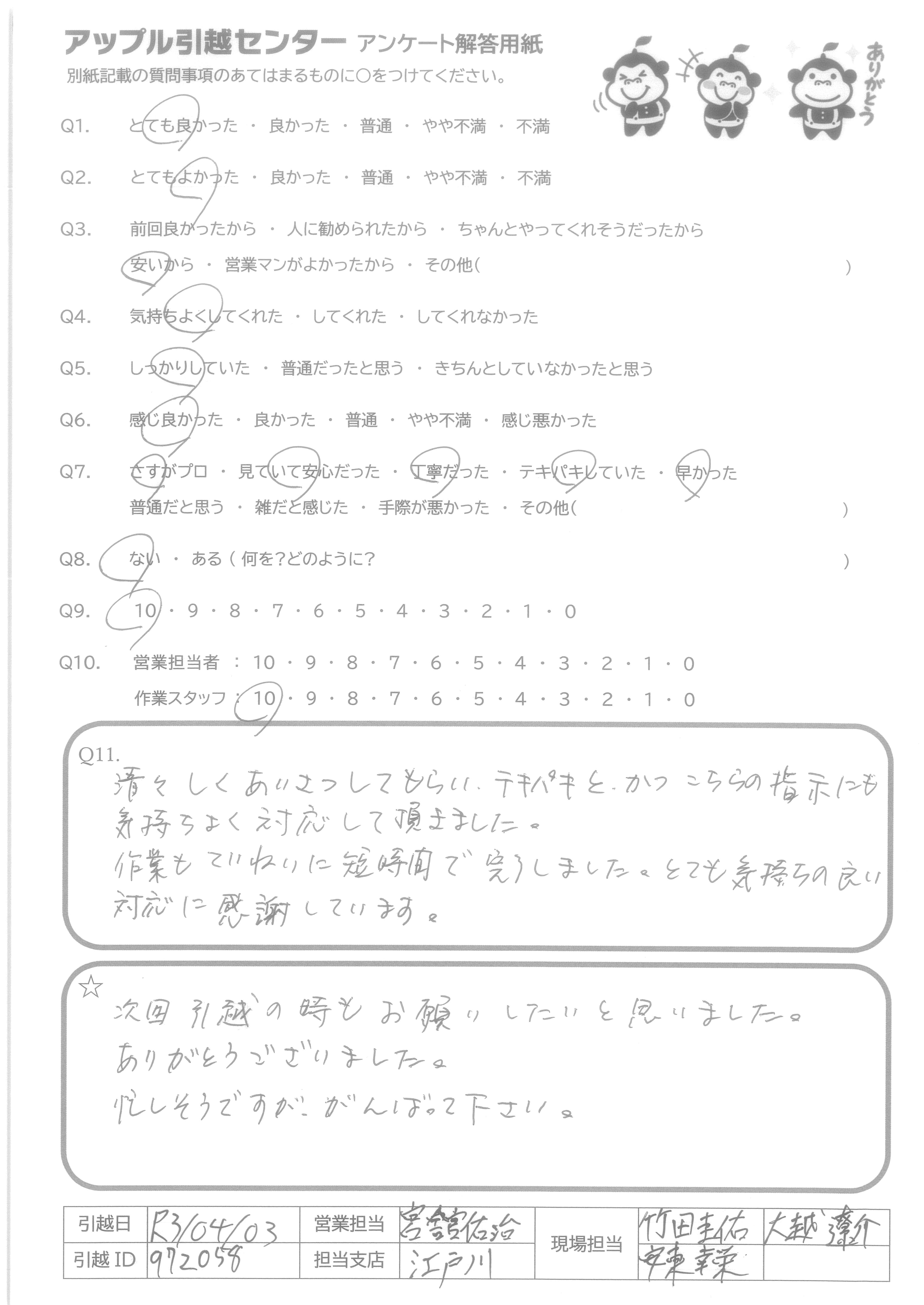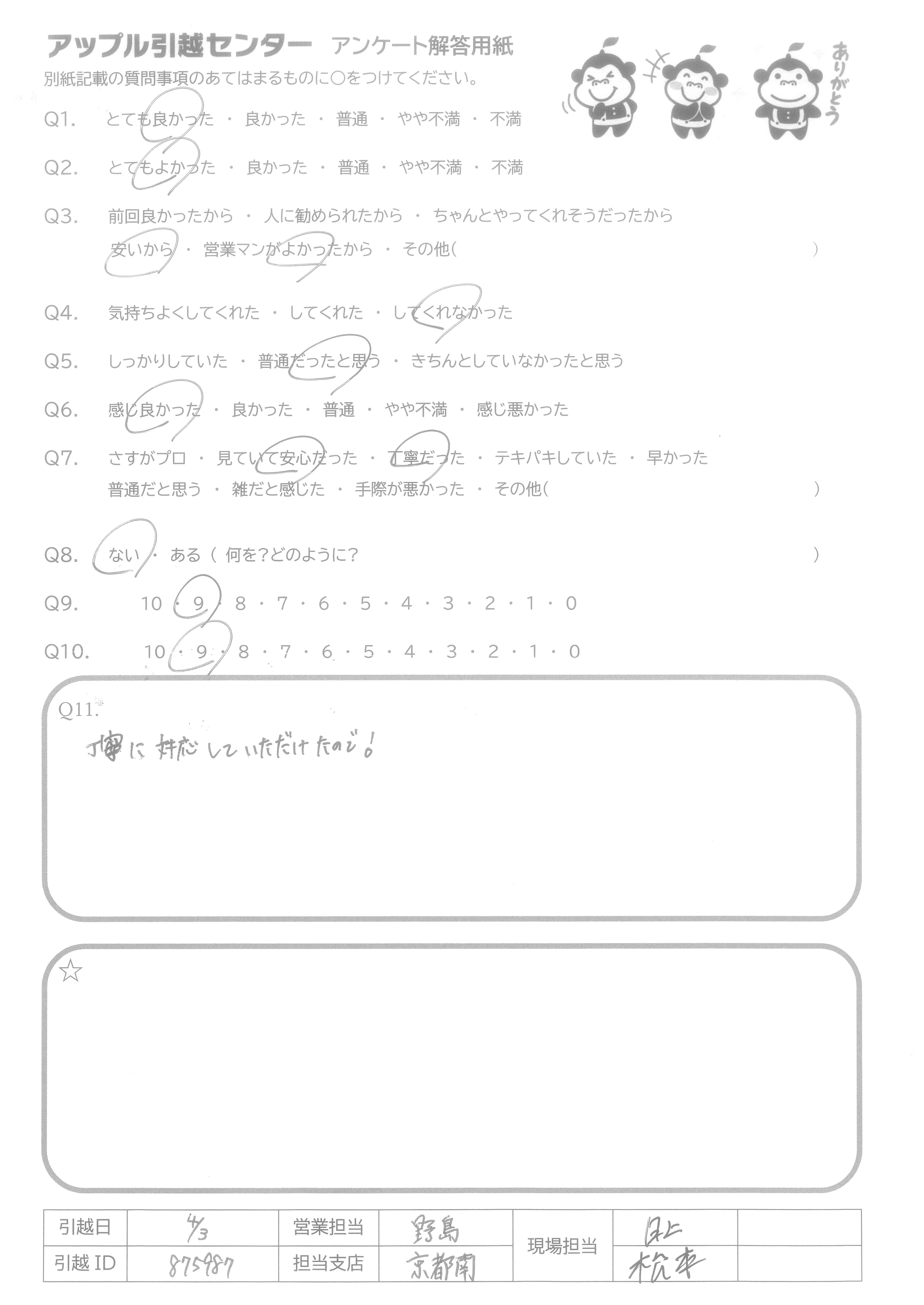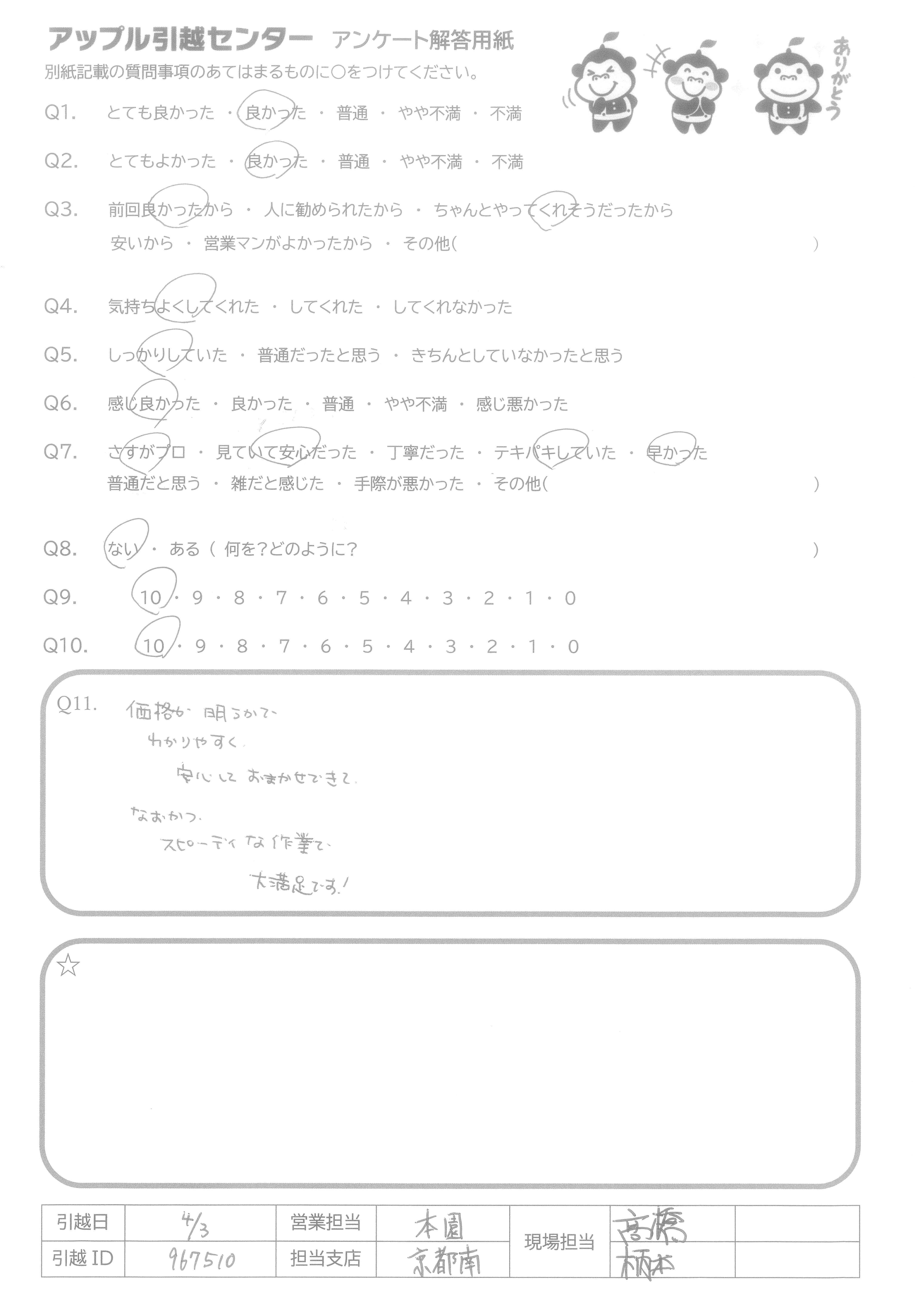 A.気持ち良く引っ越しが終わり感謝しております。ままた機会があったらぜひ利用します。