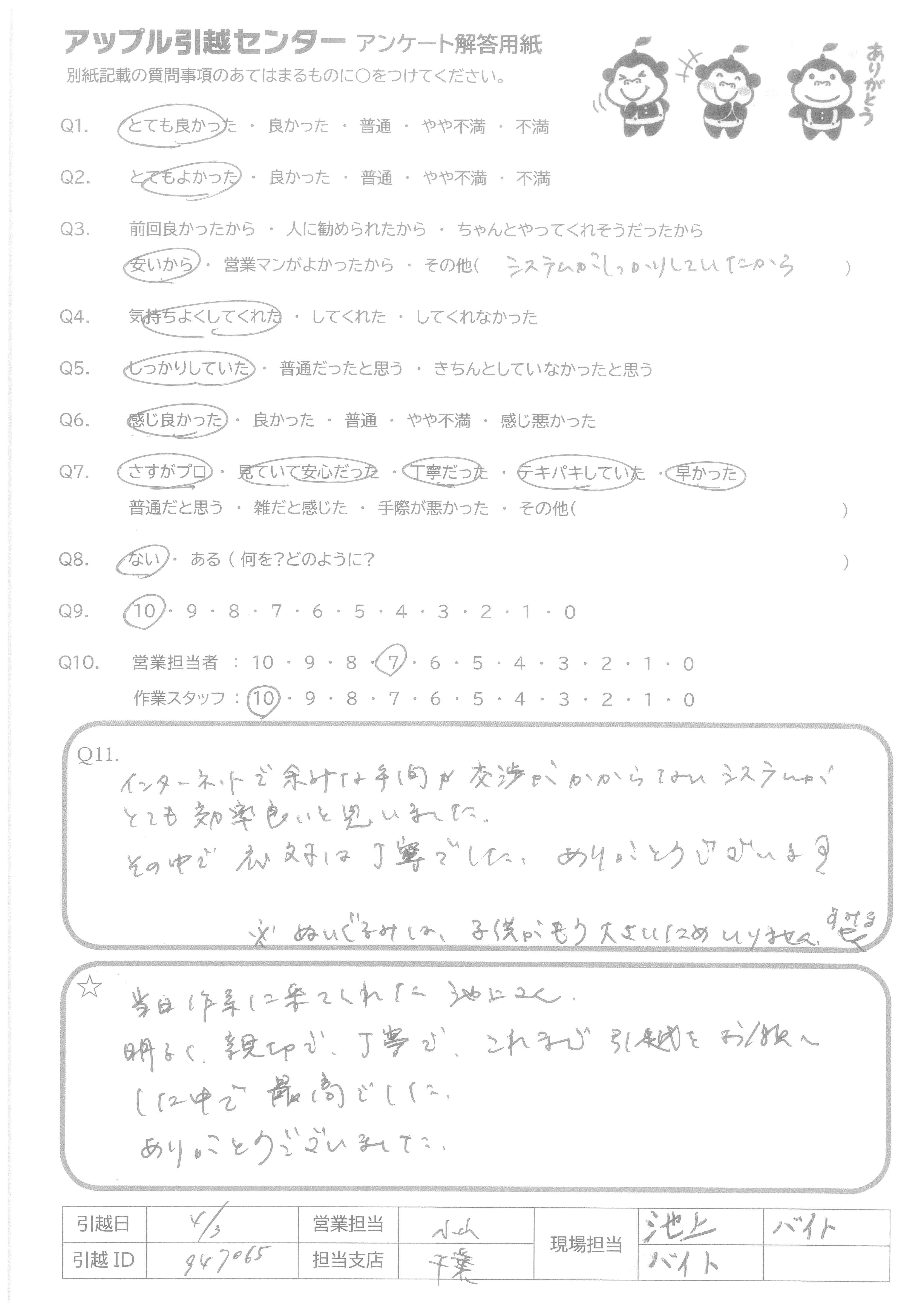 A.当日作業に来てくれた池上さん、明るく親切で、丁寧で、これまで引越をお願いした中で最高でした。 ありがとうございました。