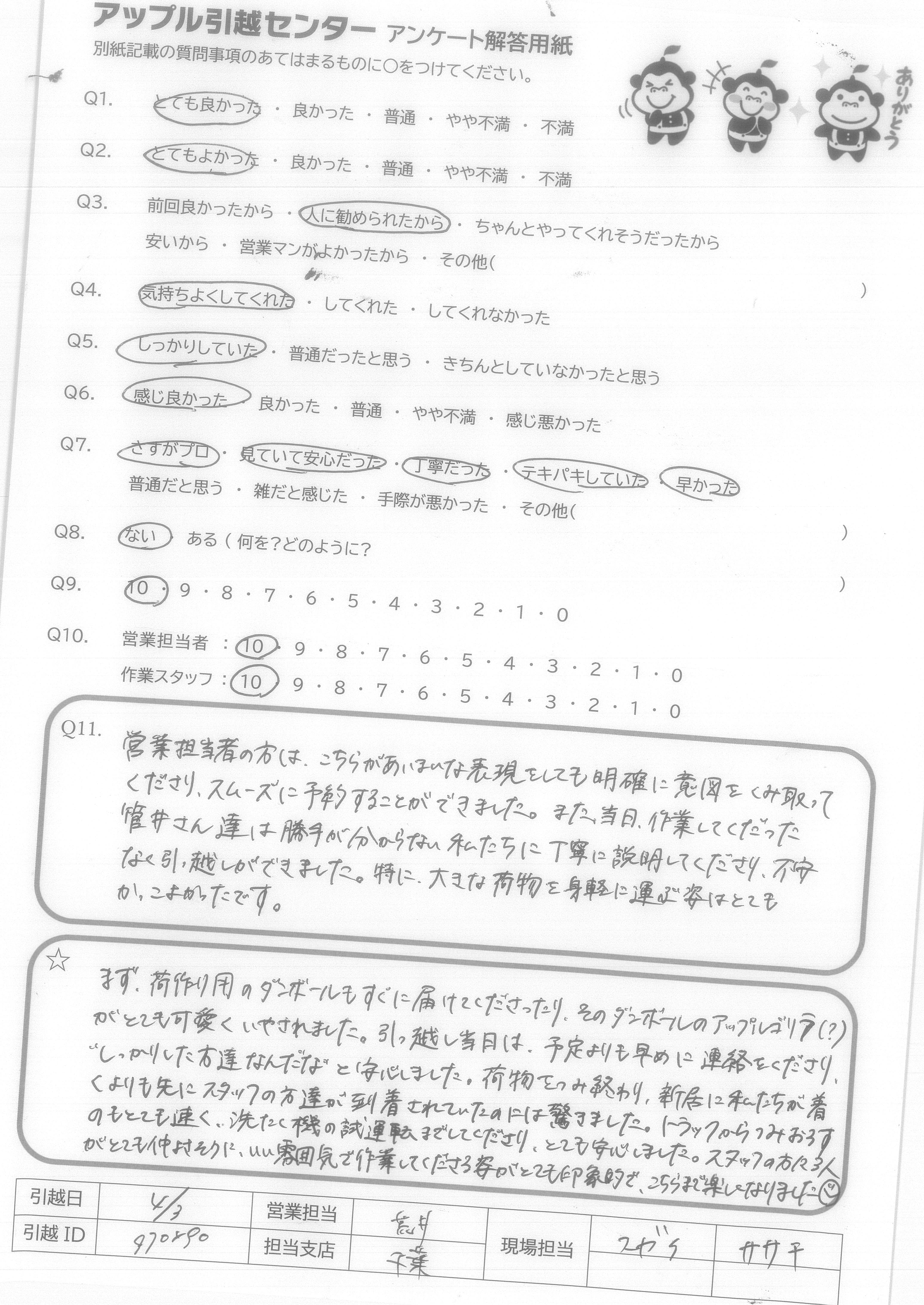 A.まず、荷作り用の段ボールもすぐに届けてくださったり、そのダンボールのアップルゴリラ(?)がとても可愛くていやされました。引っ越し当日は、予定よりも早めに連絡をくださり、”しっかりした方達なんだな”と安心しました。荷物をつみ終わり、新居に私たちが着くよりも先にスタッフの方達が到着されていたのには驚きました。トラックからつみおろすのもとても速く、洗たく機 の試運転までしてくださり、とても安心しました。スタッフの方々3人がとても仲よさそうに、いい雰囲気で作業してくださる姿がとても印象的、こちらまで楽しくなりました