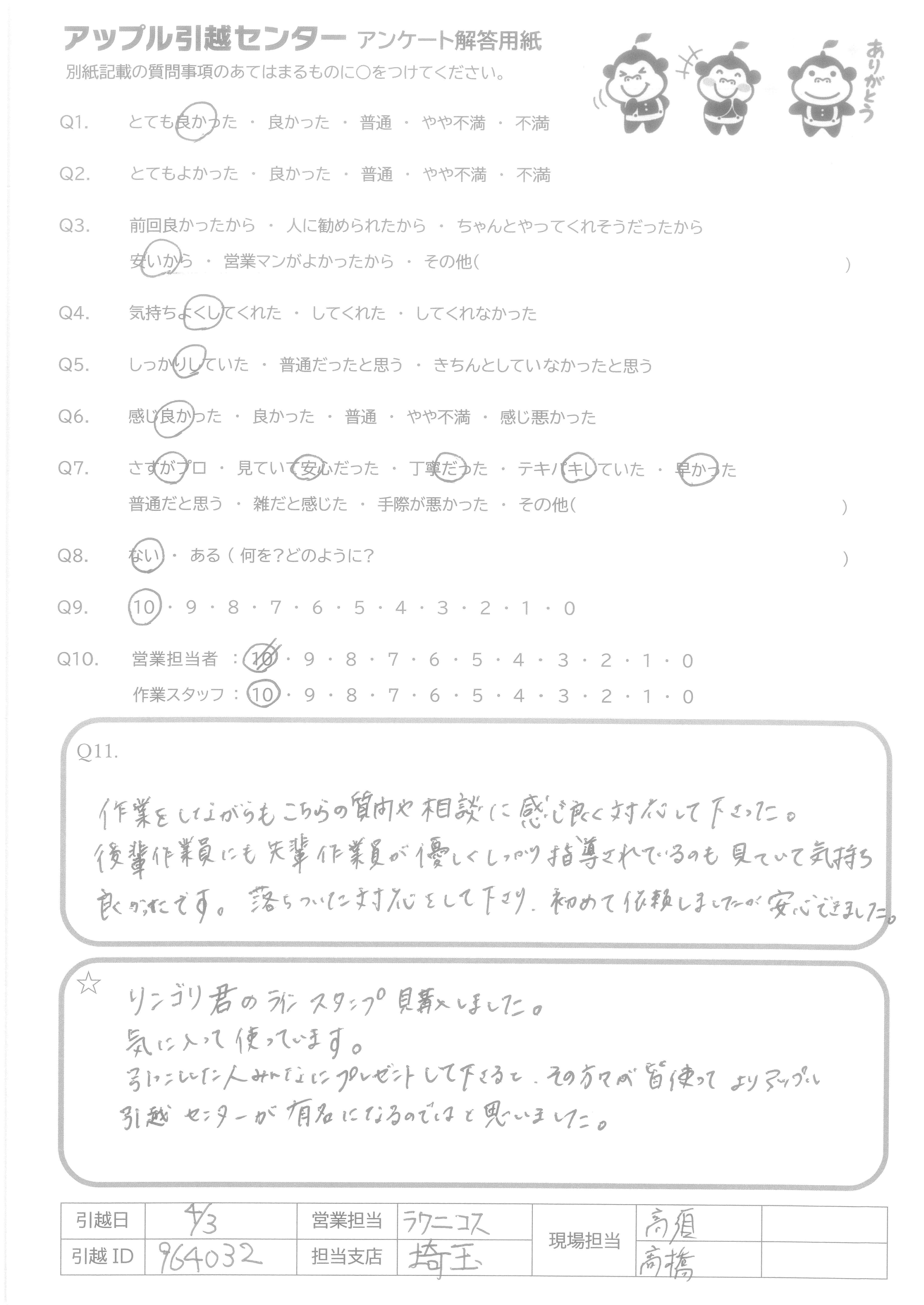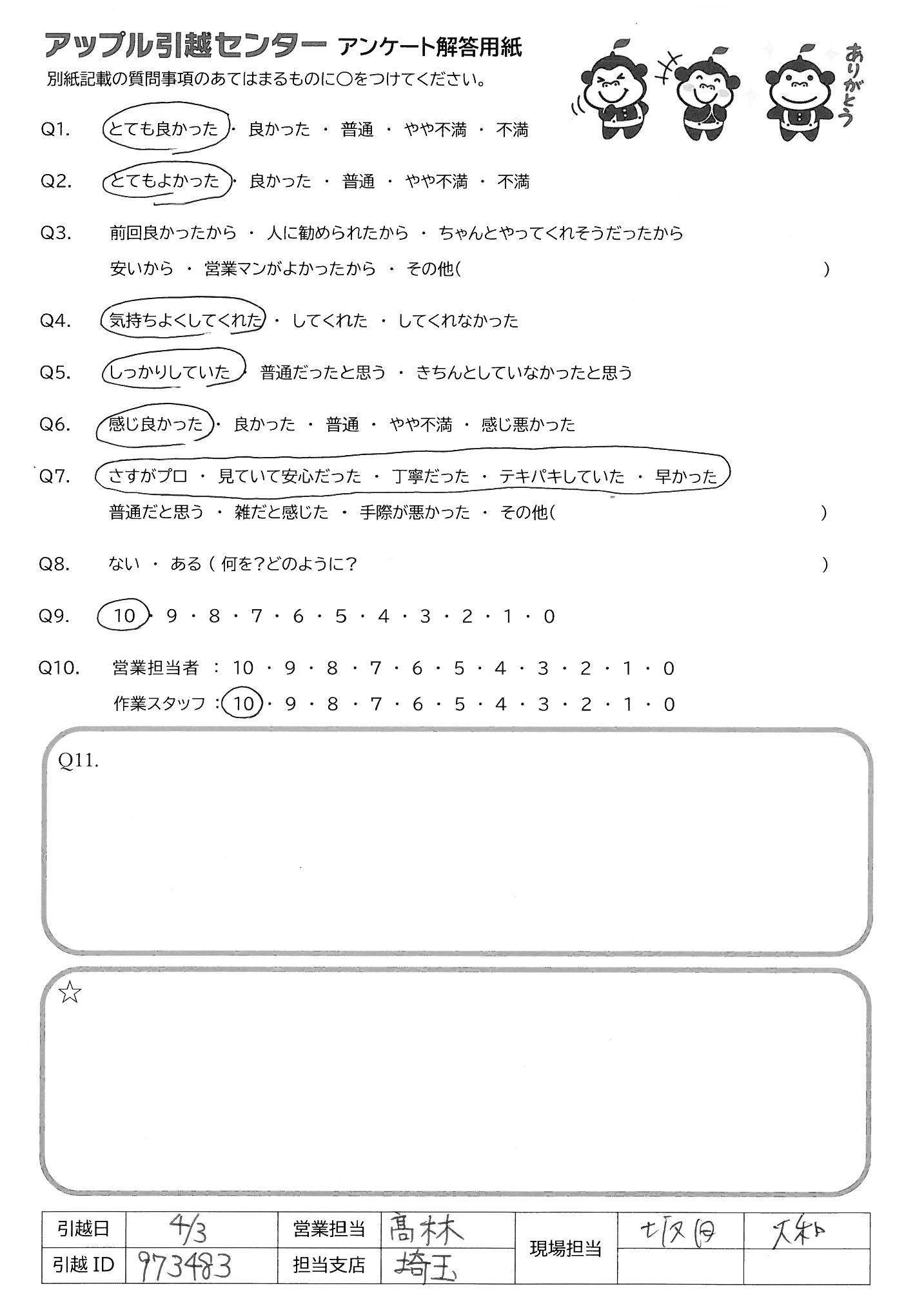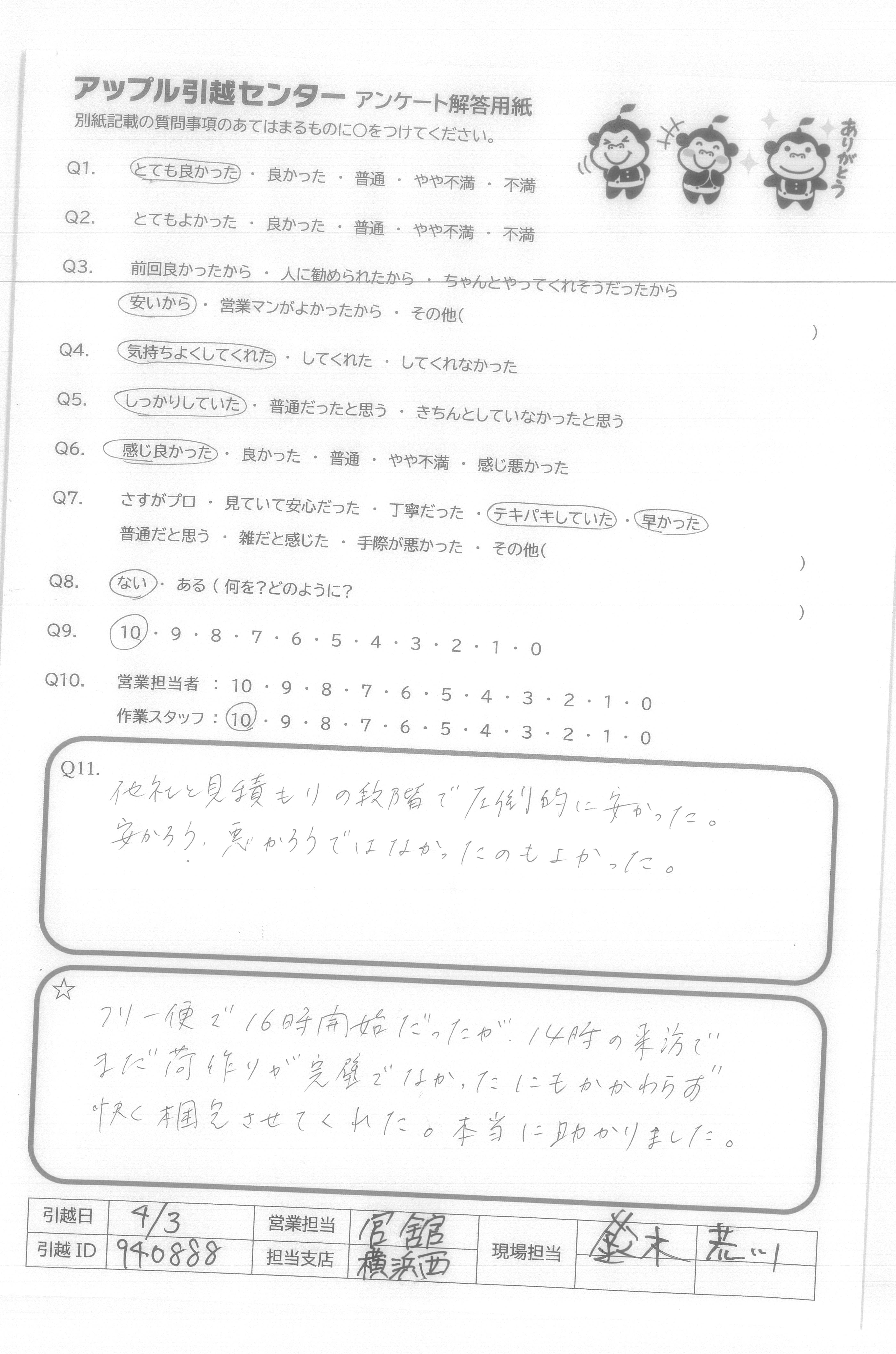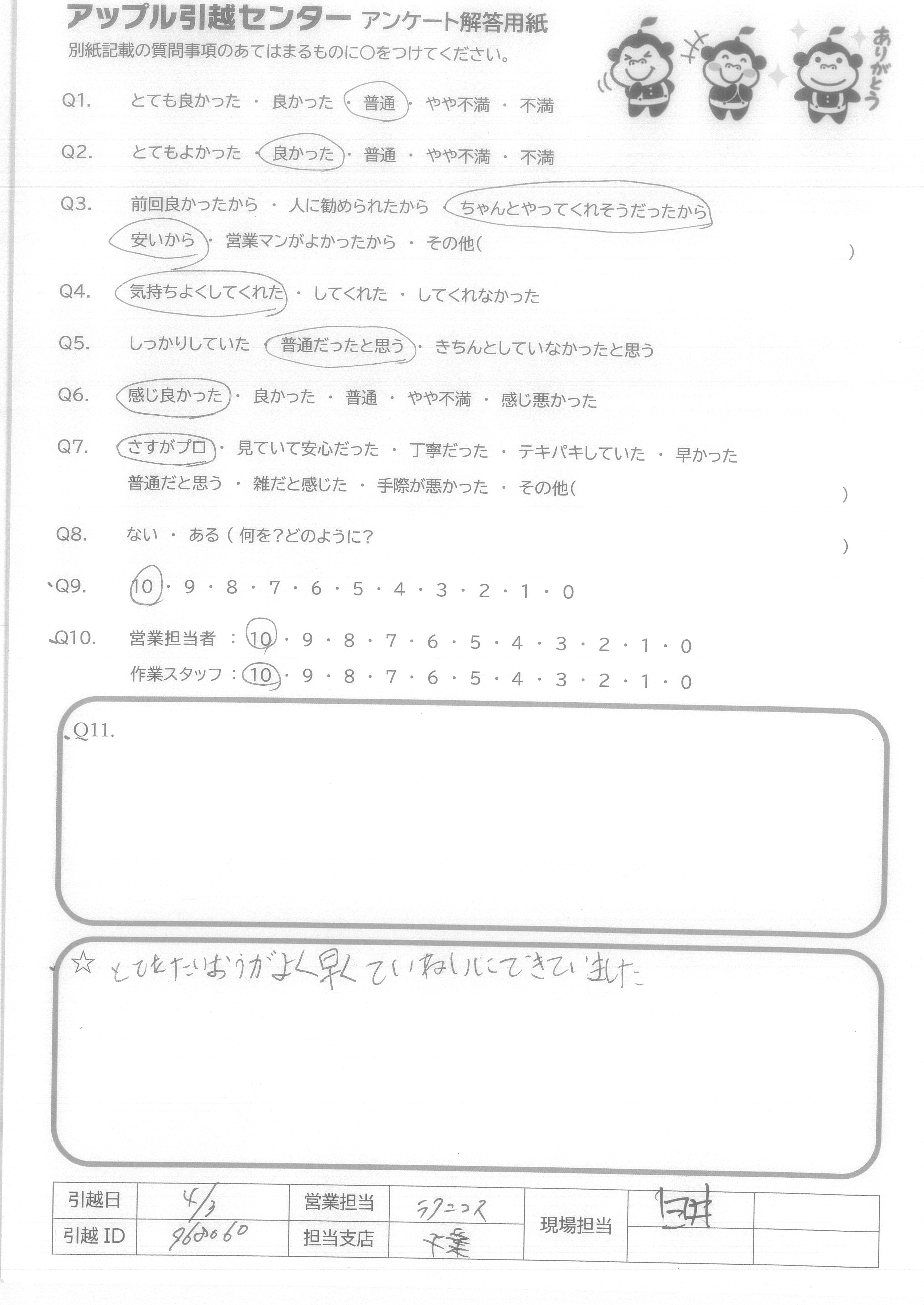 A.みなさんの感じもよく、作業も早く、無事に引越しが終わりました! ありがとうございました!