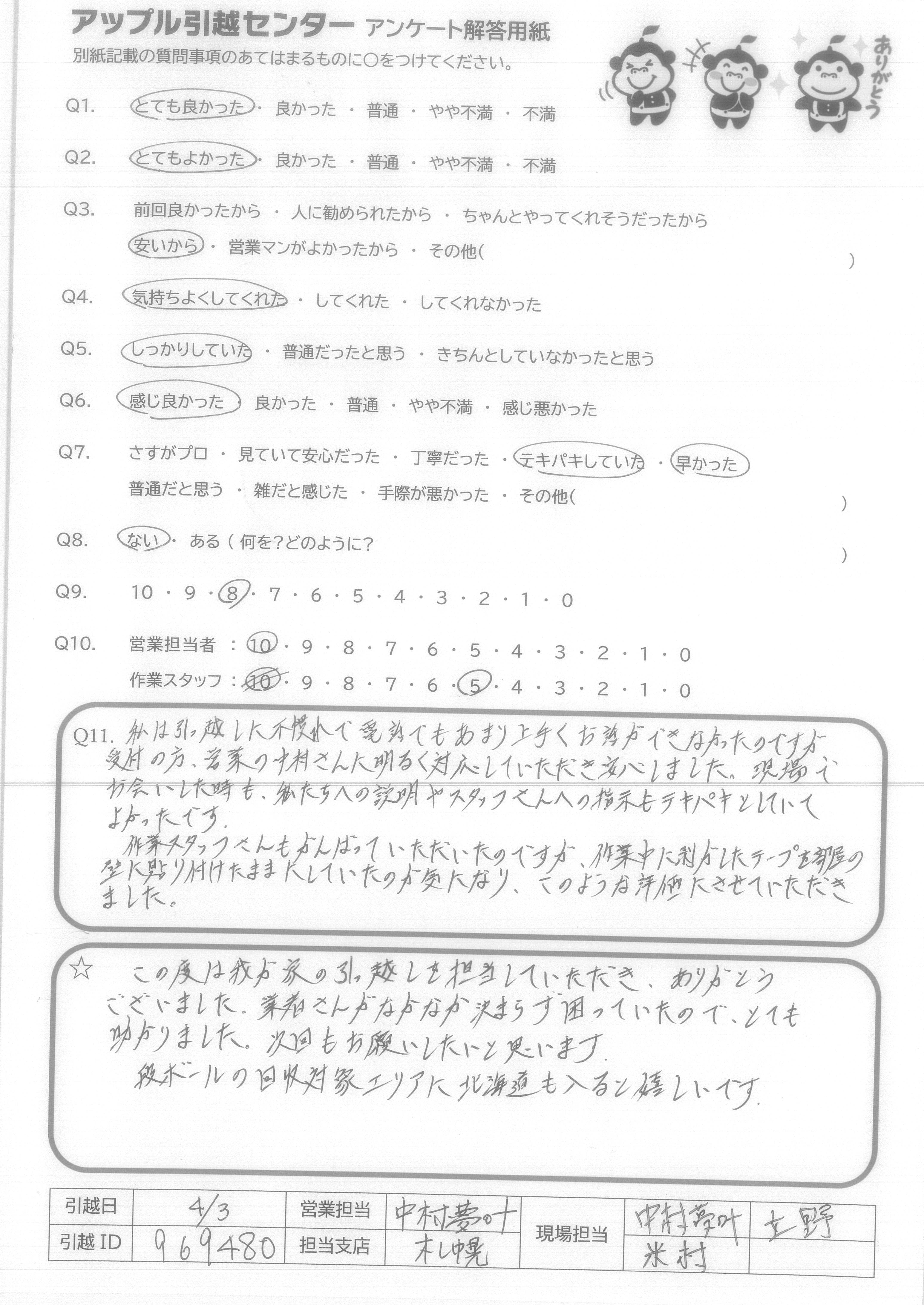 A.私は引っ越しに不慣れで電話でもあまり上手くお話ができなかったのですが、受付の方、営業の中村さんに明るく対応していただき安心しました。現場でお会いした時も、私たちへの説明やスタッフさんへの指示もテキパキとしていてよかったです。 作業スタッフさんもがんばっていただいたのですが、作業中に剥がしたテープを部屋の壁に貼り付けたままにしていたのが気になり、このような評価にさせていただきました。