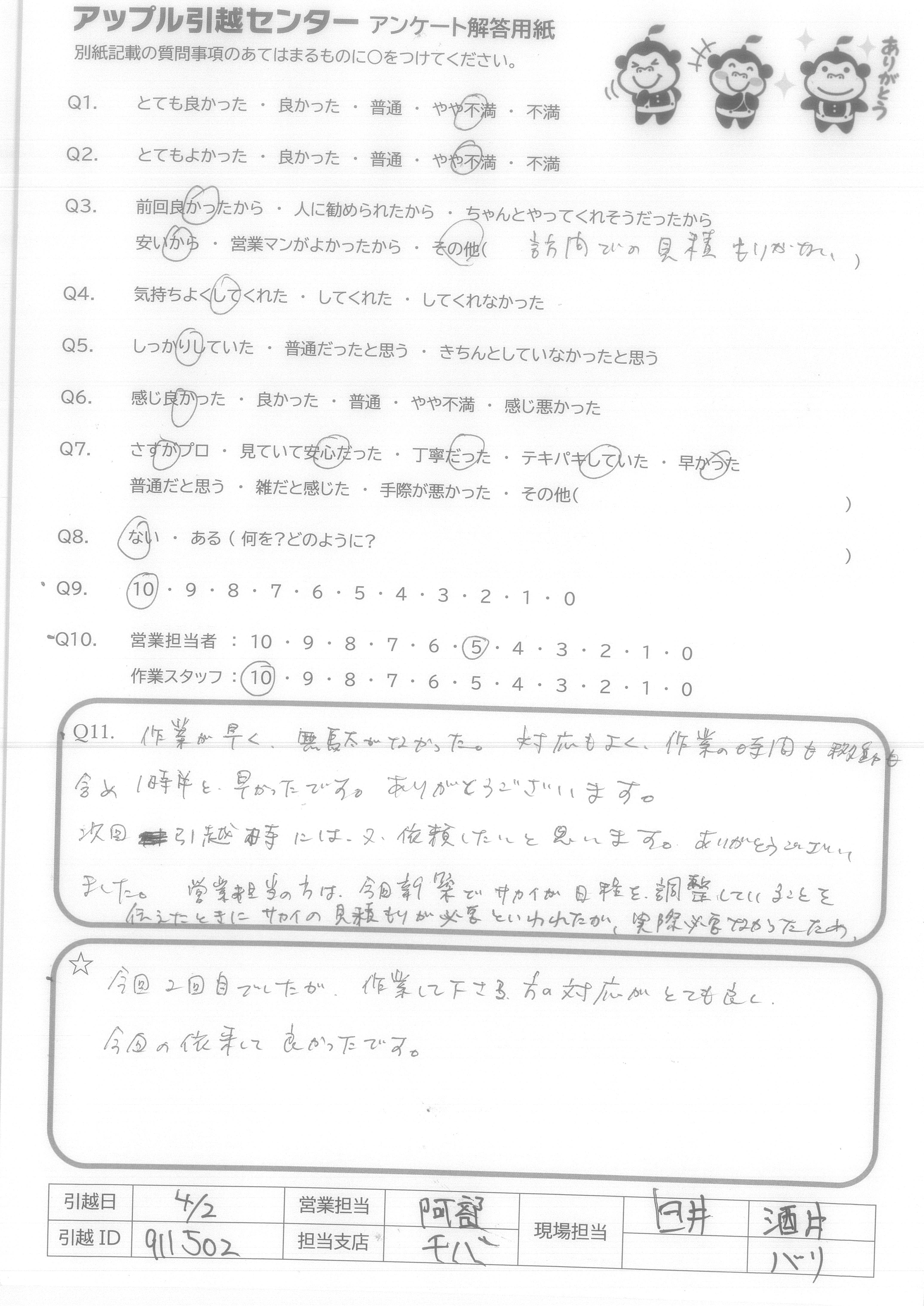 A.作業が早く、無駄がなかった。対応もよく、作業の時間も移動も含め1時半と早かったです。ありがとうございます。 次回引越時には、又、依頼したいと思います。ありがとうございました。 営業担当の方は、今回新築でサカイが日程を、調整していることを伝えたときにサカイの見積もりが必要といわれたが、実際必要なかったため。