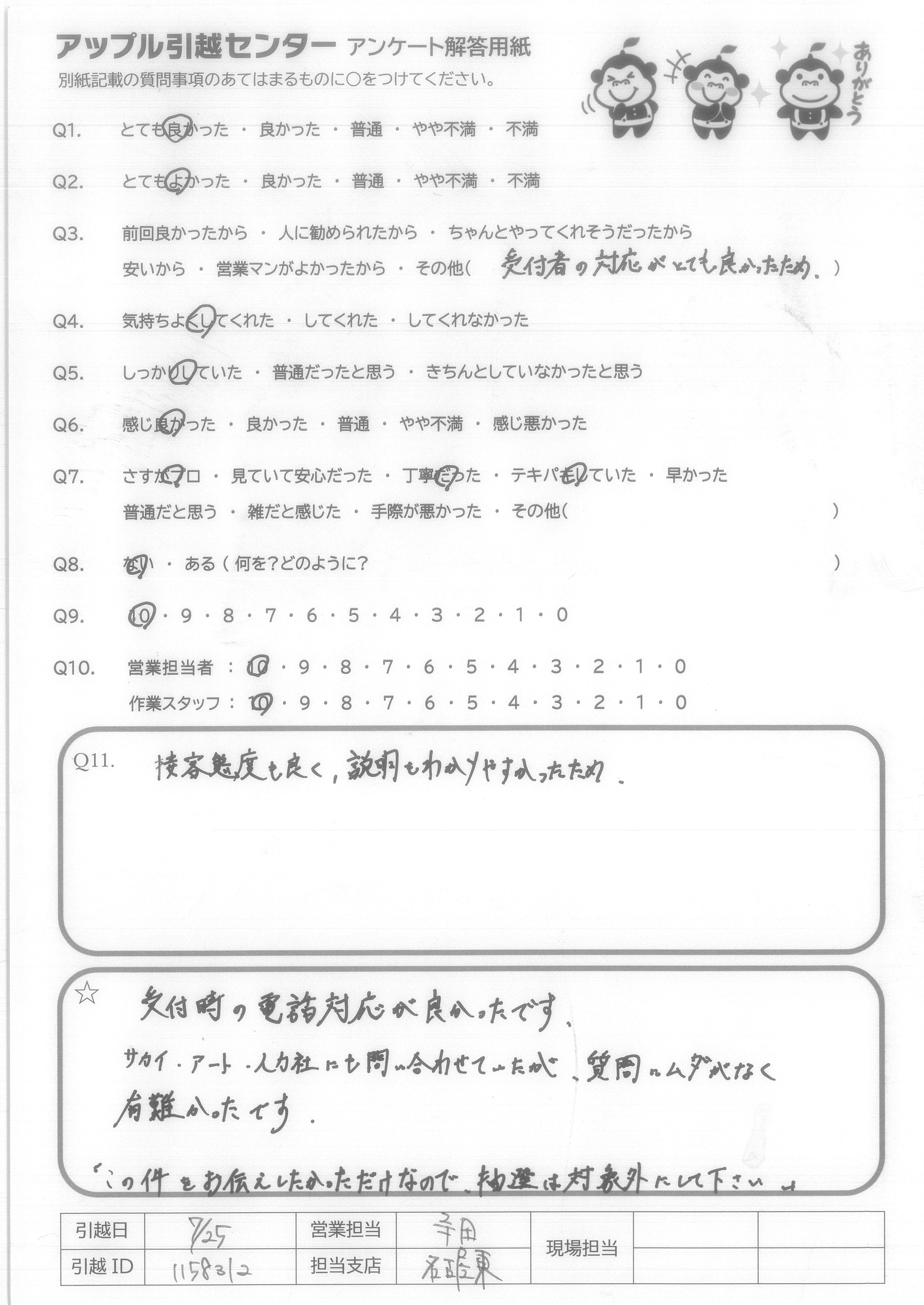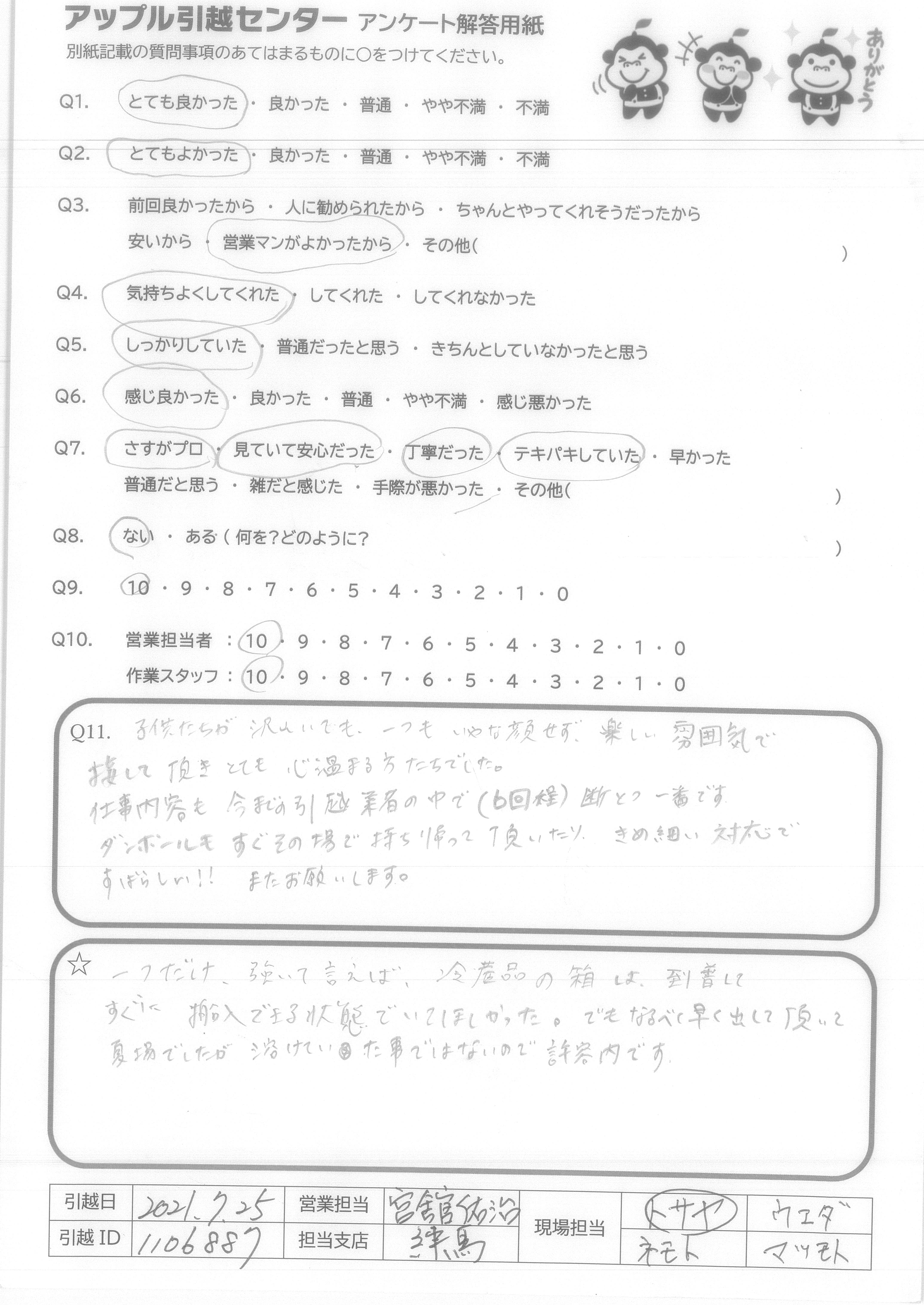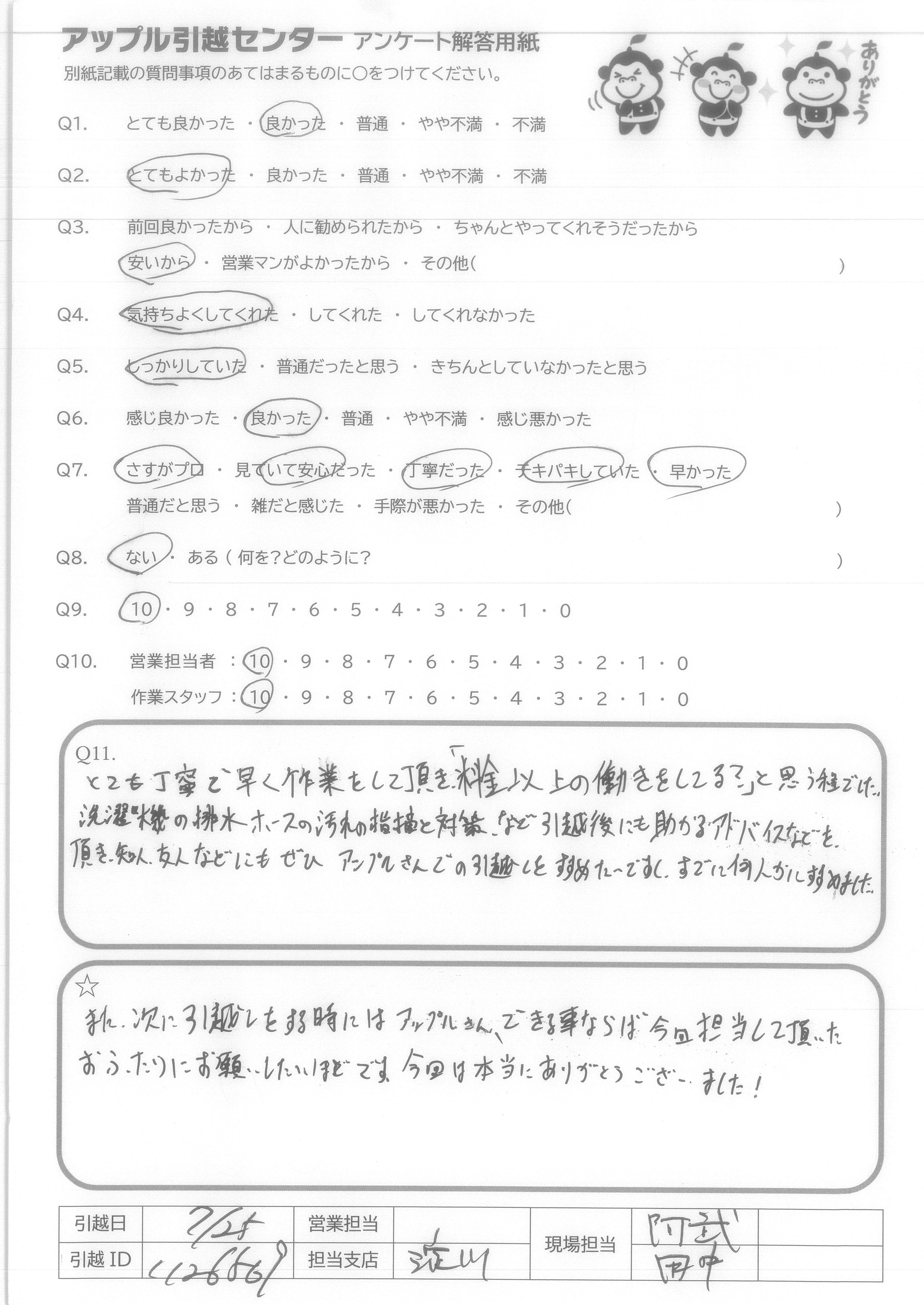 A.また、次に引越しをする時にはアップルさん、できる事ならば今回担当して頂いたおふたりにお願いしたいほどです。今回は本当にありがとうございました!