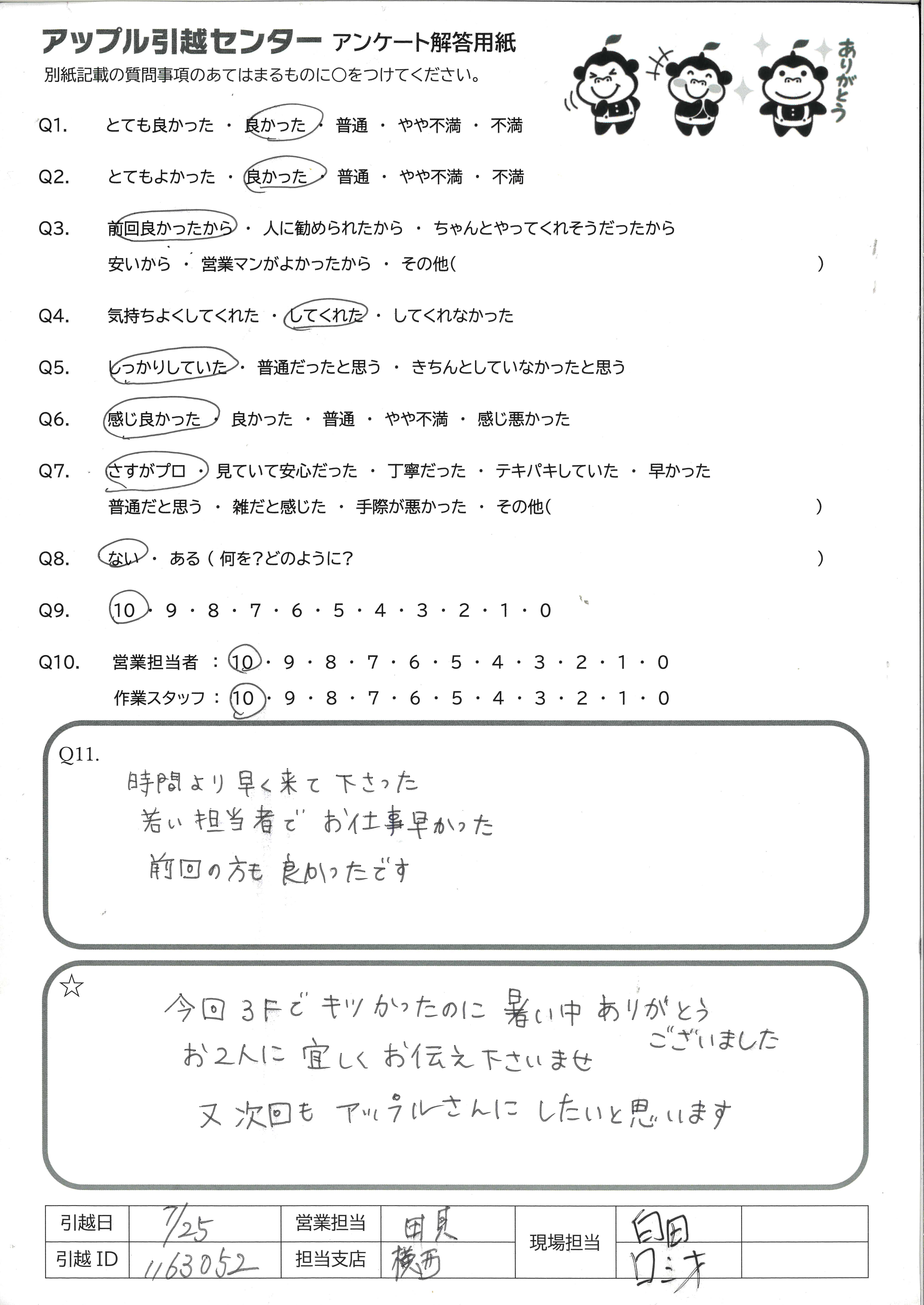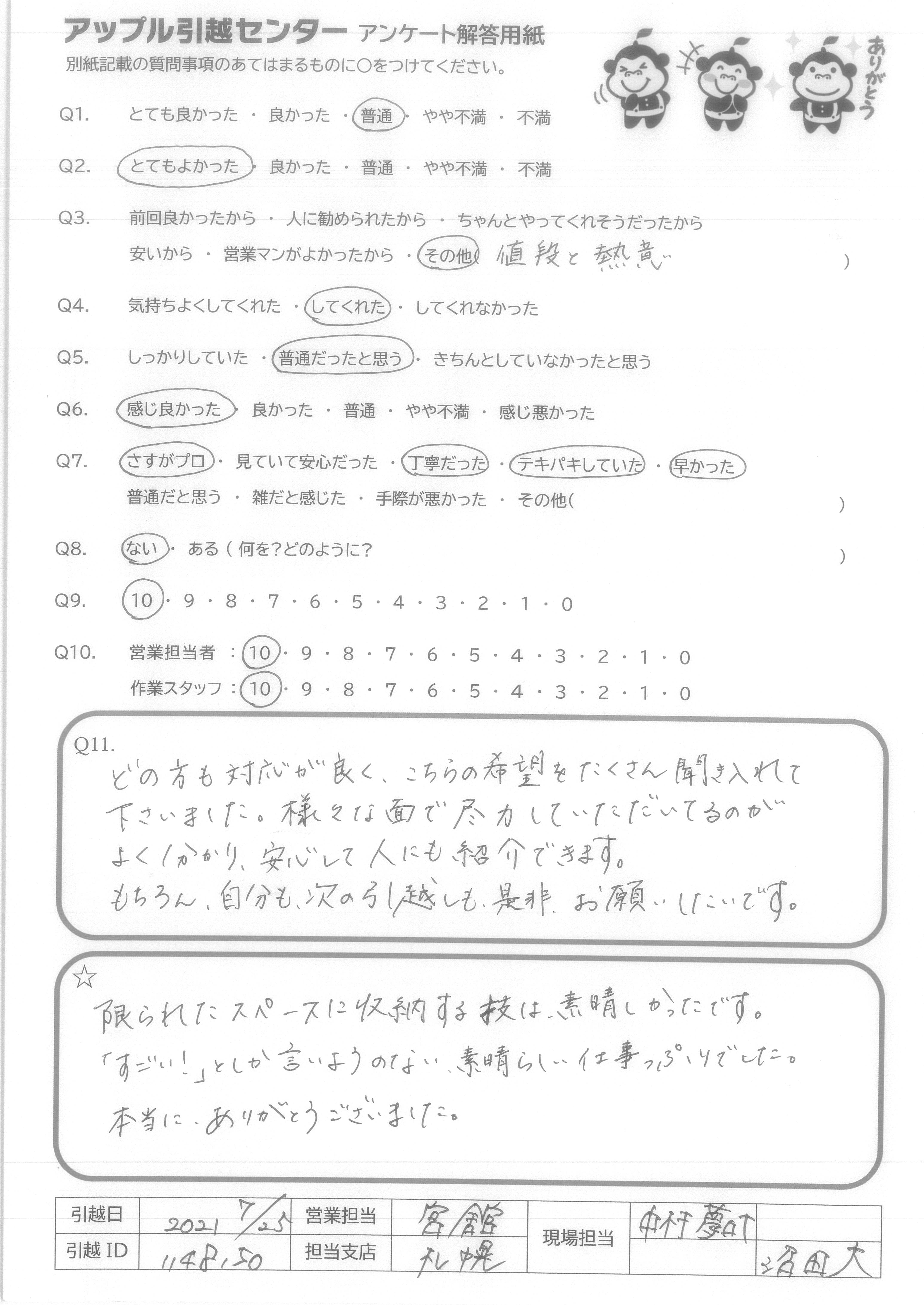 A.アップル引越しセンターにお願いして良かったと思いました。池上さん、田中さん、八木さん、本当にありがとうございました!!