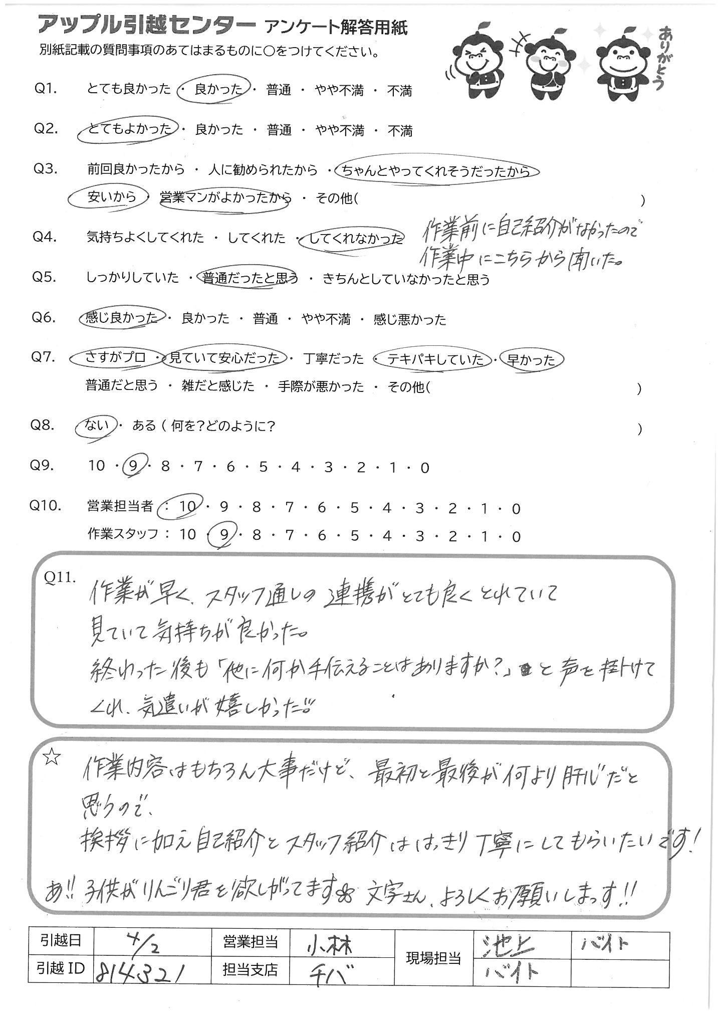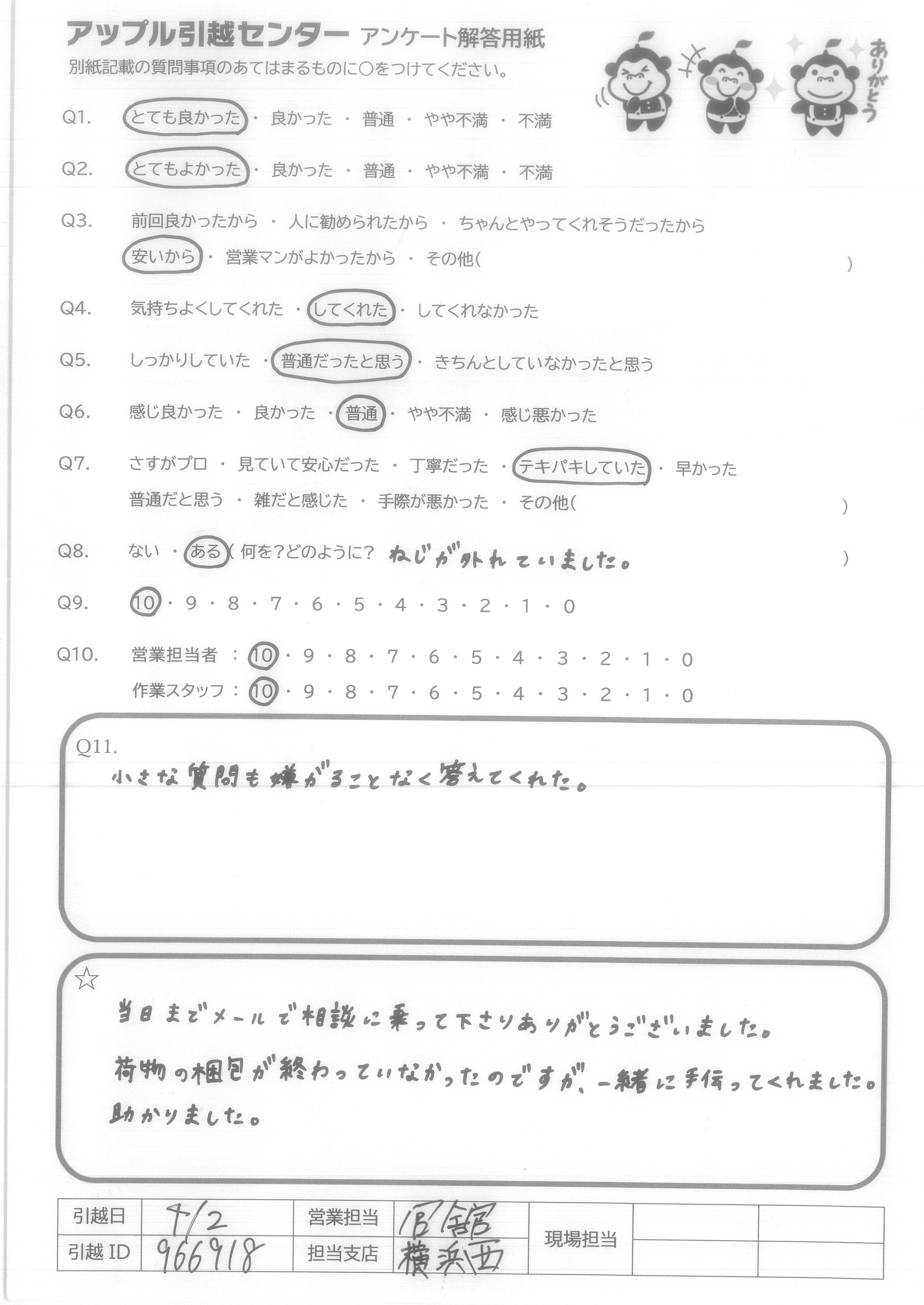 A.全体的にはよくやっていただき、満足しています。 何点か荷物の破損があったのが残念でしたが、リーダーの方がその場で不要品の無料引き取りや衣装ケースの弁済を申し出て頂いたので、大きな不満はありません。 ただ弁済について後日連絡いただけると聞いていたのですが、2週間たっても何も連絡がない状態です。 すでに収納はこちらで別に用意してしまったので、できましたらりんごりらくんのぬいぐるみなどに代えていただければ、こちらとしても助かります。 よろしくお願いいたします。