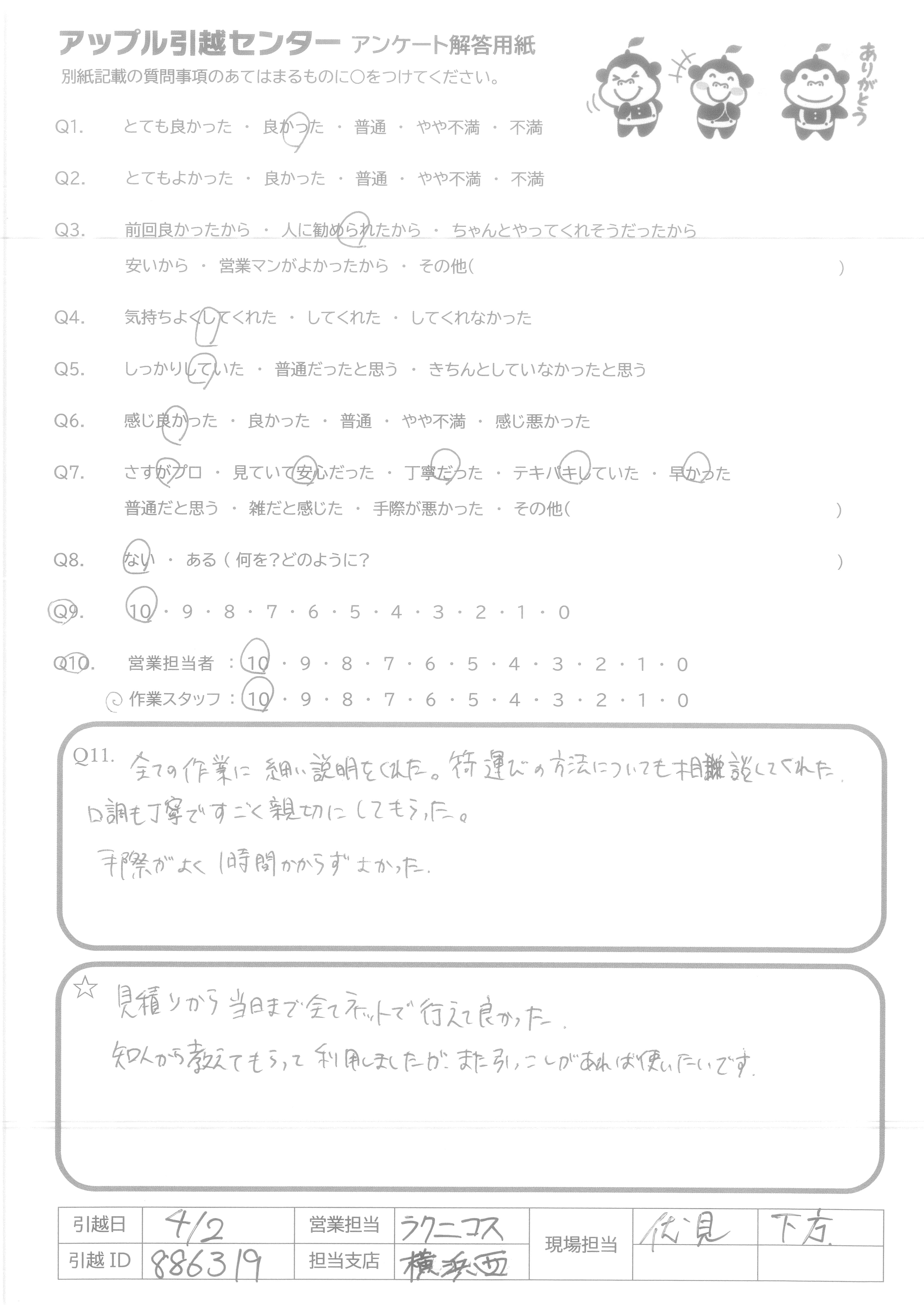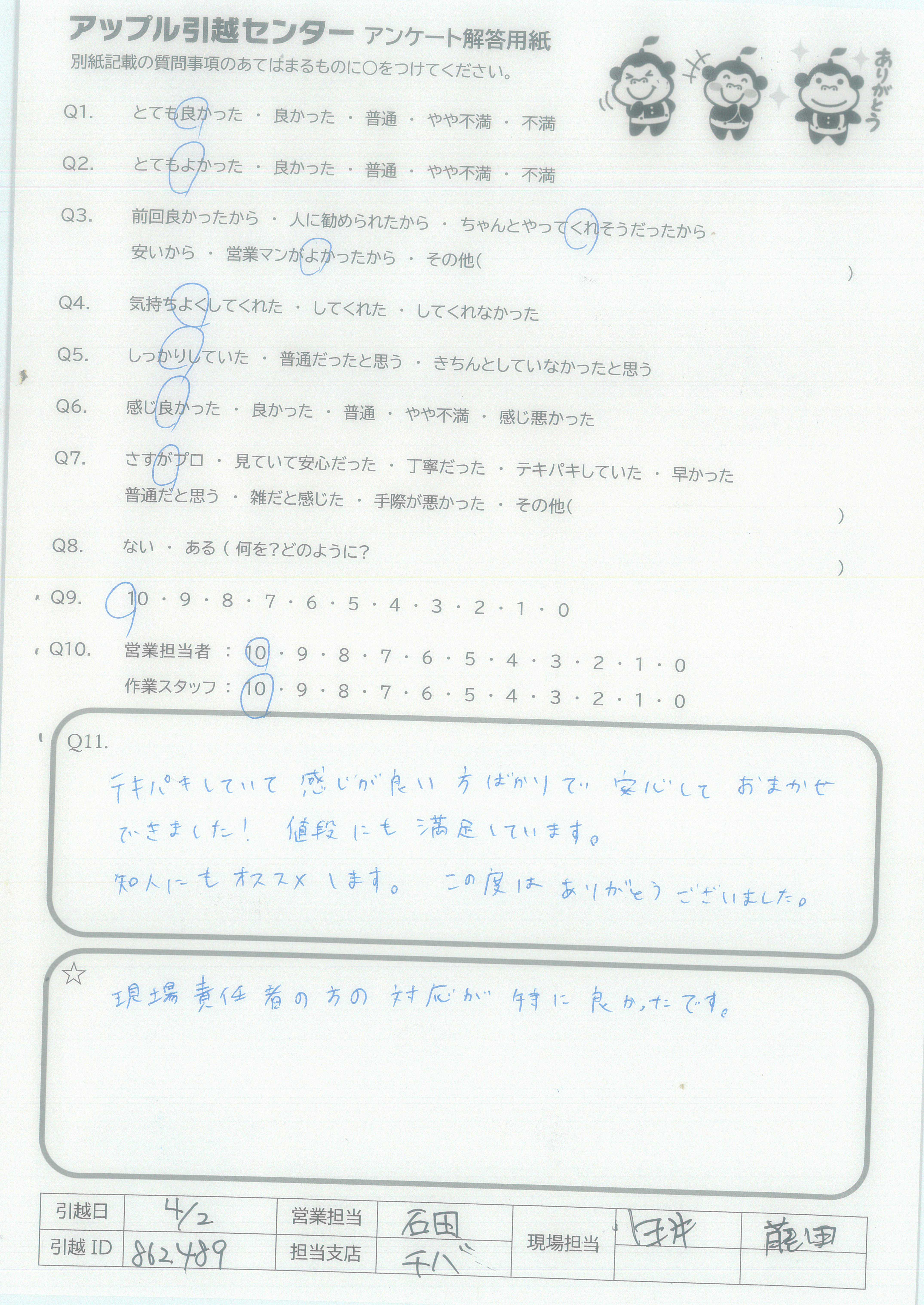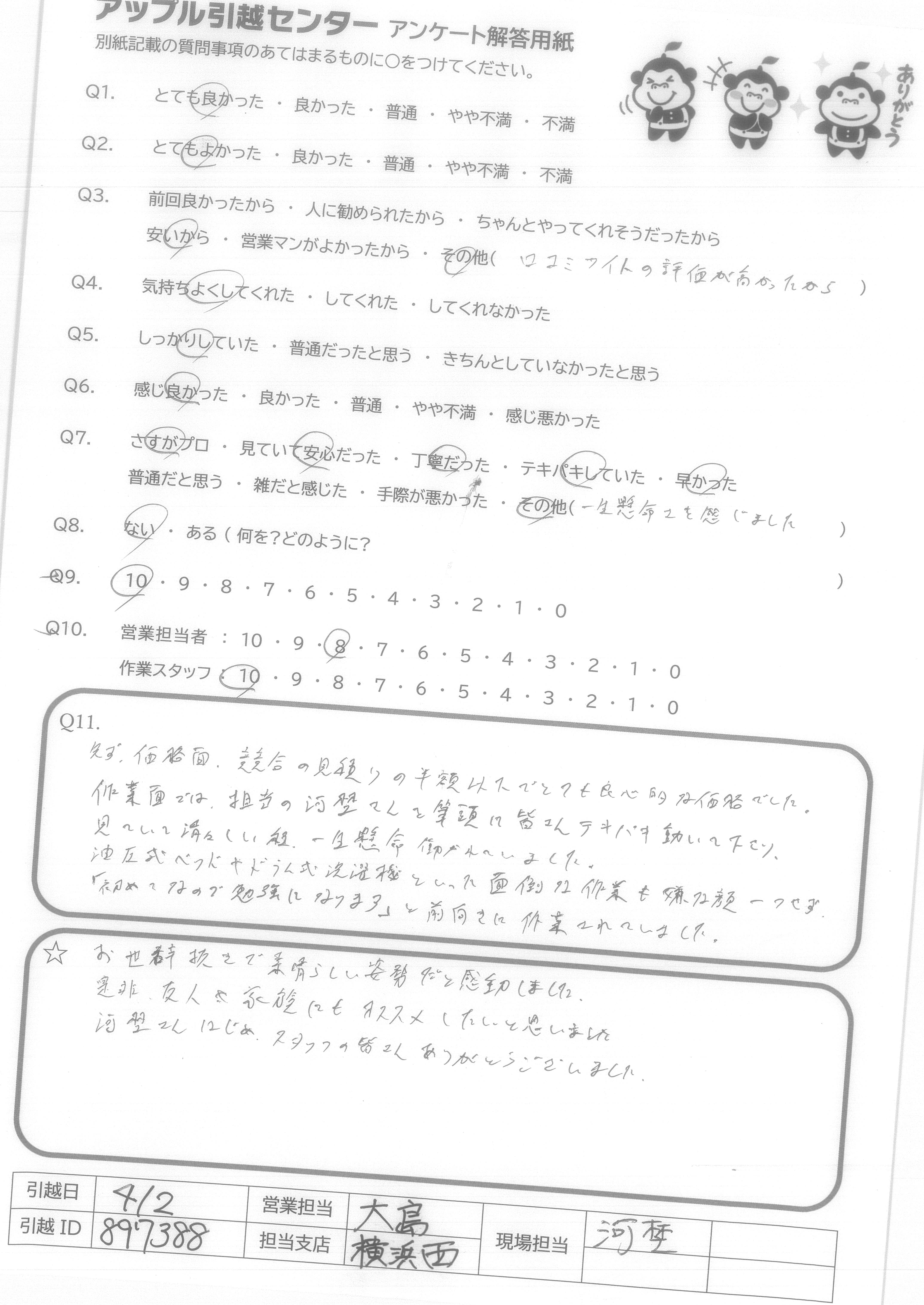 A.作業スタッフの皆さま、この度は大変丁寧に対応していただき、ありがとうございました。 初めての利用で不安でしたが、アップルさんにお願いして本当によかったです。 また機会があれば、よろしくお願いします。
