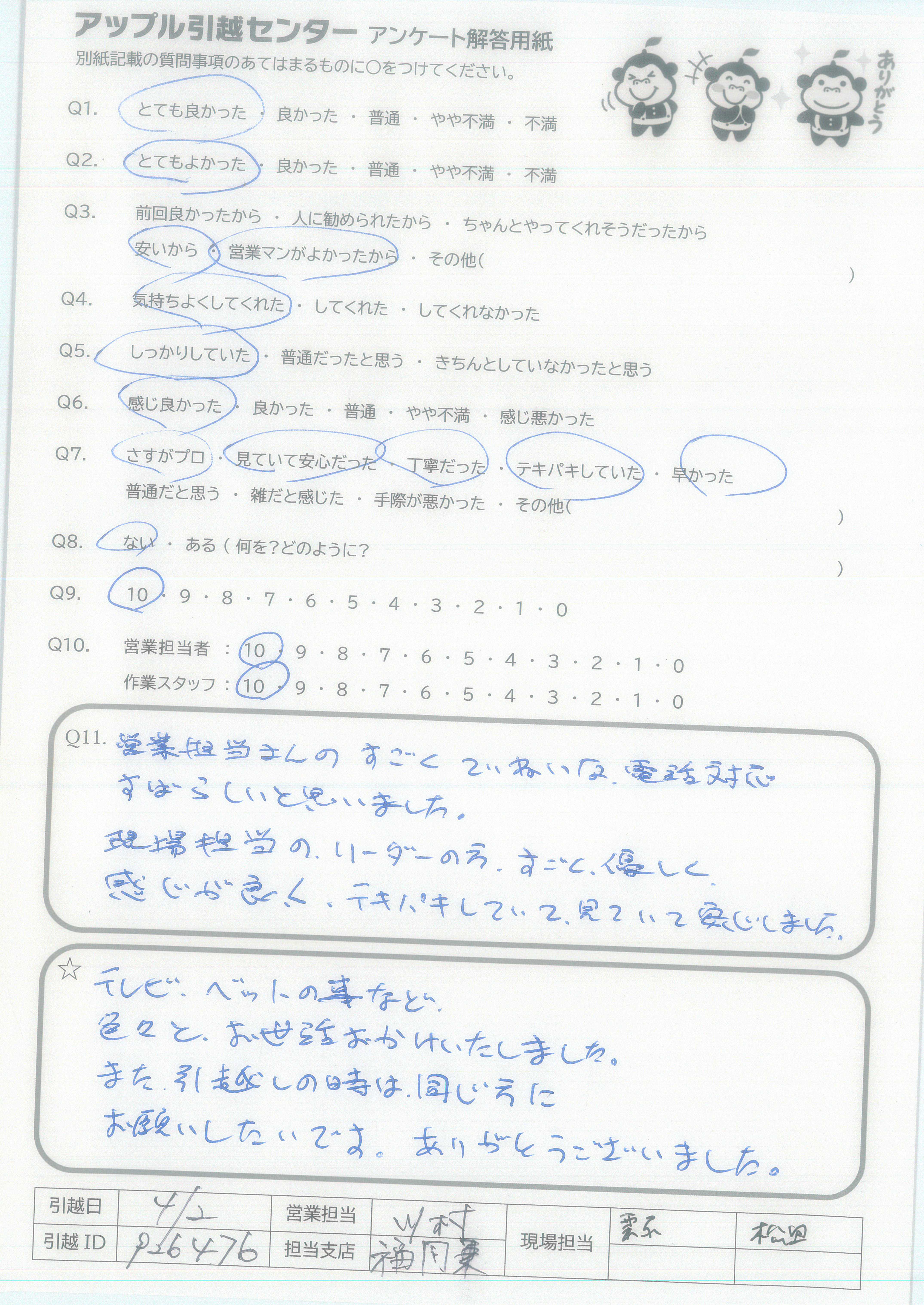 A.テレビ、ベットの事など色々とお世話おかけいたしました。 また引越しの時は同じ方にお願いしたいです。ありがとうございました。