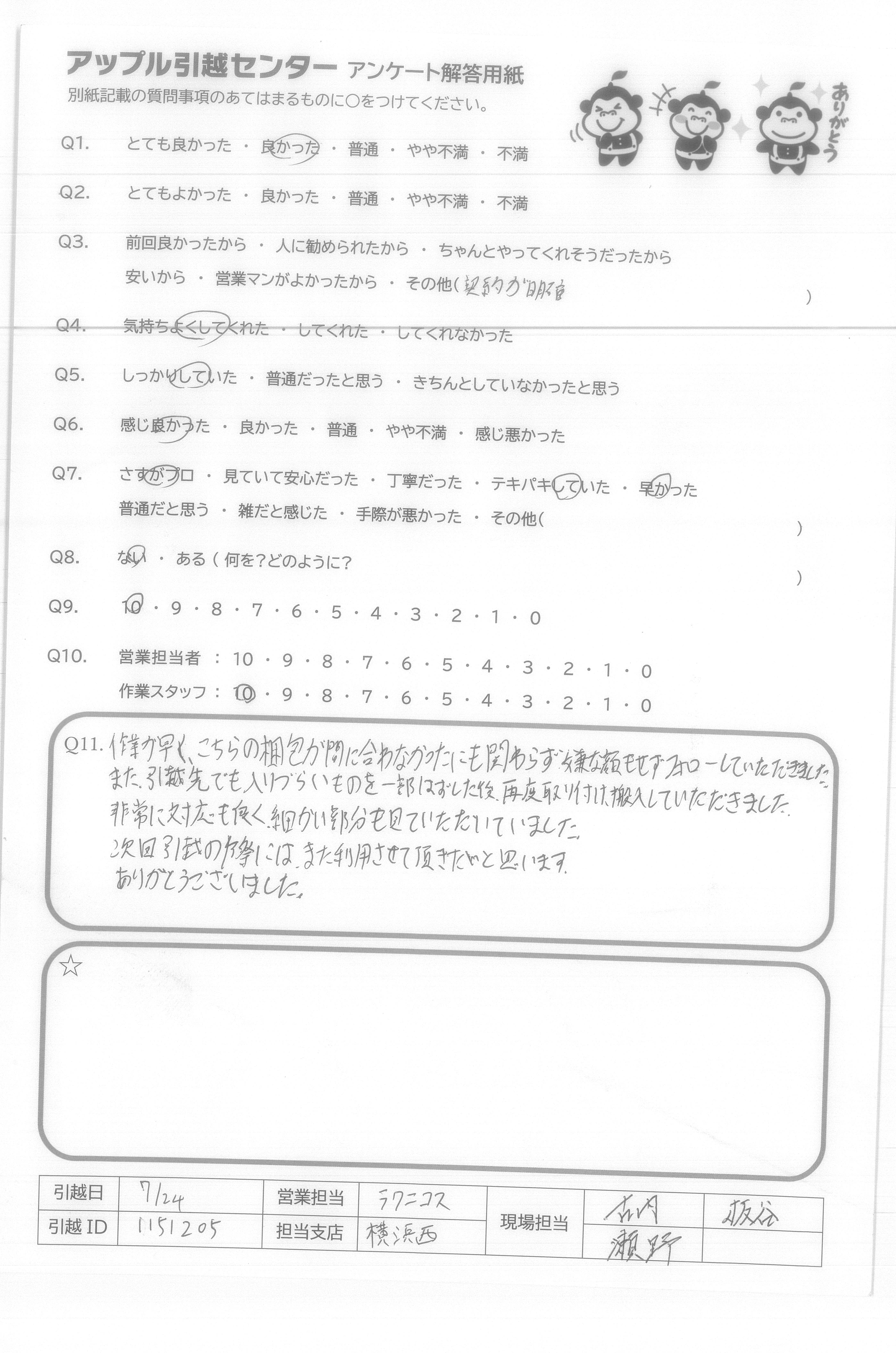 A.作業が早くこちらの梱包が間に合わなかったにも関わらず嫌な顔もせずフォローしていただきました。 また、引越先でも入りづらいものを一部はずした後、再度取り付け、搬入していただきました。非常に対応も良く細かい部分を見ていただいていました。 次回引越の際にはまた利用させて頂きたいと思います。ありがとうございました。