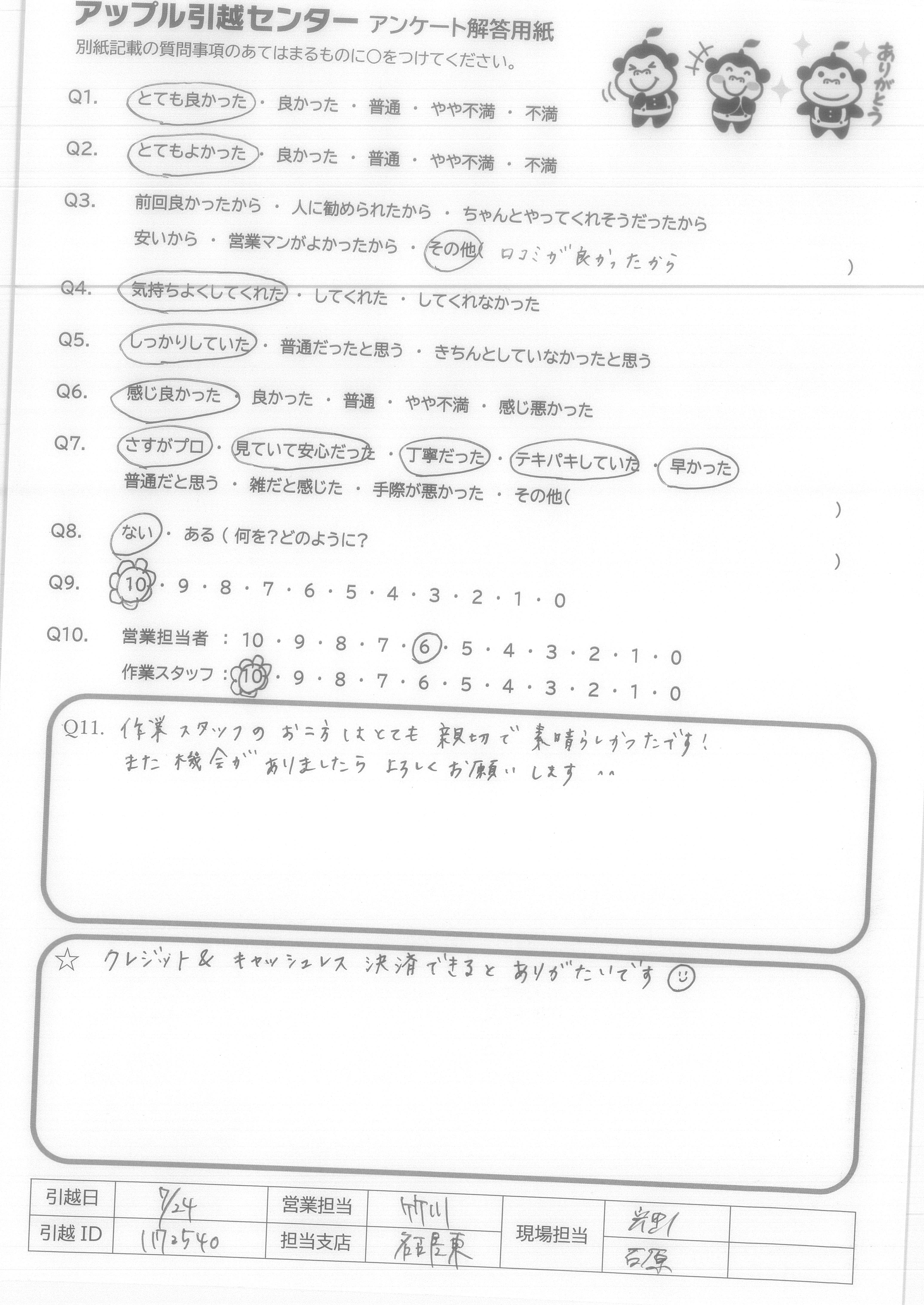 A.LINEビデオ通話で見積もりをしてくれた方、 その後の引越し確定までのTEL対応の女性の方、 LINEでの質問のやりとり、当日の作業担当の方々どなたも気持ちの良いやりとりで、すごく頼もしい感じがしました。