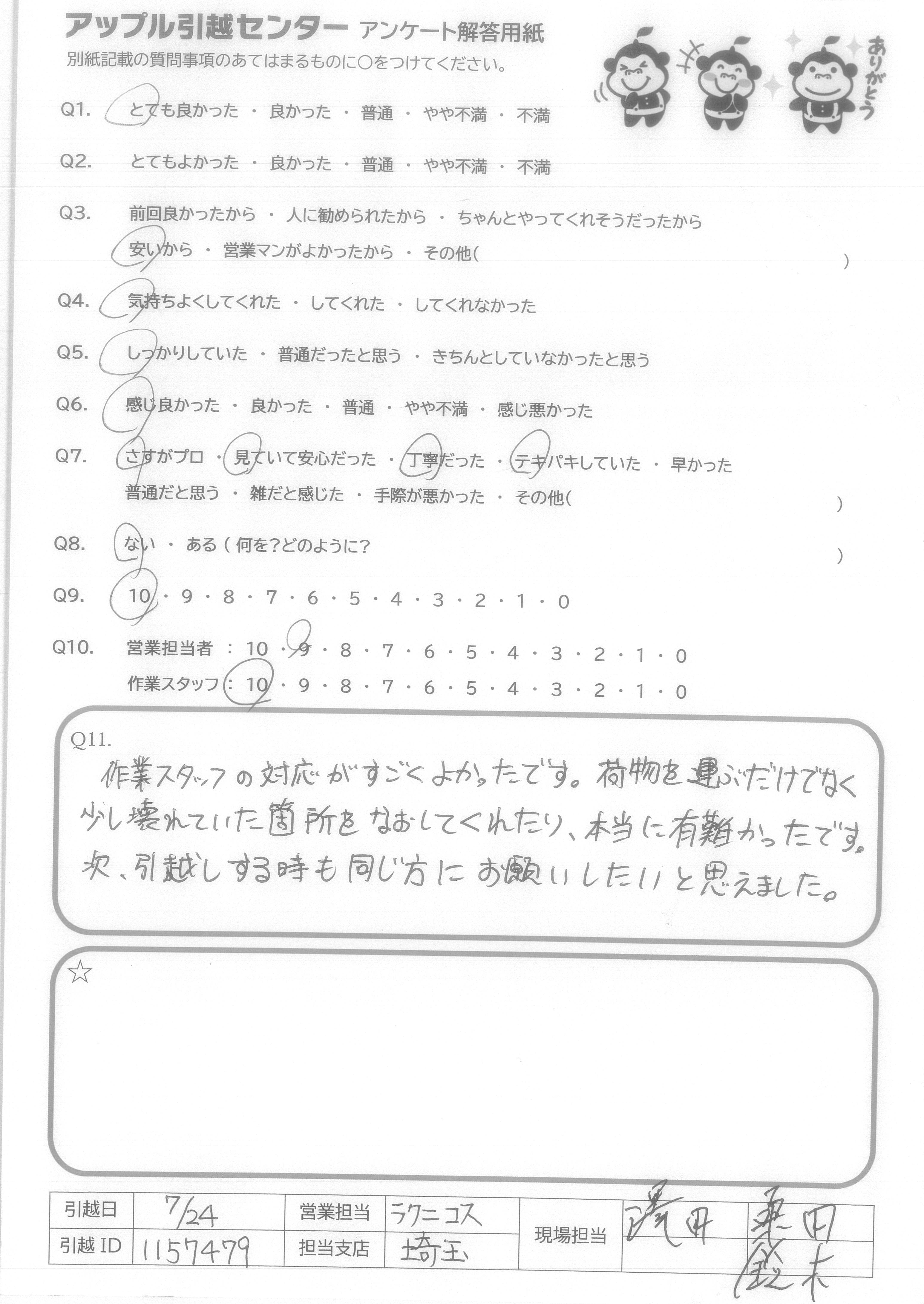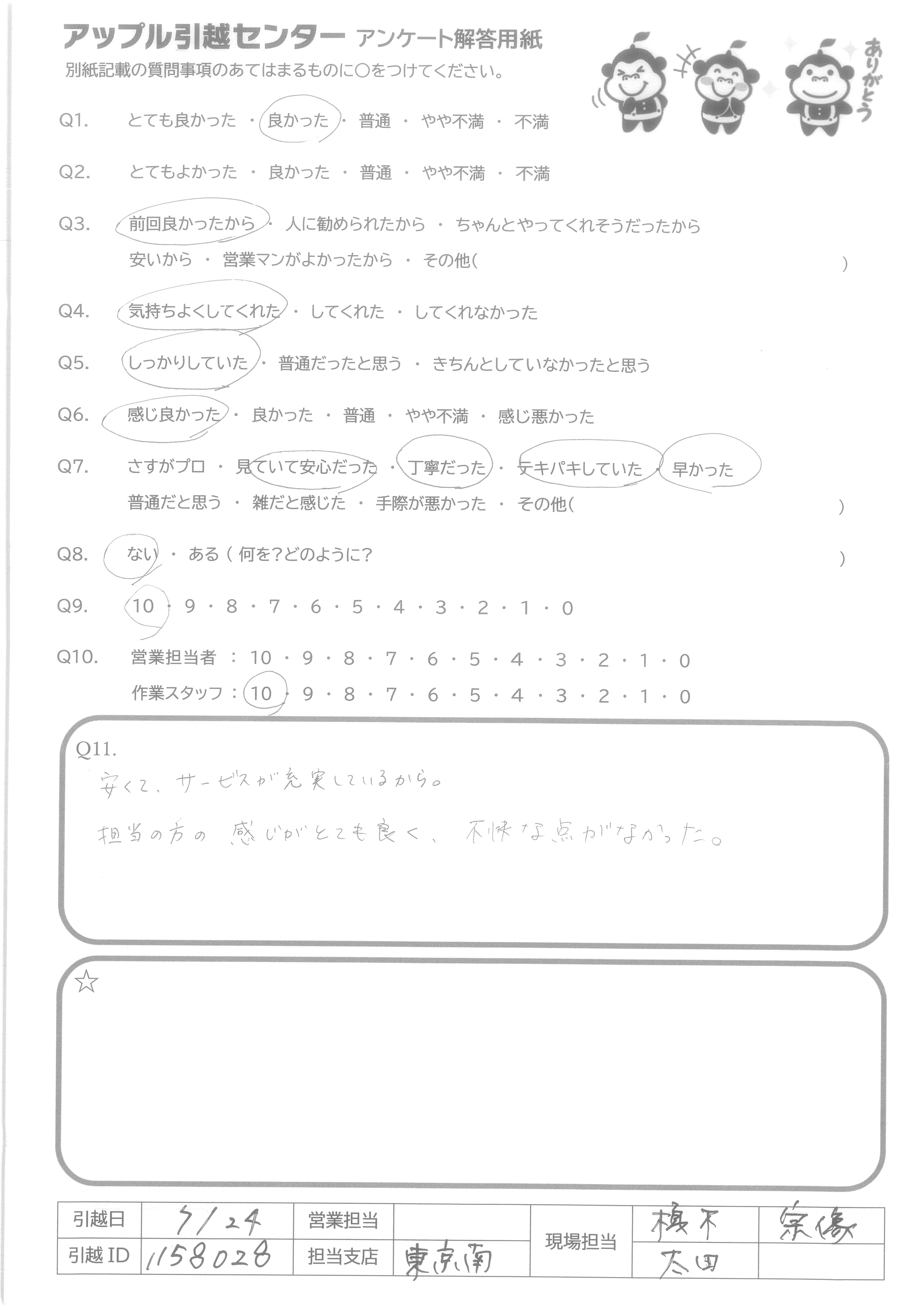 A.今まで担当して頂いた業者の中で一番良かったから 今回かなりの量と重い物が沢山ありましたが常にさわやかな笑顔で明るく対応してくれたから、とても良いスタートが切れました。本当にありがとうございました。