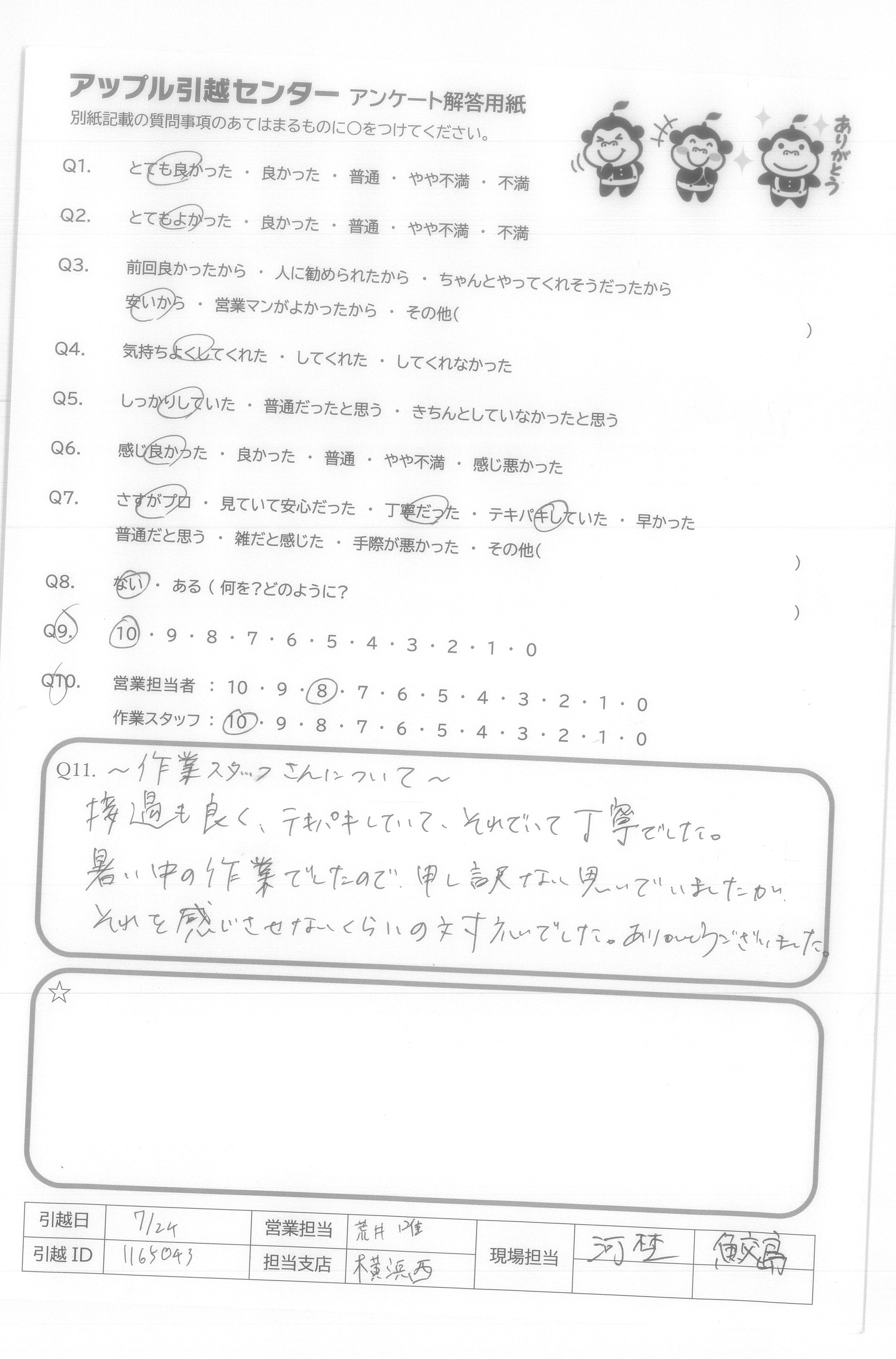 A.営業担当さんは熱意を感じました。電話連絡も早くてよかったです。 作業スタッフさん(出口さん、ミヤモトさん、クニサキさん)はとても感じがよく、IKEA家具の解体もとてもspeedyにやってくださいました。また引越しのときにはお願いしたいと思います。