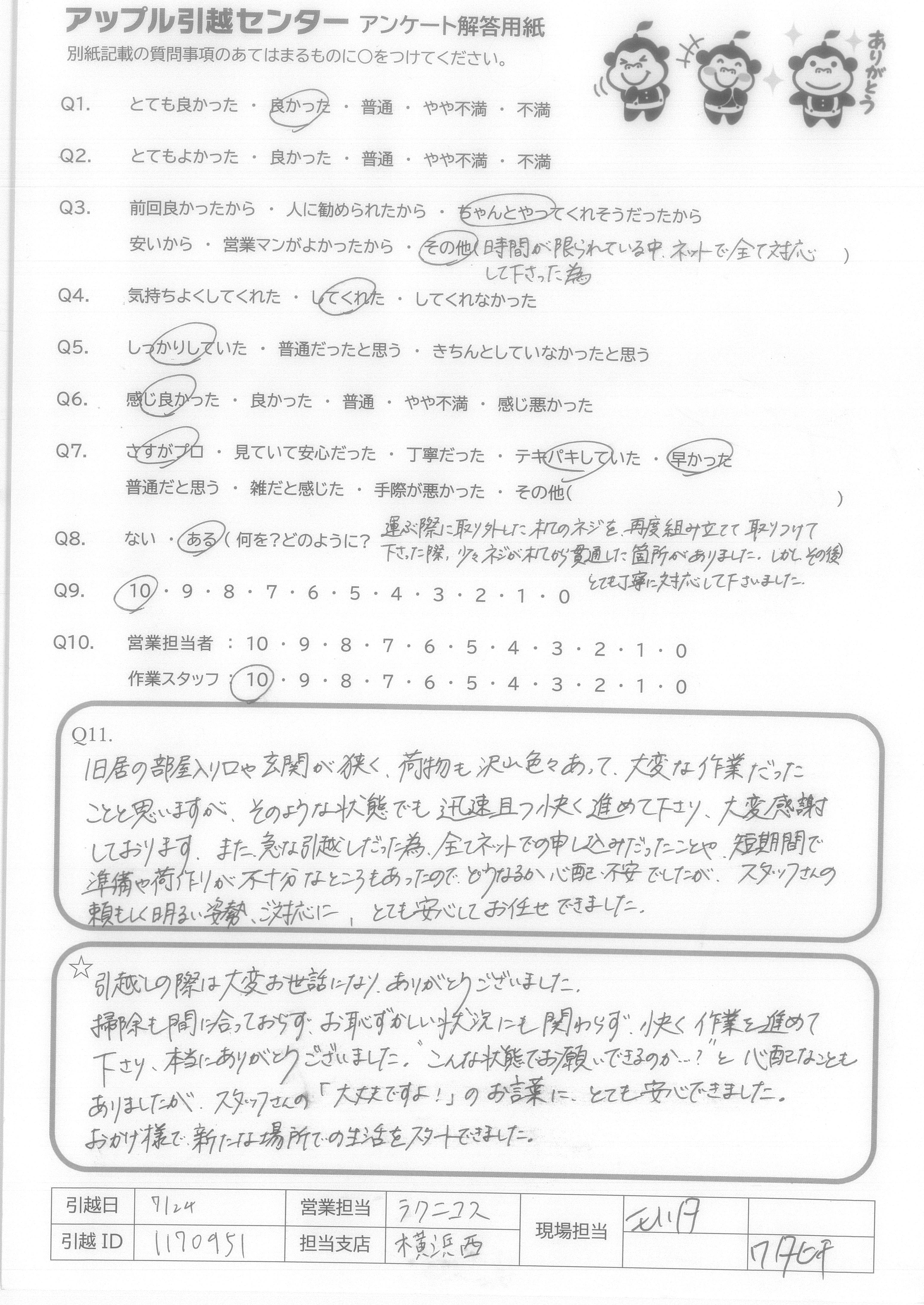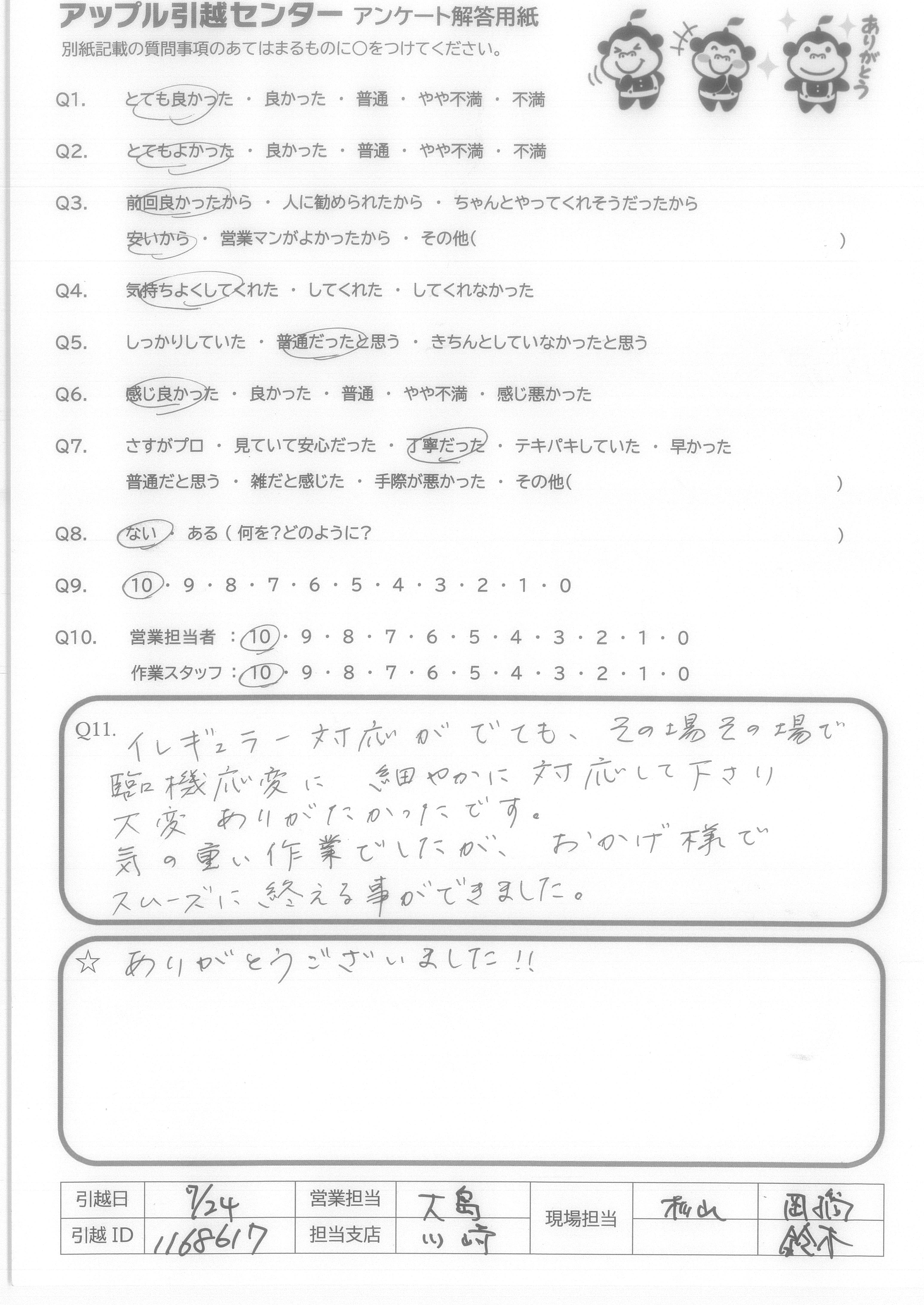 A.旧居の部屋入り口や玄関が狭く、荷物も沢山色々あって、大変な作業だったことと思いますが、そのような状態でも迅速且つ快く進めて下さり、大変感謝しております。また、急な引越しだった為、全てネットでの申し込みだったことや、短期間で準備や荷作りが不十分なところがあったので、どうなるか心配、不安でしたが、スタッフさんの頼もしく明るい姿勢、ご対応に、とても安心してお任せできました。