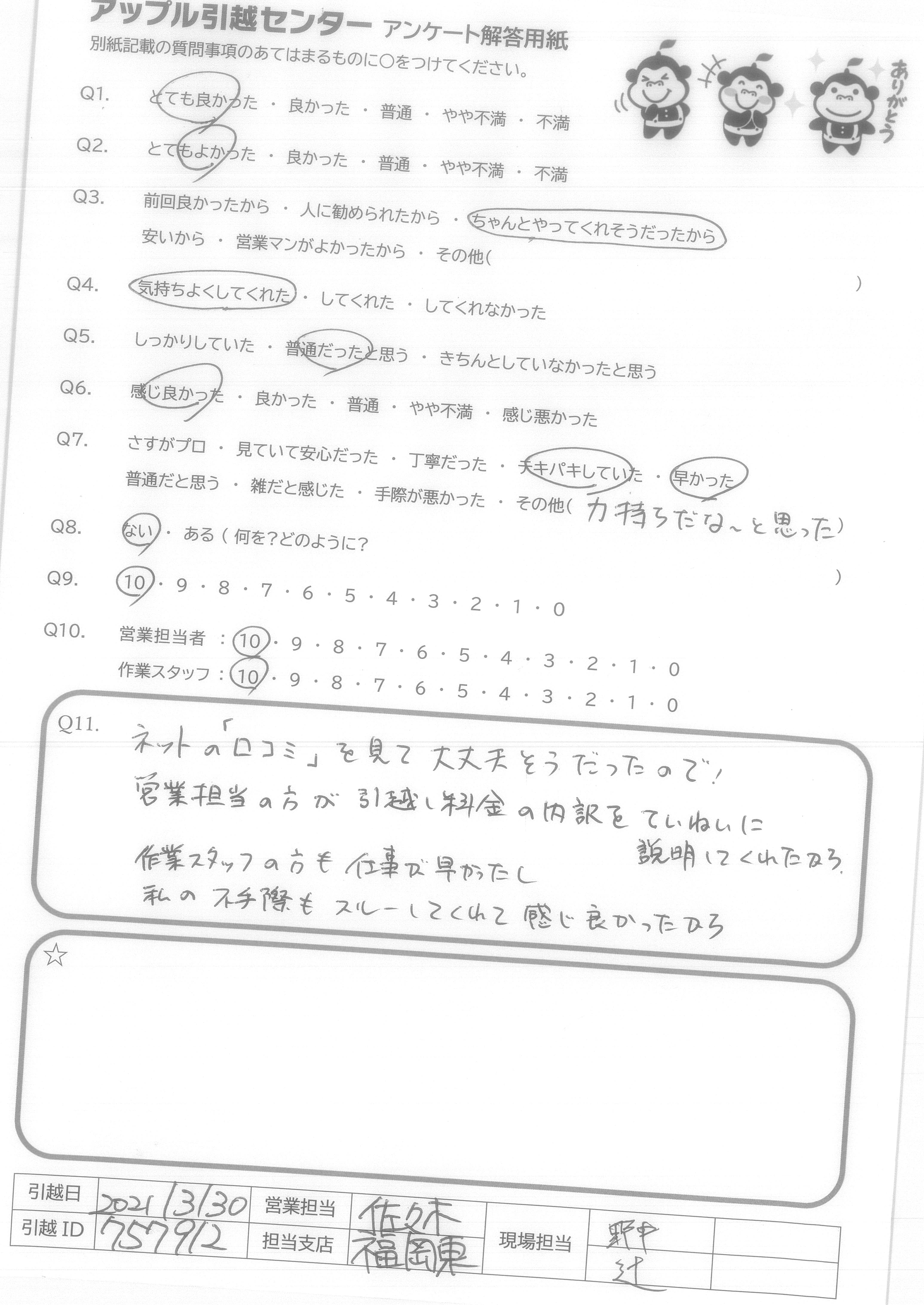 引越し日:2021年03月30日 エリア:福岡県福岡市博多区