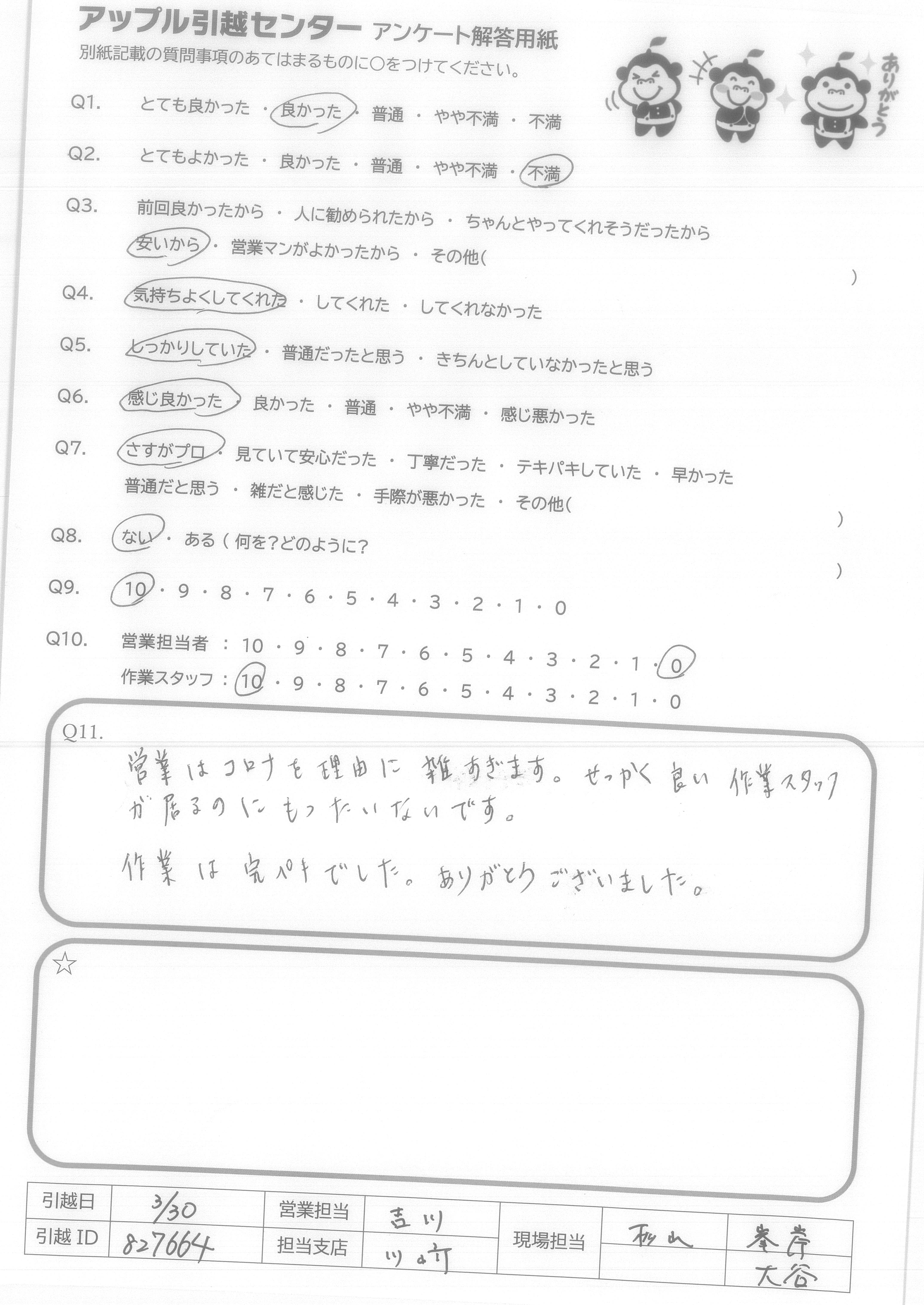 A.金額を他社と比較したところ、2万円程安く、対応された電話の方もいつも丁寧で、現場に来てくださった金子さんもとても感じが良く速やかに仕事をしてくださっていました。しかし、アルバイトの方があいさつもなく、物を壊した際の謝罪もたんく、挙句の果てに新居に行く前に帰ってしまったとのこと。結局一人での作業で時間がかかり、こちらの