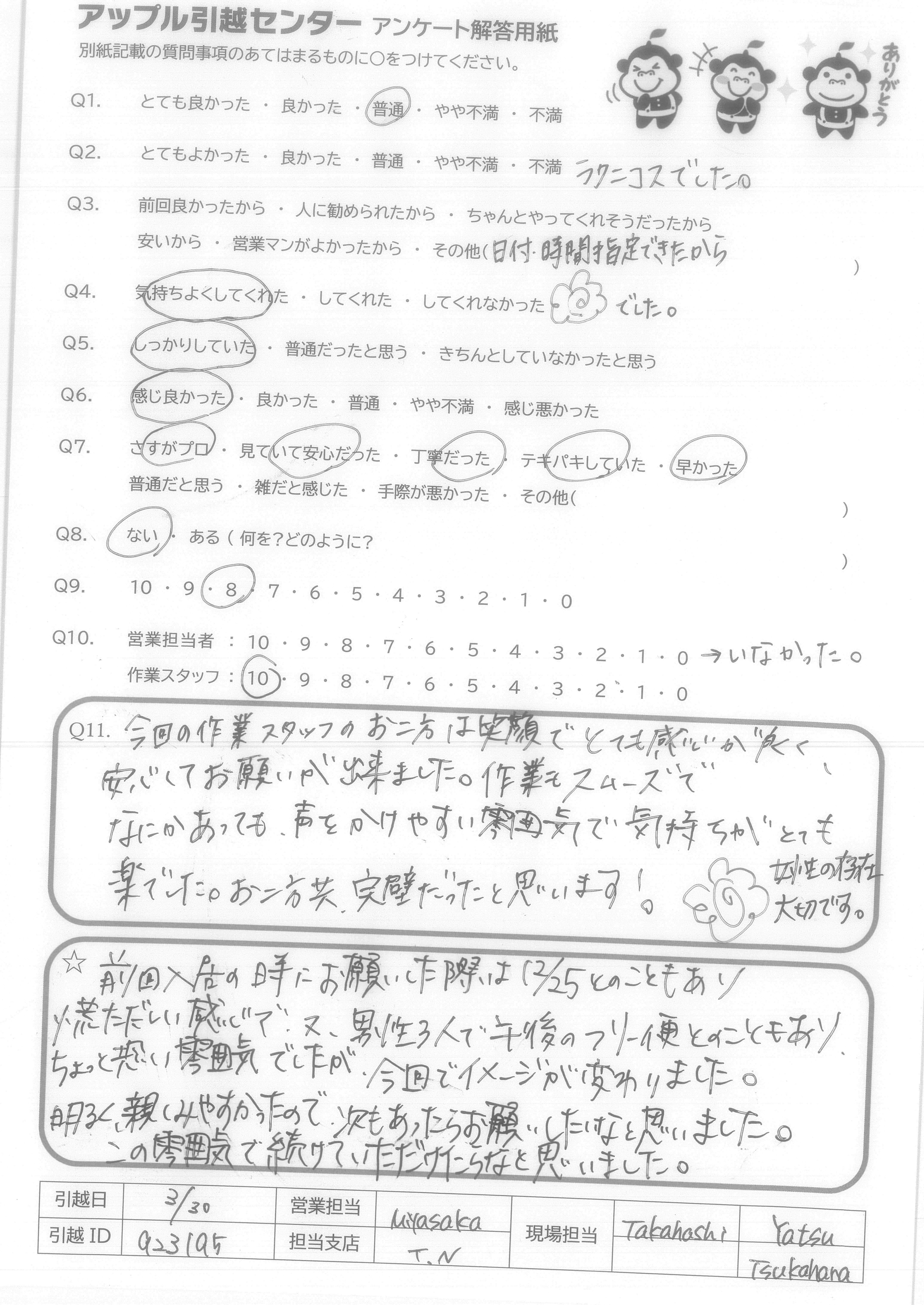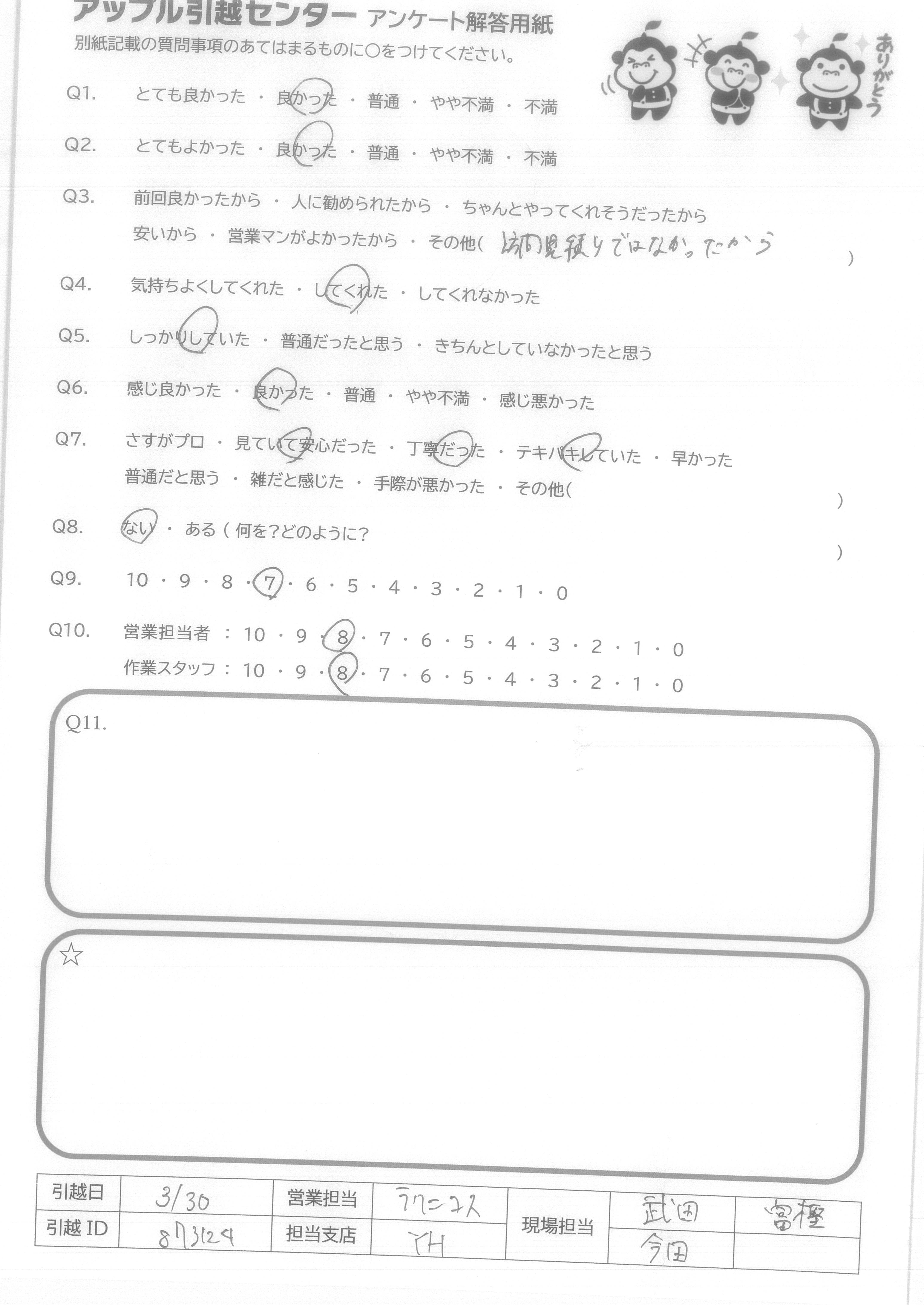 A.前回入居の時にお願いした際は12/25とのこともありあわただしい感じで、又、男性3人で午後のフリー便とのこともあり、ちょっと恐い雰囲気でしたが、今回でイメージが変わりました。 明るく、親しみやすかったので、次もあったらお願いしたいなと思いました。この雰囲気で続けていただけたらなと思いました。
