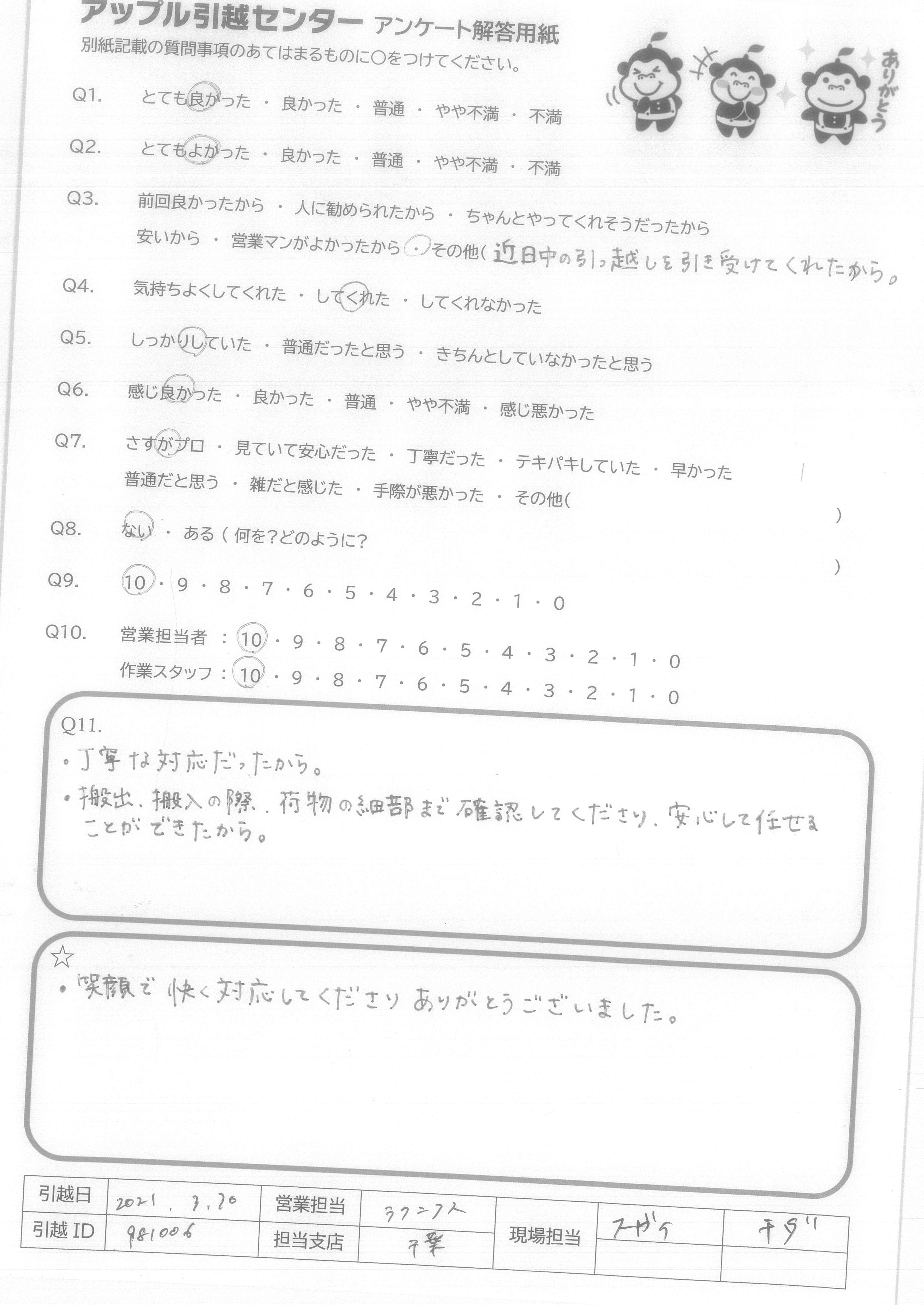 引越し日:2021年03月30日 エリア:千葉県我孫子市