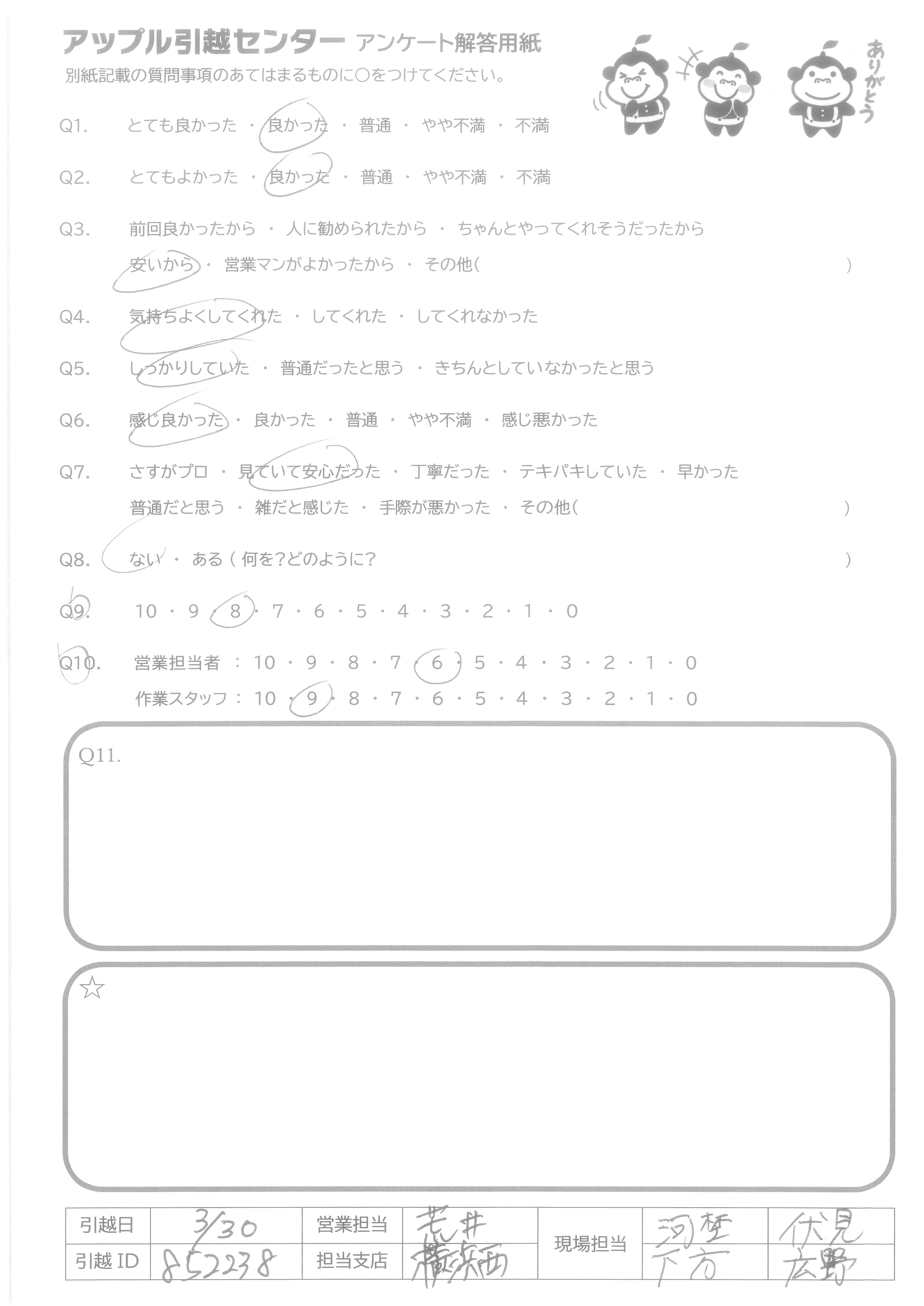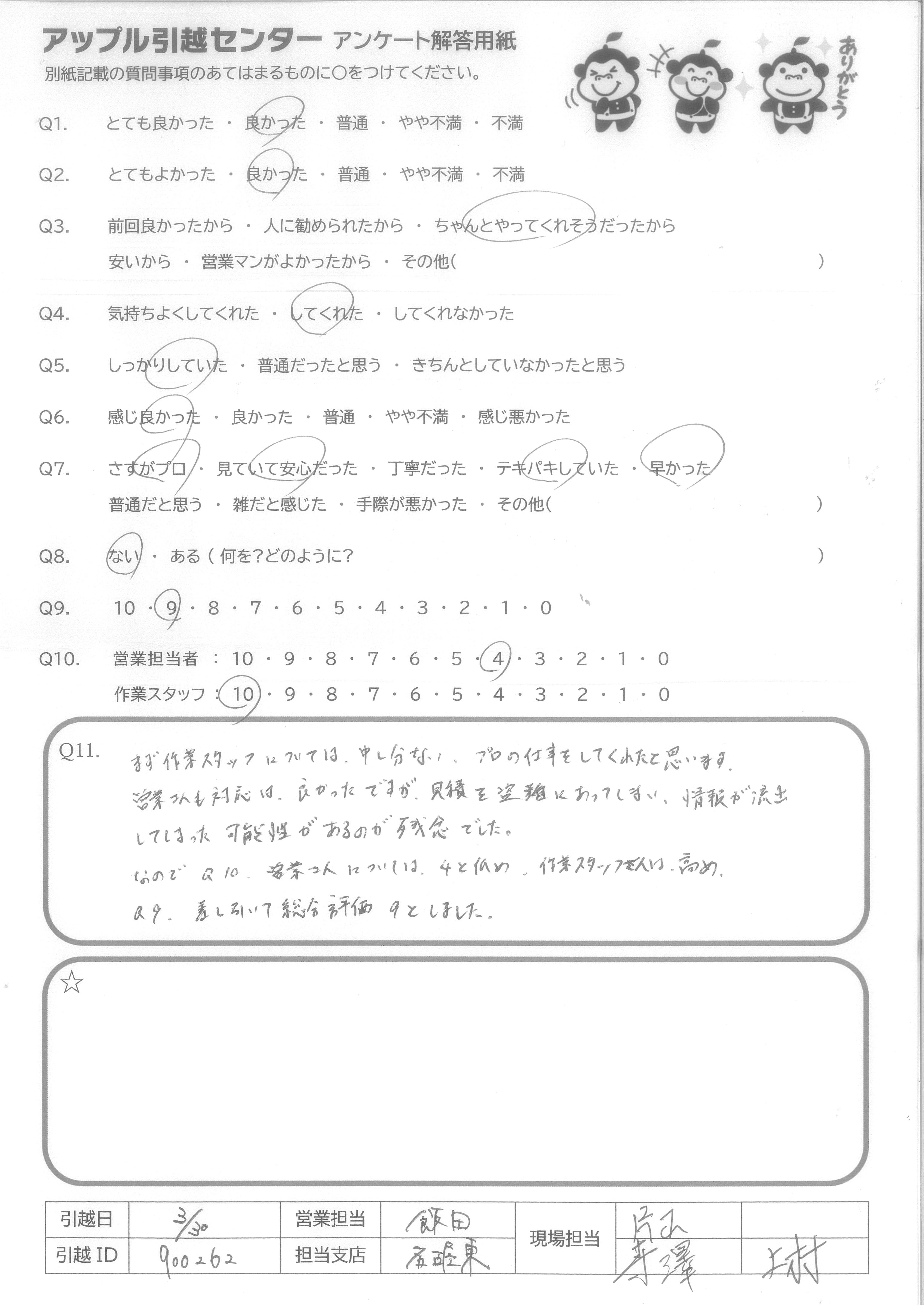 A.引越しの時間が予定より遅くなってしまったのですが、1人が体調不良でお1人で作業されていたと聞き大変だなと思いました。 ガスの開栓があったのでカギの返却をお願いしたのですが、安心してお願いできました。ネットでの申込みの時点でも問合せにすぐ対応して頂き、メールでも社長の想いが伝わってきたのでここにしました!!