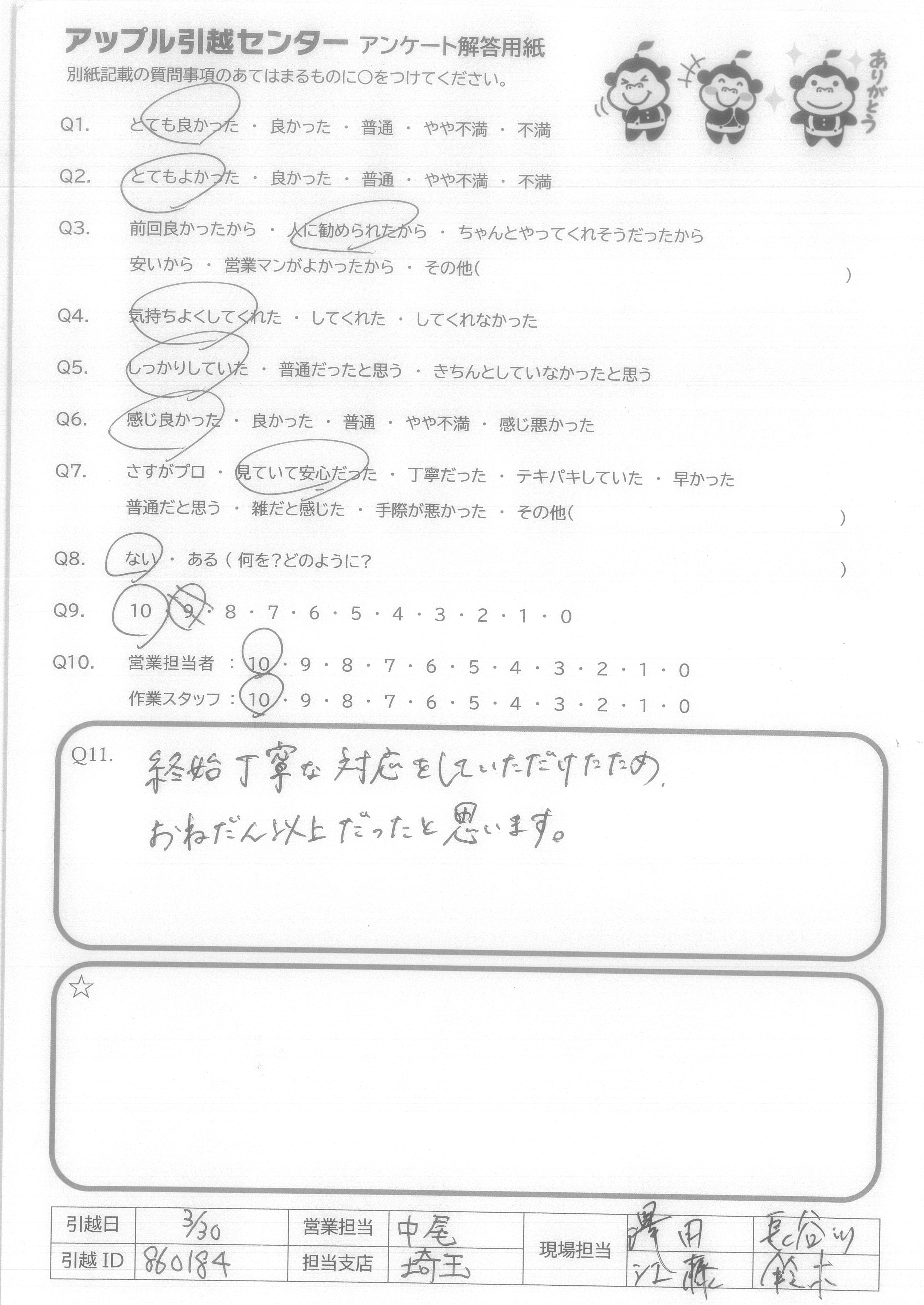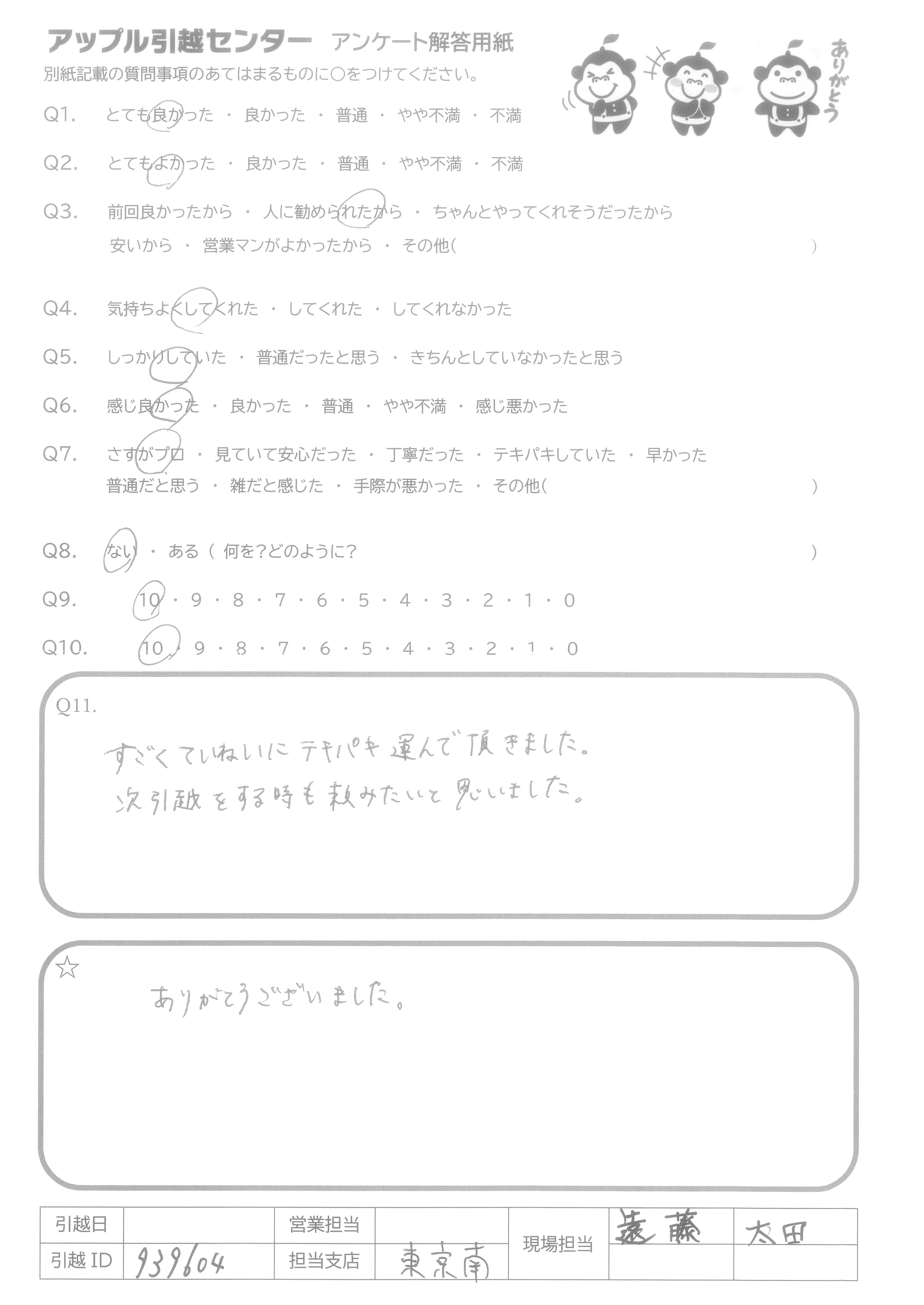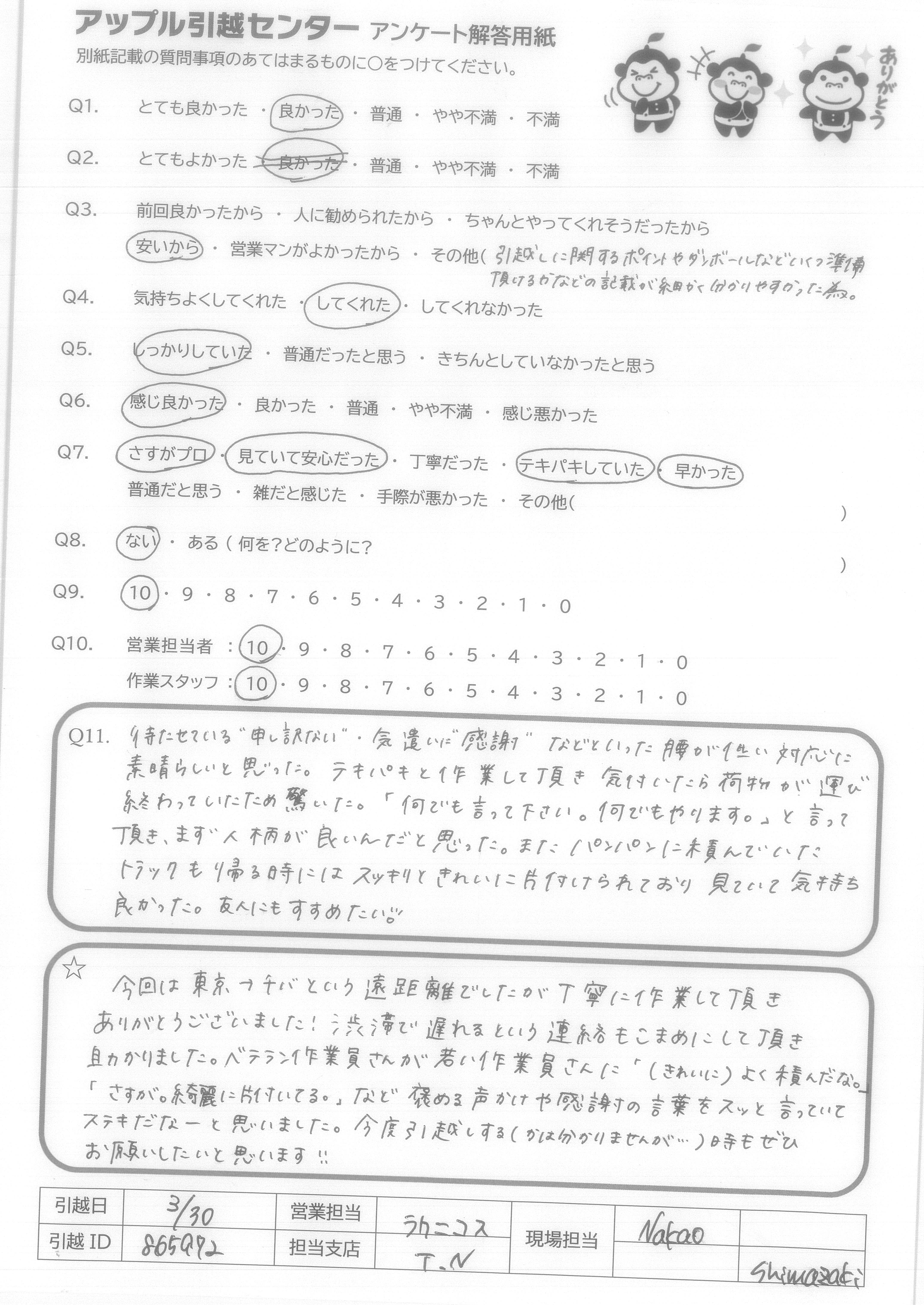 A.今回は東京→チバという遠距離でしたが丁寧に作業して頂きありがとうございました!渋滞で遅れるという連絡もこまめにして頂き、助かりました。ベテラン作業員さんが若い作業員さんに「(きれいに)よく積んだな。」「さすが。キレイに片付いてる。」など褒める声かけや感謝の言葉をスッと言っていてステキだなーと思いました。今度引越しする(かは分かりませんが・・・)時もぜひお願いしたいと思います!!