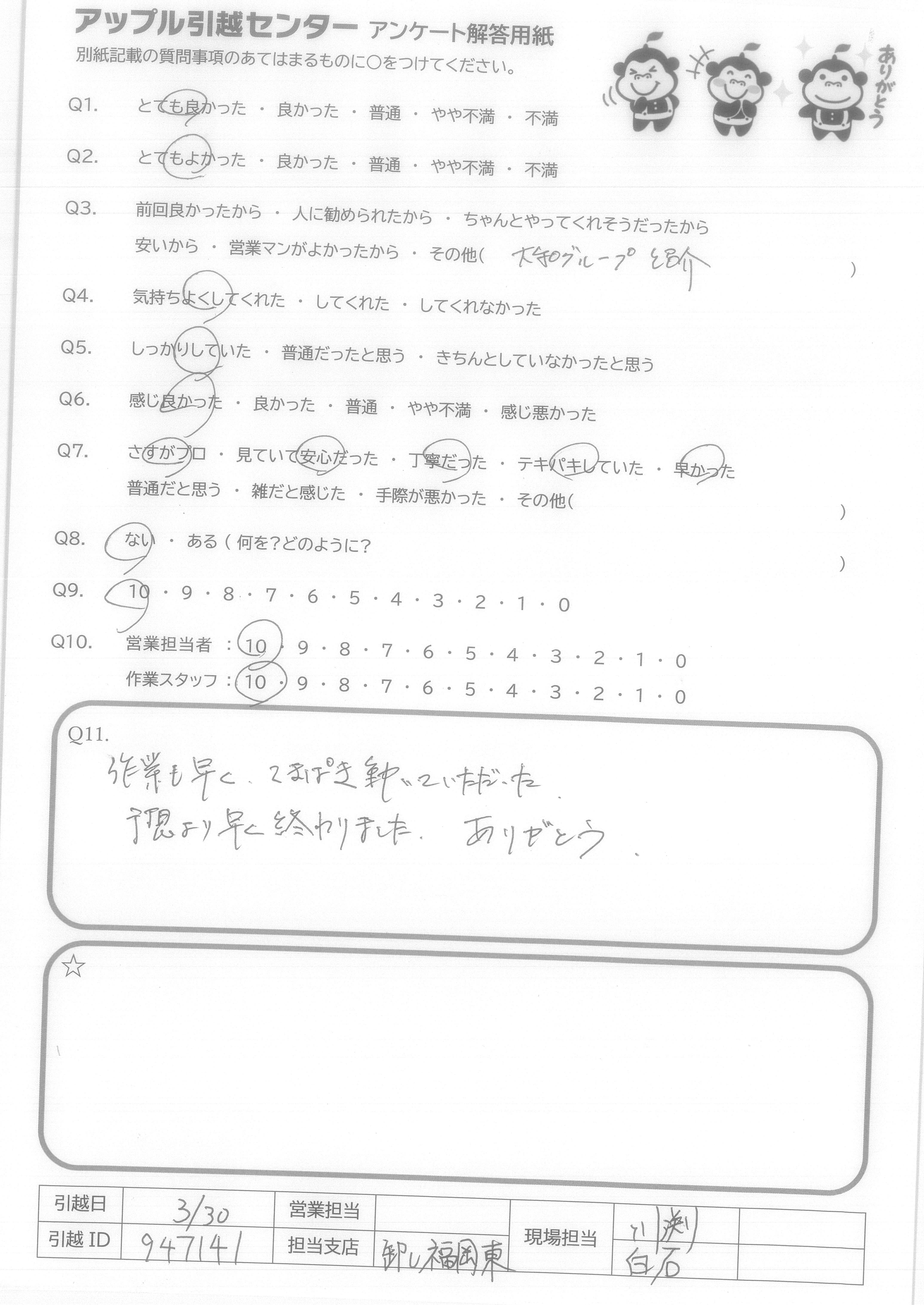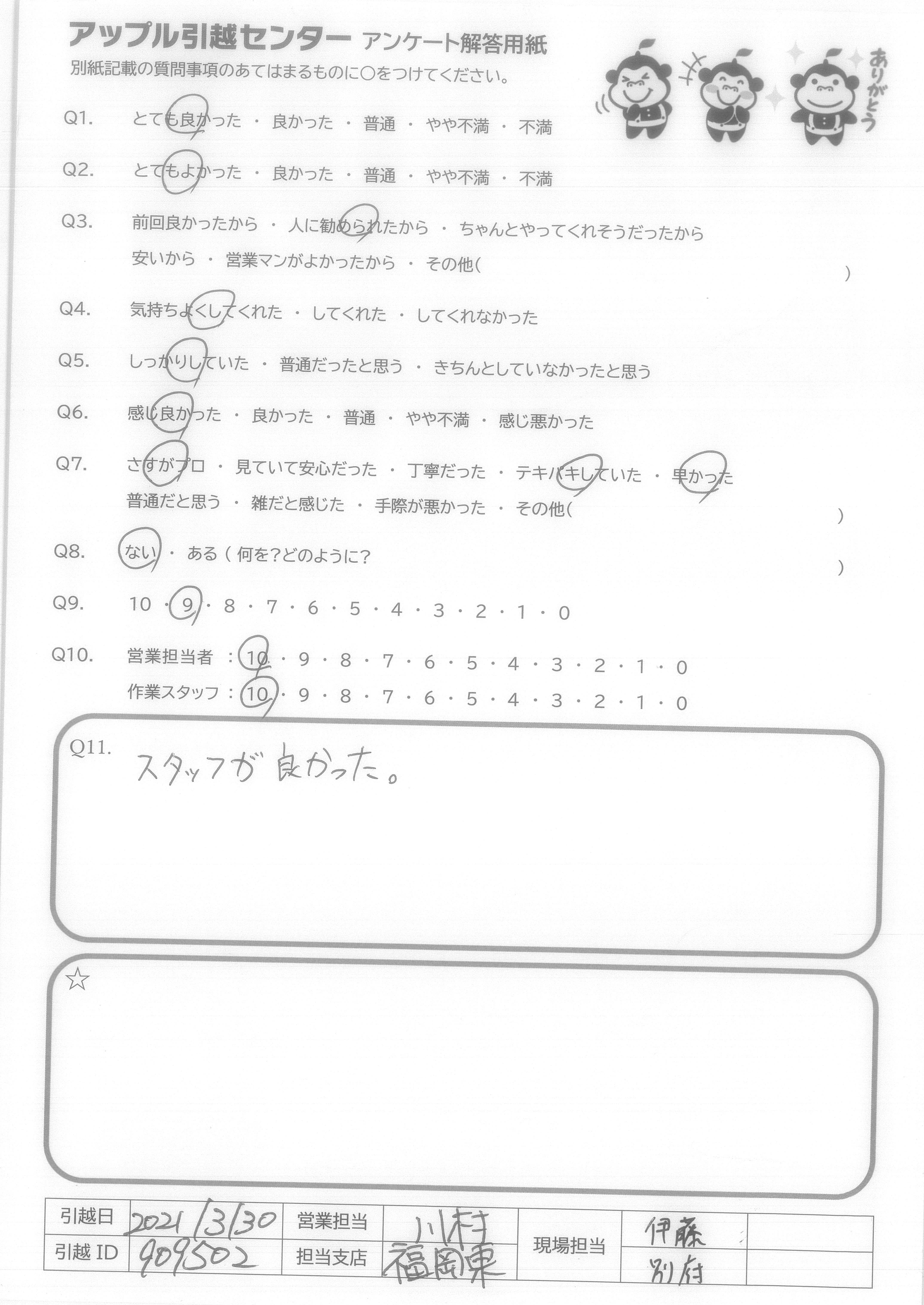 引越し日:2021年03月30日 エリア:福岡県福岡市東区