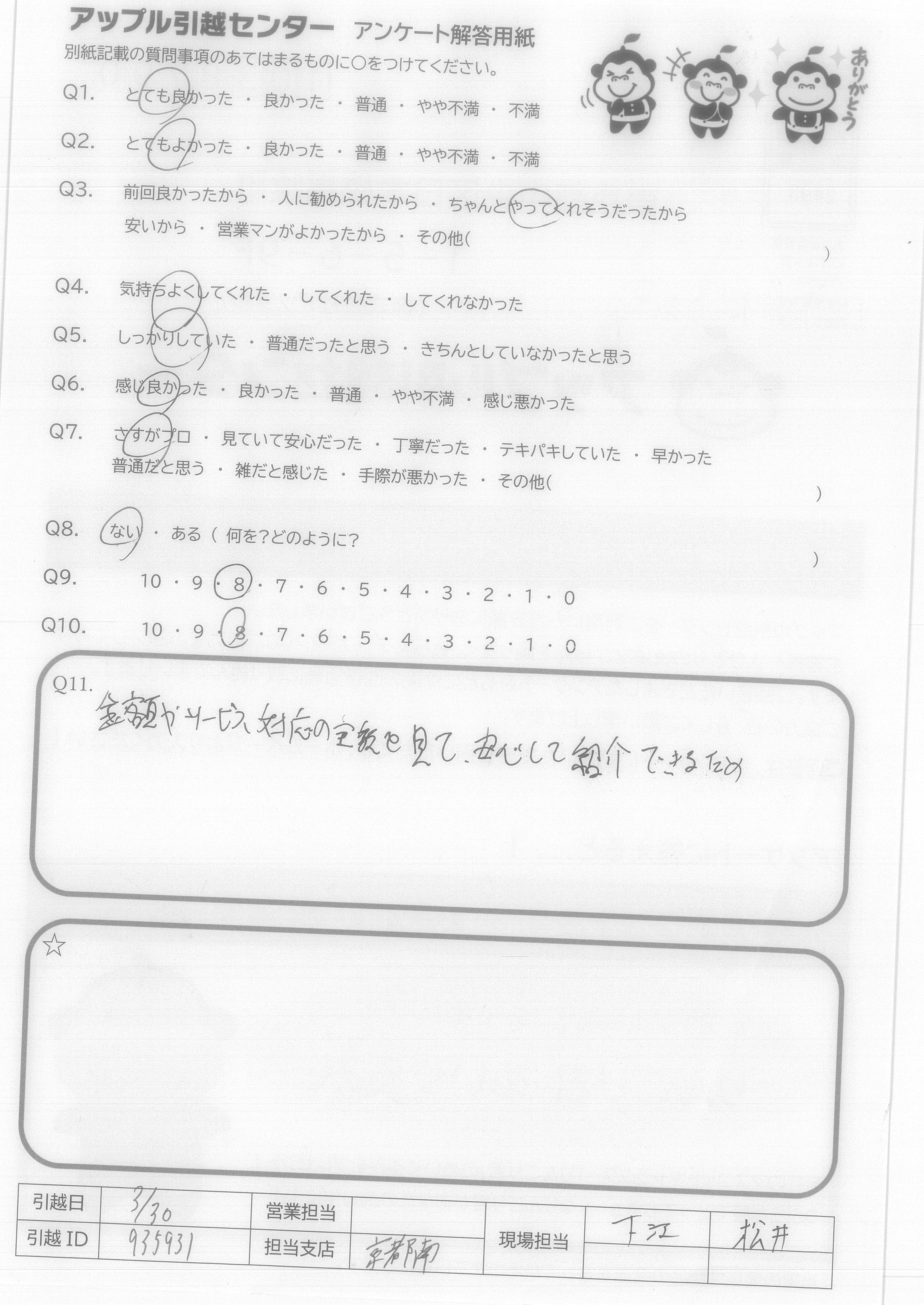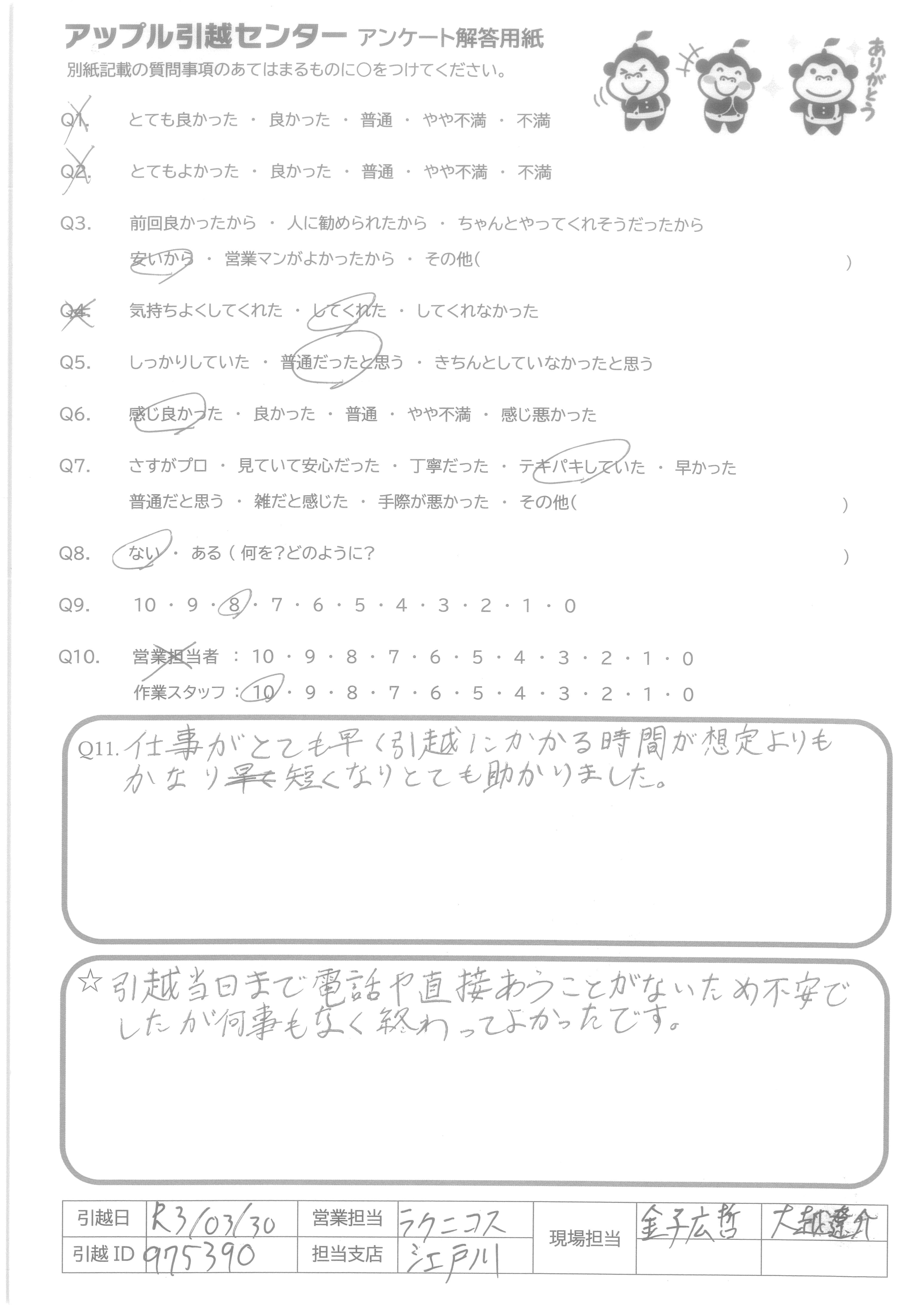 A.仕事がとても早く引越にかかる時間が想定よりもかなり短くなりとても助かりました。