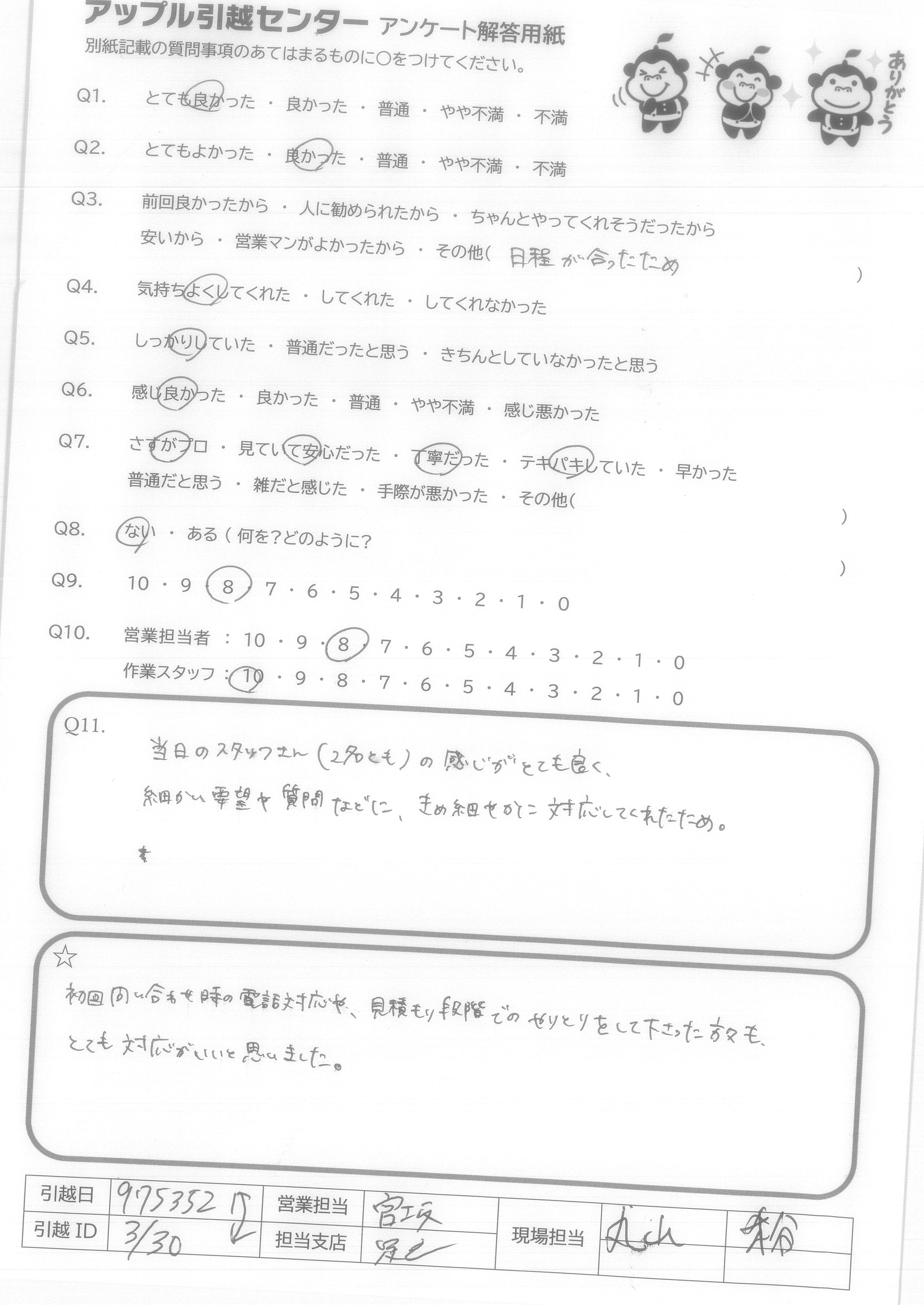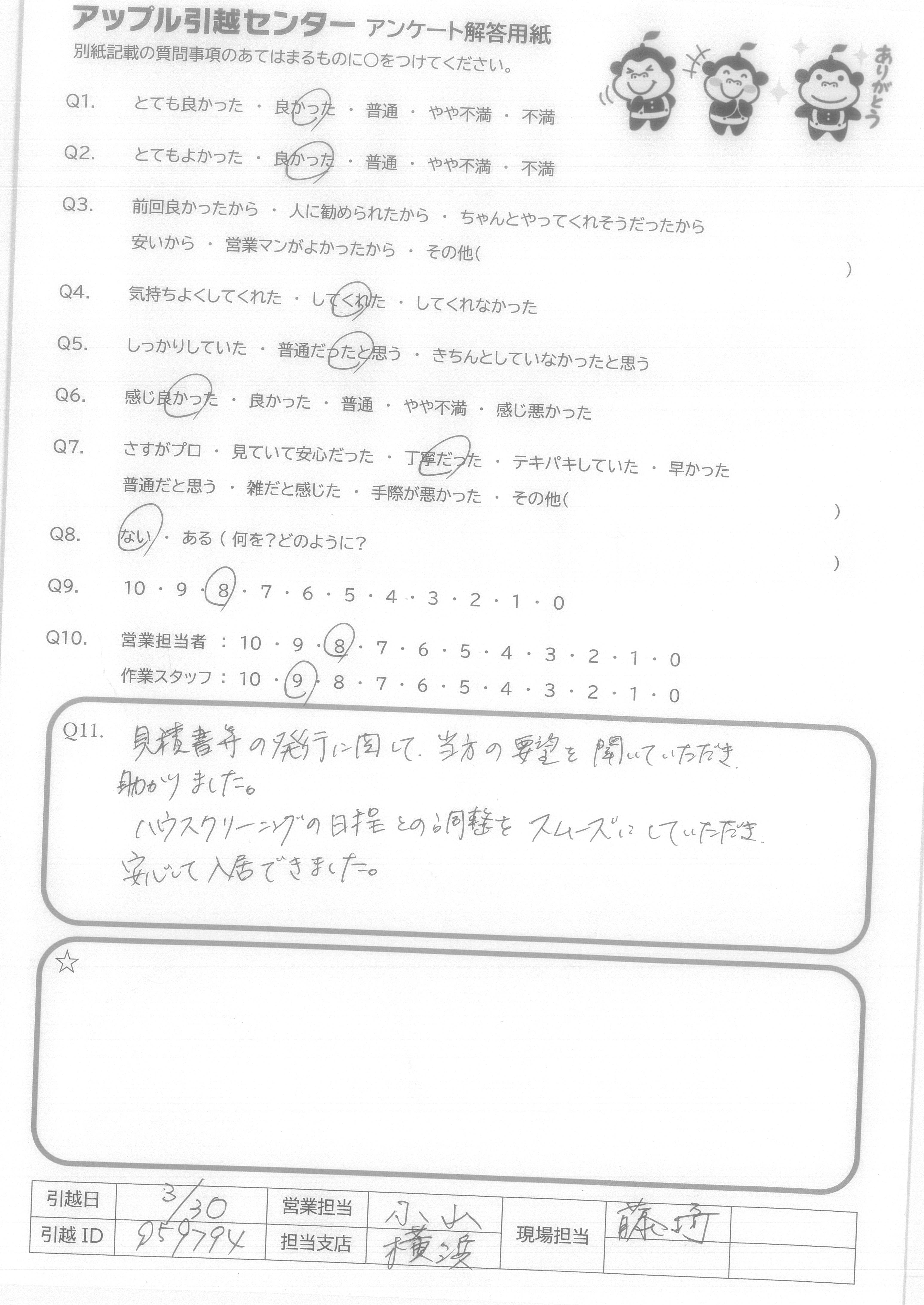 A.見積書等の発行に関して、当方の要望を聞いていただき助かりました。ハウスクリーニングの日程との調整をスムーズにしていただき安心して入居できました。