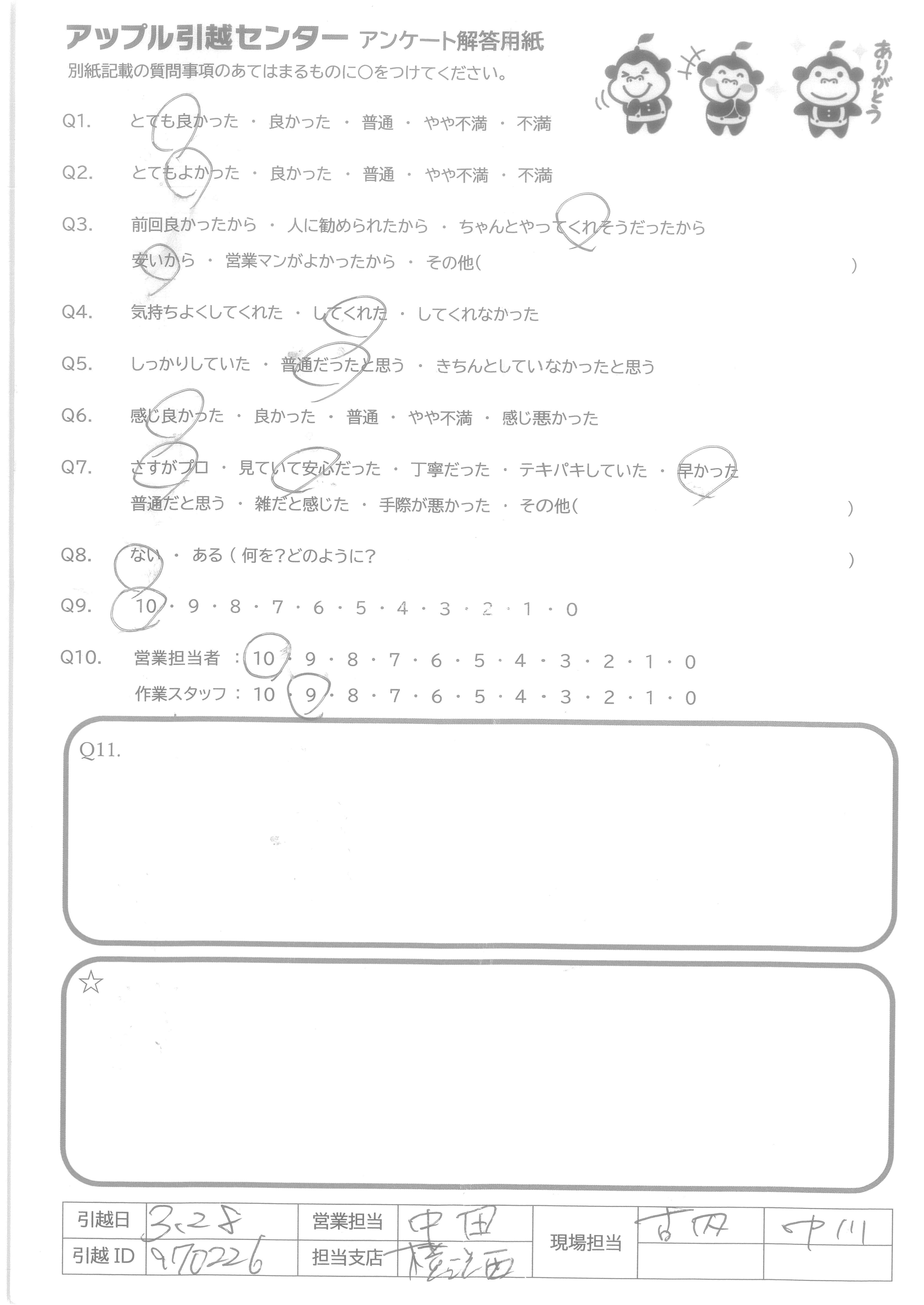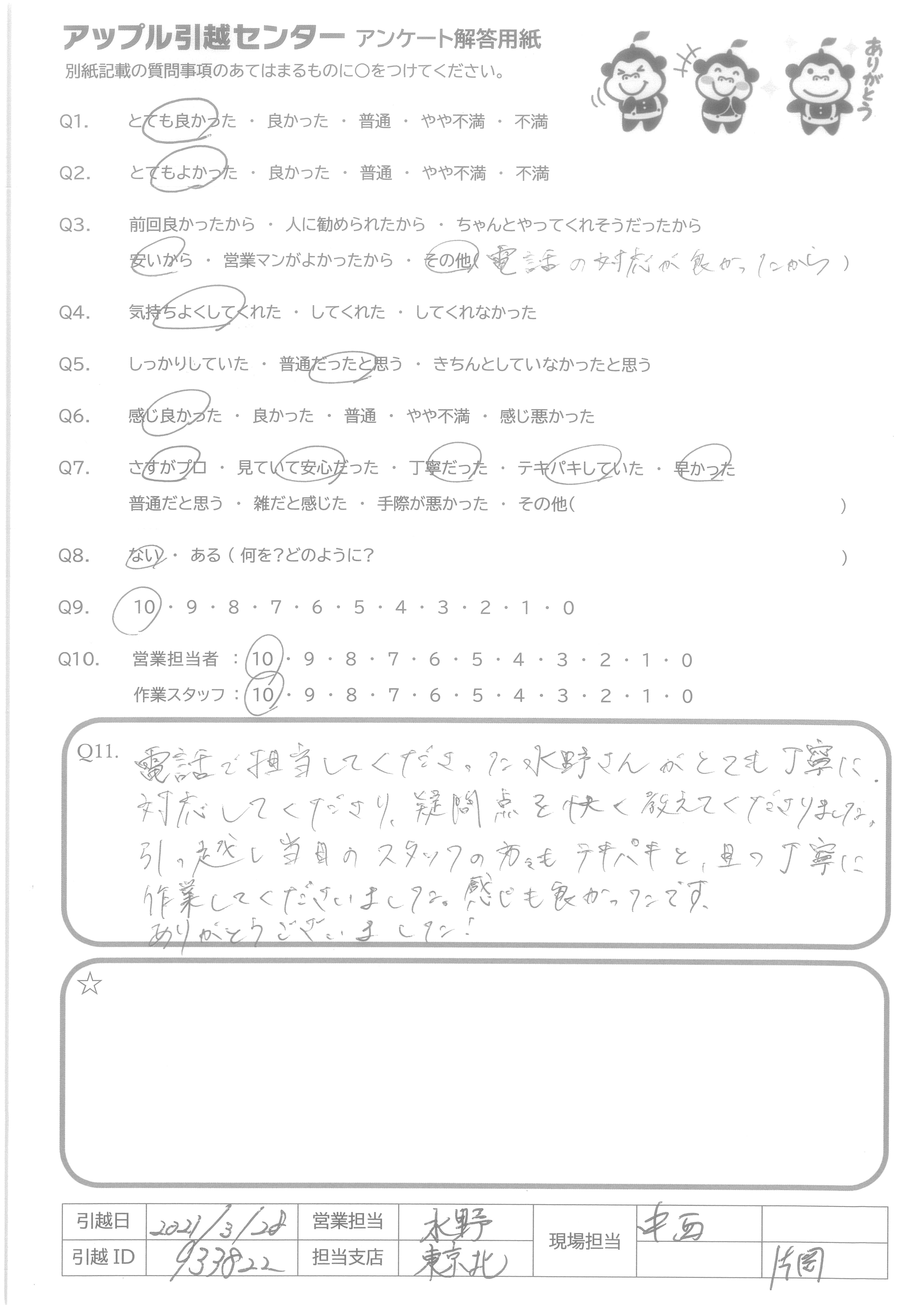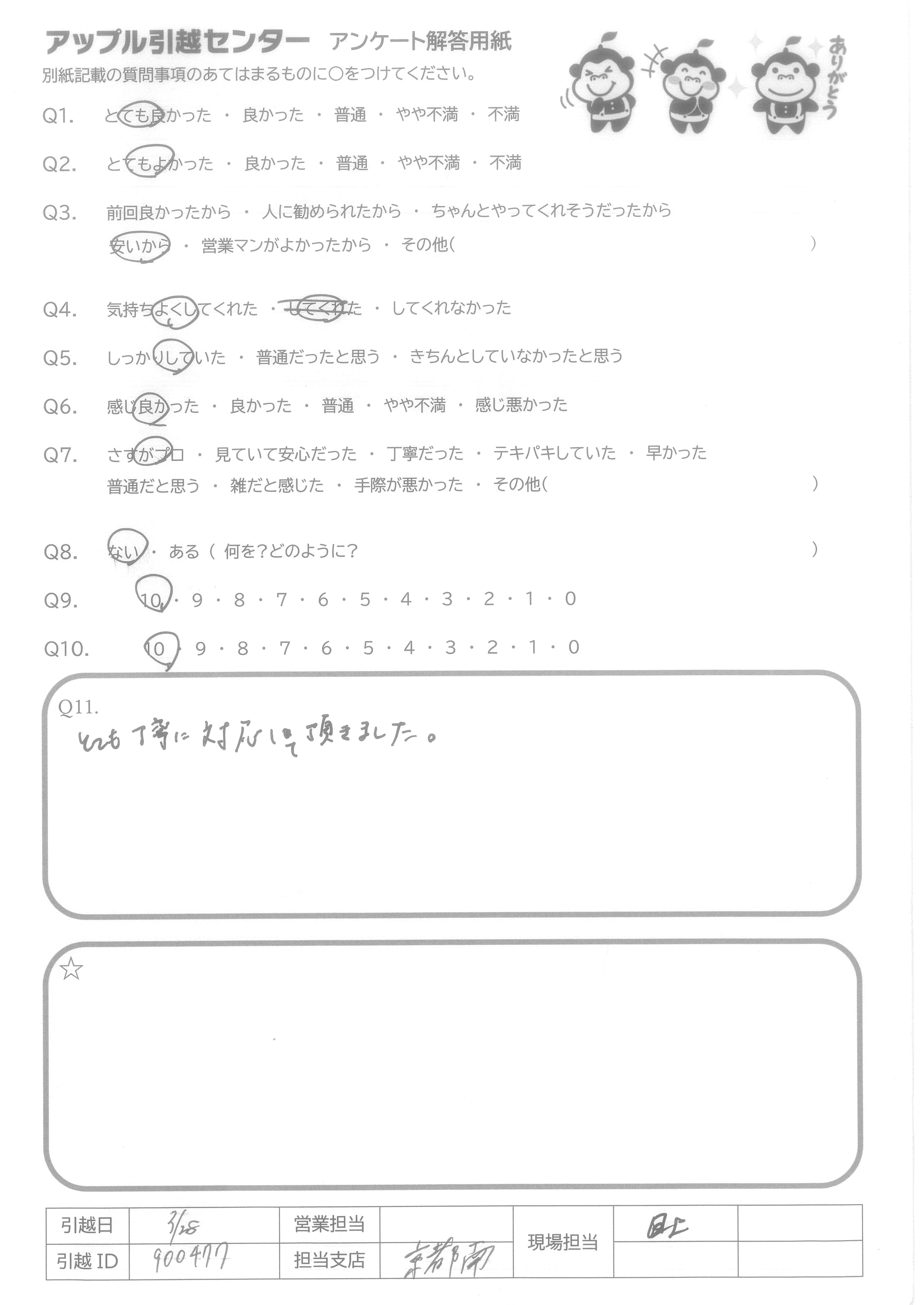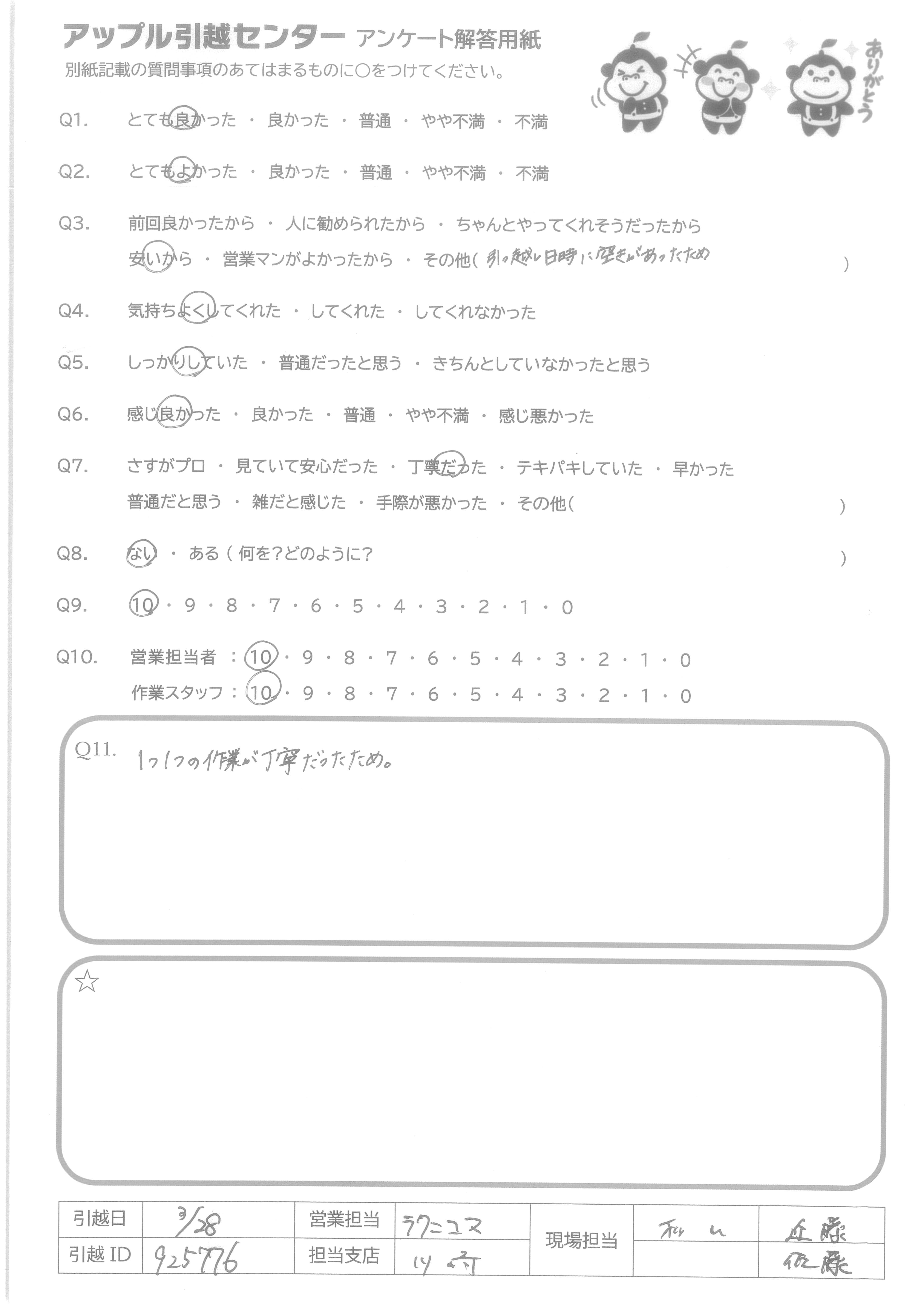 A.電話で担当してくださった水野さんがとても丁寧に対応してくださり、疑問点を快く教えてくださりました。引っ越し当日のスタッフの方もテキパキと、且つ丁寧に作業してくださいました。感じも良かったです。ありがとうございました!