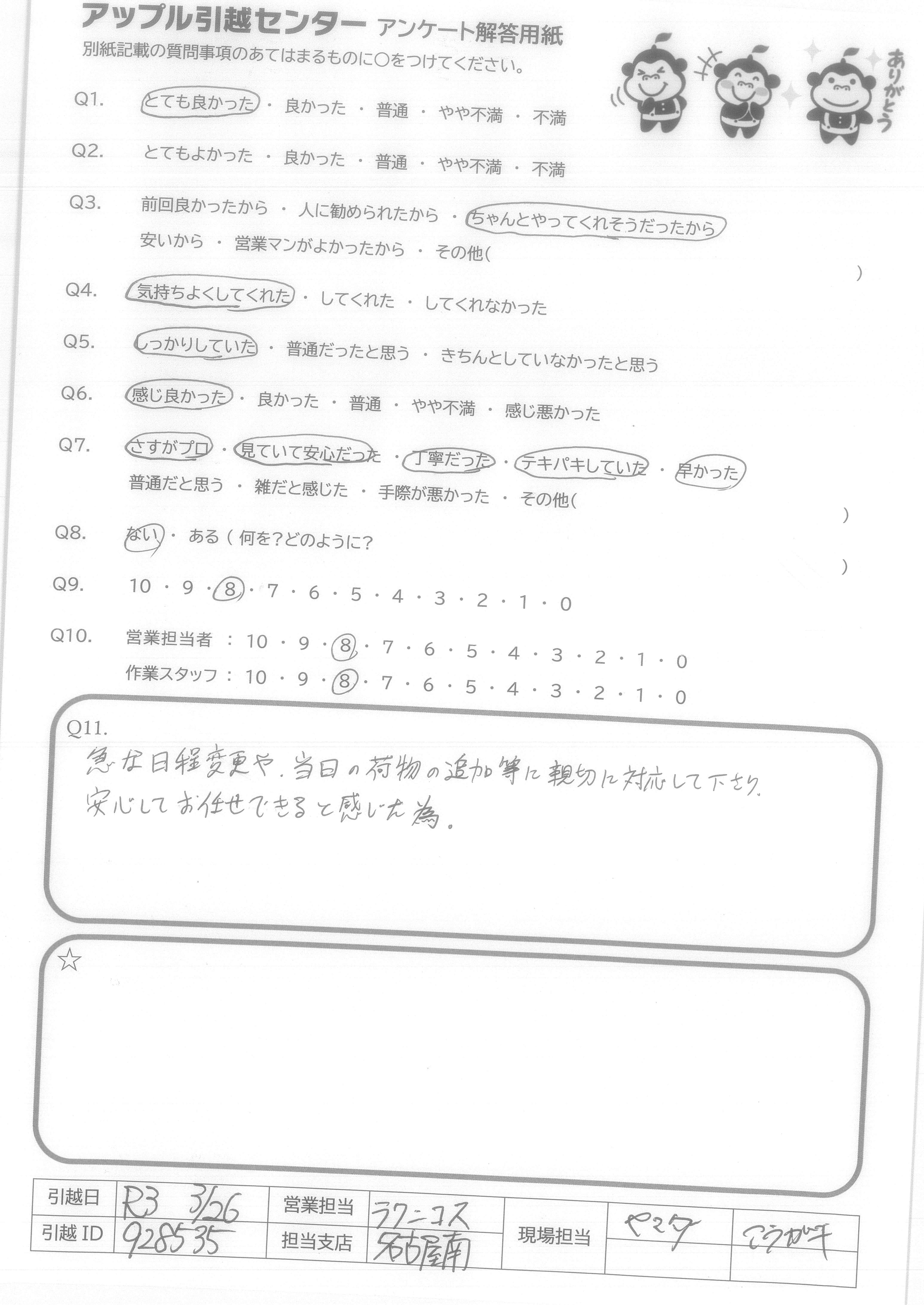 A.した私だけにでなくみんなにさわやかに接して下さり、良い雰囲気の引越しをありがとうございました。 また引越しをするときはお願いします。