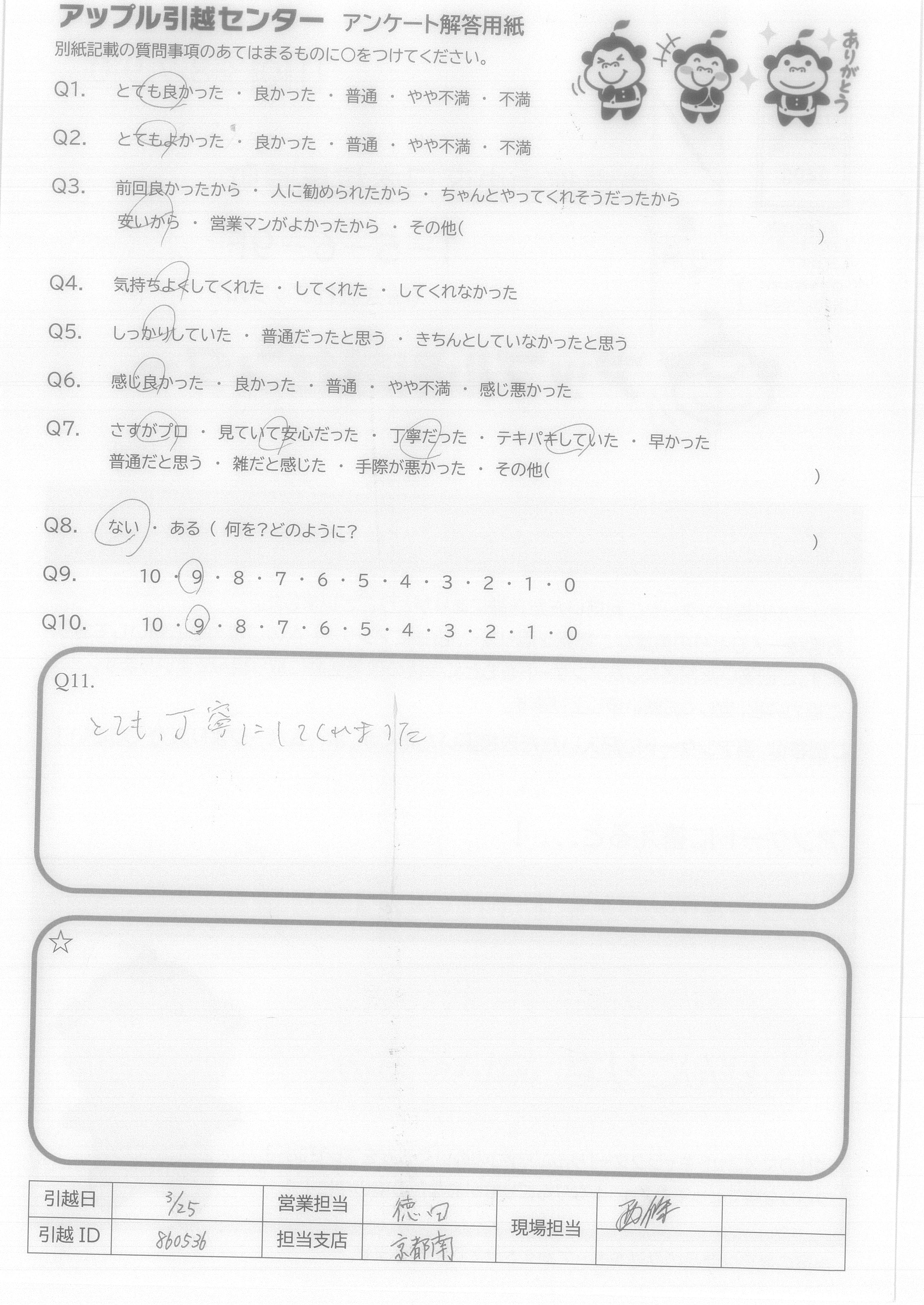 A.メイン担当の石坂さんは感じよく声かけなど気を付かってくれ、話しやすく、頼みやすかった。 満点にできないのはワゴンのキズと冷蔵庫の裏がホコリのまま搬出されそうでびっくりした。(アラガキさん)