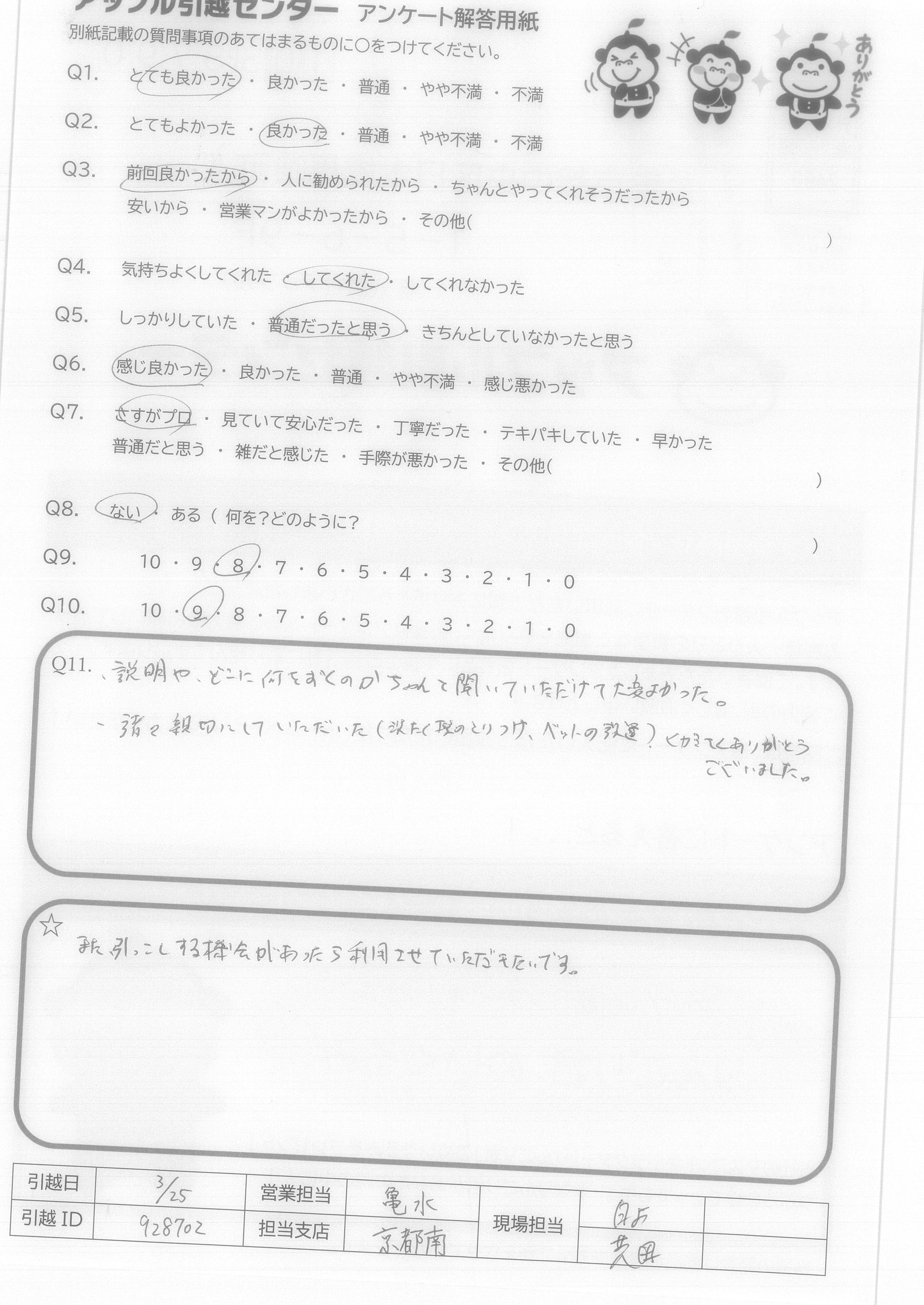 A.まだ詰めなければいけないものなど、その場で梱包してくれたり大量の荷物を素早く丁寧に運搬してくれたりしたので。ご対応本当に有難うございました。